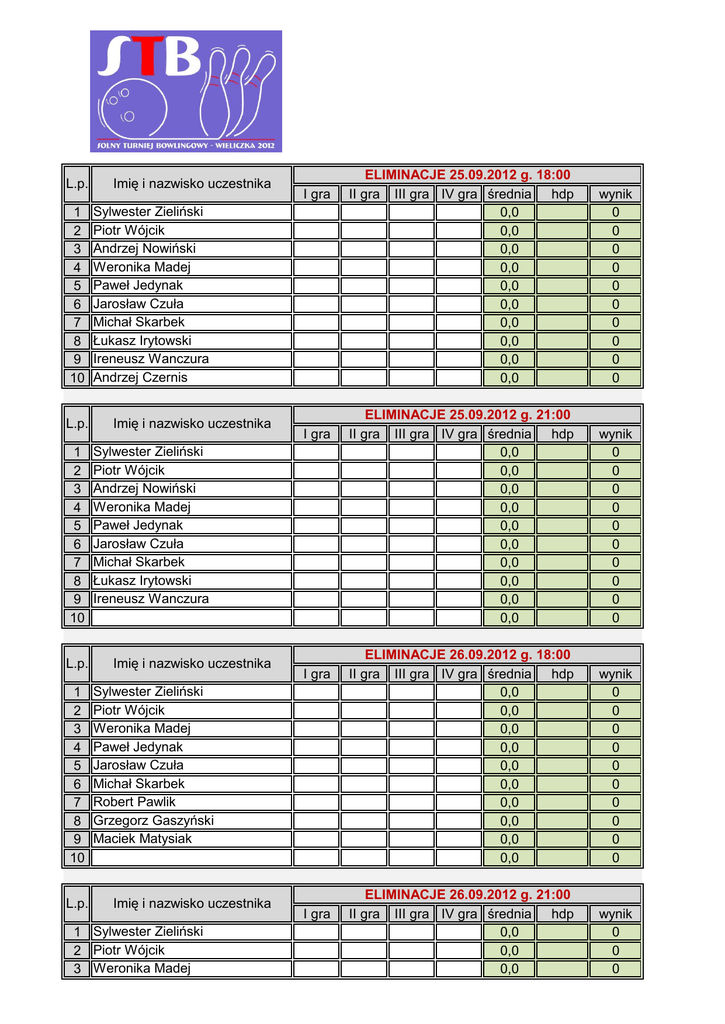 L.p. 1 2 3 4 5 6 7 8 9 10 L.p. 1 2 3 4 5 6 7 8 9 10 L.p. 1 2 3 4 5 6 7 8 9 10 L.p. Imię i nazwisko uczestnika I gra Sylwester Zieliński Piotr Wójcik Andrzej Nowiński Weronika Madej Paweł Jedynak Jarosław Czuła Michał Skarbek Łukasz Irytowski Ireneusz Wanczura Andrzej Czernis Imię i nazwisko uczestnika I gra Sylwester Zieliński Piotr Wójcik Andrzej Nowiński Weronika Madej Paweł Jedynak Jarosław Czuła Michał Skarbek Łukasz Irytowski Ireneusz Wanczura Imię i nazwisko uczestnika I gra Sylwester Zieliński Piotr Wójcik Weronika Madej Paweł Jedynak Jarosław Czuła Michał Skarbek Robert Pawlik Grzegorz Gaszyński Maciek Matysiak Imię i nazwisko uczestnika 1 Sylwester Zieliński 2 Piotr Wójcik 3 Weronika Madej I gra ELIMINACJE 25.09.2012 g. 18:00 II gra III gra IV gra średnia hdp 0,0 0,0 0,0 0,0 0,0 0,0 0,0 0,0 0,0 0,0 wynik 0 0 0 0 0 0 0 0 0 0 ELIMINACJE 25.09.2012 g. 21:00 II gra III gra IV gra średnia hdp 0,0 0,0 0,0 0,0 0,0 0,0 0,0 0,0 0,0 0,0 wynik 0 0 0 0 0 0 0 0 0 0 ELIMINACJE 26.09.2012 g. 18:00 II gra III gra IV gra średnia hdp 0,0 0,0 0,0 0,0 0,0 0,0 0,0 0,0 0,0 0,0 wynik 0 0 0 0 0 0 0 0 0 0 ELIMINACJE 26.09.2012 g. 21:00 II gra III gra IV gra średnia hdp 0,0 0,0 0,0 wynik 0 0 0 4 5 6 7 8 9 10 L.p. 1 2 3 4 5 6 7 8 9 10 L.p. 1 2 3 4 5 6 7 8 9 10 L.p. 1 2 3 4 5 6 7 8 9 10 L.p. Paweł Jedynak Jarosław Czuła Michał Skarbek Robert Pawlik Grzegorz Gaszyński Maciek Matysiak Imię i nazwisko uczestnika 0,0 0,0 0,0 0,0 0,0 0,0 0,0 ELIMINACJE 28.09.2012 g. 18:00 II gra III gra IV gra średnia hdp 0,0 0 0,0 0 0,0 0 0,0 0 0,0 0 0,0 0 0,0 0 0,0 0 0,0 0 0,0 0 wynik 0 0 0 0 0 0 0 0 0 0 ELIMINACJE 28.09.2012 g. 21:00 II gra III gra IV gra średnia hdp 0,0 0 0,0 0 0,0 0 0,0 0 0,0 0 0,0 0 0,0 0 0,0 0 0,0 0 0,0 0 wynik 0 0 0 0 0 0 0 0 0 0 I gra ELIMINACJE 29.09.2012 g. 9:00 II gra III gra IV gra średnia hdp wynik I gra ELIMINACJE 29.09.2012 g. 12:00 II gra III gra IV gra średnia hdp wynik I gra Sylwester Zieliński Piotr Wójcik Marian Suwała Maciej Suwała Dariusz Mrowiński Weronika Madej Paweł Jedynak Jarosław Czuła Krzysztof Iwanicki Imię i nazwisko uczestnika I gra Piotr Wójcik Maciej Suwała Dariusz Mrowiński Weronika Madej Paweł Jedynak Jarosław Czuła Krzysztof Iwanicki Maciek Matysiak Linda Grzybowska Imię i nazwisko uczestnika 0 0 0 0 0 0 0 Jarosław Krzepkowski Mariusz Wnuk Maciej Badura Jarek Czuła Maciek Matysik Imię i nazwisko uczestnika 1 Jarosław Krzepkowski 2 Mariusz Wnuk 3 Maciej Badura 4 5 6 7 8 9 10 L.p. 1 2 3 4 5 6 7 8 9 10 L.p. Marian Suwała Maciej Suwała Michał Brachaniec Jarek Czuła Maciek Matysik Linda Grzybowska Beata Zielińska Imię i nazwisko uczestnika I gra ELIMINACJE 29.09.2012 g. 15:00 II gra III gra IV gra średnia hdp wynik I gra ELIMINACJE 29.09.2012 g. 18:00 II gra III gra IV gra średnia hdp wynik Maciej Suwała Michał Brachaniec Ray McDowell Linda Grzybowska Beata Zielińska Imię i nazwisko uczestnika 1 Michał Brachaniec 2 Ray McDowell 3 4 5 6 7 8 9 10