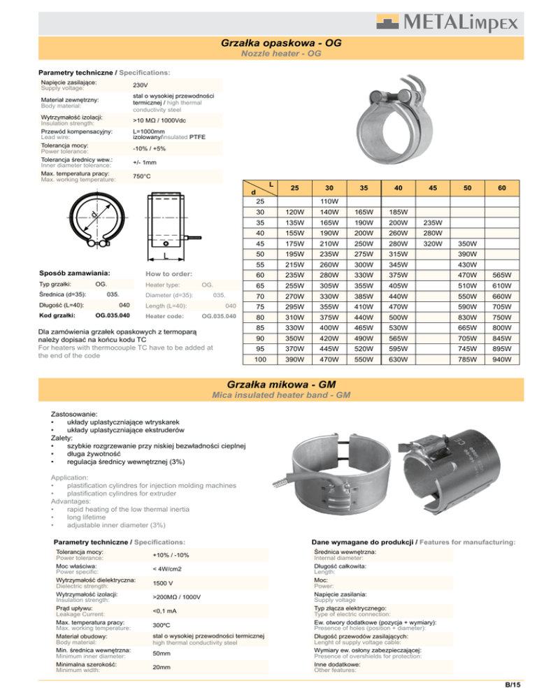 Grzałka opaskowa - OG Nozzle heater - OG Parametry techniczne / Specifications: Napięcie zasilające: Supply voltage: 230V Materiał zewnętrzny: Body material: stal o wysokiej przewodności termicznej / high thermal conductivity steel Wytrzymałość izolacji: Insulation strength: Przewód kompensacyjny: Lead wire: Tolerancja mocy: Power tolerance: Tolerancja średnicy wew.: Inner diameter tolerance: Max. temperatura pracy: Max. working temperature: >10 MΩ / 1000Vdc L=1000mm izolowany/insulated PTFE -10% / +5% +/- 1mm 750°C L 25 30 35 40 30 120W 140W 165W 185W 35 40 135W 165W 190W 200W 235W 155W 190W 200W 260W 280W 45 175W 210W 250W 280W 320W 50 195W 235W 275W 315W 390W 55 215W 260W 300W 345W 430W 60 235W 280W 330W 375W 470W 565W 65 255W 305W 355W 405W 510W 610W 70 270W 330W 385W 440W 550W 660W 040 75 295W 355W 410W 470W 590W 705W OG.035.040 80 310W 375W 440W 500W 830W 750W 85 330W 400W 465W 530W 665W 800W 90 350W 420W 490W 565W 705W 845W 95 370W 445W 520W 595W 745W 895W 100 390W 470W 550W 630W 785W 940W d 25 Sposób zamawiania: How to order: Typ grzałki: Heater type: Średnica (d=35): Długość (L=40): Kod grzałki: OG. 035. OG. Diameter (d=35): 040 OG.035.040 035. Length (L=40): Heater code: Dla zamówienia grzałek opaskowych z termoparą należy dopisać na końcu kodu TC For heaters with thermocouple TC have to be added at the end of the code 45 50 60 110W 350W Grzałka mikowa - GM Mica insulated heater band - GM Zastosowanie: • układy uplastyczniające wtryskarek • układy uplastyczniające ekstruderów Zalety: • szybkie rozgrzewanie przy niskiej bezwładności cieplnej • długa żywotność • regulacja średnicy wewnętrznej (3%) Application: • plastification cylindres for injection molding machines • plastification cylindres for extruder Advantages: • rapid heating of the low thermal inertia • long lifetime • adjustable inner diameter (3%) Parametry techniczne / Specifications: Tolerancja mocy: Power tolerance: Moc właściwa: Power specific: Wytrzymałość dielektryczna: Dielectric strength: Wytrzymałość izolacji: Insulation strength: Prąd upływu: Leakage Current: Max. temperatura pracy: Max. working temperature: Materiał obudowy: Body material: Min. średnica wewnętrzna: Minimum inner diameter: Minimalna szerokość: Minimum width: +10% / -10% < 4W/cm2 1500 V >200MΩ / 1000V <0,1 mA 300ºC stal o wysokiej przewodności termicznej high thermal conductivity steel 50mm 20mm Dane wymagane do produkcji / Features for manufacturing: Średnica wewnętrzna: Internal diameter: Długość całkowita: Length: Moc: Power: Napięcie zasilania: Supply voltage Typ złącza elektrycznego: Type of electric connection: Ew. otwory dodatkowe (pozycja + wymiary): Presence of holes (position + diameter): Długość przewodów zasilających: Lenght of supply voltage cable: Wymiary ew. osłony zabezpieczającej: Presence of overshields for protection: Inne dodatkowe: Other features: B/15