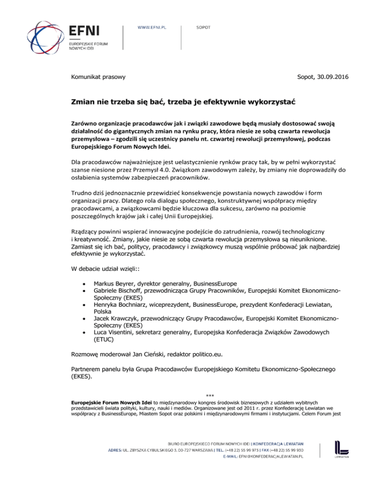 Komunikat prasowy Sopot, 30.09.2016 Zmian nie trzeba się bać, trzeba je efektywnie wykorzystać Zarówno organizacje pracodawców jak i związki zawodowe będą musiały dostosować swoją działalność do gigantycznych zmian na rynku pracy, która niesie ze sobą czwarta rewolucja przemysłowa – zgodzili się uczestnicy panelu nt. czwartej rewolucji przemysłowej, podczas Europejskiego Forum Nowych Idei. Dla pracodawców najważniejsze jest uelastycznienie rynków pracy tak, by w pełni wykorzystać szanse niesione przez Przemysł 4.0. Związkom zawodowym zależy, by zmiany nie doprowadziły do osłabienia systemów zabezpieczeń pracowników. Trudno dziś jednoznacznie przewidzieć konsekwencje powstania nowych zawodów i form organizacji pracy. Dlatego rola dialogu społecznego, konstruktywnej współpracy między pracodawcami, a związkowcami będzie kluczowa dla sukcesu, zarówno na poziomie poszczególnych krajów jak i całej Unii Europejskiej. Rządzący powinni wspierać innowacyjne podejście do zatrudnienia, rozwój technologiczny i kreatywność. Zmiany, jakie niesie ze sobą czwarta rewolucja przemysłowa są nieuniknione. Zamiast się ich bać, politycy, pracodawcy i związkowcy muszą wspólnie próbować jak najbardziej efektywnie je wykorzystać. W debacie udział wzięli:: Markus Beyrer, dyrektor generalny, BusinessEurope Gabriele Bischoff, przewodnicząca Grupy Pracowników, Europejski Komitet EkonomicznoSpołeczny (EKES) Henryka Bochniarz, wiceprezydent, BusinessEurope, prezydent Konfederacji Lewiatan, Polska Jacek Krawczyk, przewodniczący Grupy Pracodawców, Europejski Komitet EkonomicznoSpołeczny (EKES) Luca Visentini, sekretarz generalny, Europejska Konfederacja Związków Zawodowych (ETUC) Rozmowę moderował Jan Cieński, redaktor politico.eu. Partnerem panelu była Grupa Pracodawców Europejskiego Komitetu Ekonomiczno-Społecznego (EKES). *** Europejskie Forum Nowych Idei to międzynarodowy kongres środowisk biznesowych z udziałem wybitnych przedstawicieli świata polityki, kultury, nauki i mediów. Organizowane jest od 2011 r. przez Konfederację Lewiatan we współpracy z BusinessEurope, Miastem Sopot oraz polskimi i międzynarodowymi firmami i instytucjami. Celem Forum jest wypracowywanie pomysłów na silną Europę i konkurencyjną gospodarkę, otwartą na trendy cywilizacyjne i technologiczne. Tegoroczna edycja EFNI odbywa się w dniach 28-30 września w Sopocie, a jej hasło przewodnie to „Przyszłość pracy. Realia, marzenia i mrzonki”. Więcej informacji: www.efni.pl Patronat honorowy Partnerzy instytucjonalni Strategiczni partnerzy medialni Partner Gali otwarcia Partner Gali zamknięcia Partnerzy główni Partnerzy wspierający Partnerzy merytoryczni Producent wykonawczy Dodatkowe informacje: Zbigniew Maciąg [email protected] tel.: +48 604 589 080 Parlament Europejski Grupa Pracodawców EKES, Przedstawicielstwo Komisji Europejskiej w Polsce, Rada Dialogu Społecznego „Dziennik Gazeta Prawna”, Grupa Onet.pl Bank Pekao S.A. MetLife BMW Group, Citi Handlowy, „Do Rzeczy”, Fiat Chrysler Automobiles, „Forbes”, France 24, Intel, „Newsweek”, Orange Polska, „Parkiet”, POLITICO, Polskie Forum HR, Radio ZET, Związek Pracodawców Technologii Cyfrowych Lewiatan AMS, „Bloomberg Businessweek Polska”, „Gazeta Wyborcza”, Havas Media Group, IKEA, „Liberté!”, LINKLEADERS, „My Company Polska”, Polska Agencja Prasowa, „Puls Biznesu”, Quatro Por Quatro, Rada Firm Rodzinnych Konfederacji Lewiatan, Radio TOK FM, „Warsaw Business Journal Observer”, Związek Pracodawców Motoryzacji i Artykułów Przemysłowych Centrum Stosunków Międzynarodowych, European Council on Foreign Relations, Polityka Insight, Ośrodek THINKTANK, Global Compact Poland, Światowa Akademia Sztuki i Nauki Agencja IDFX