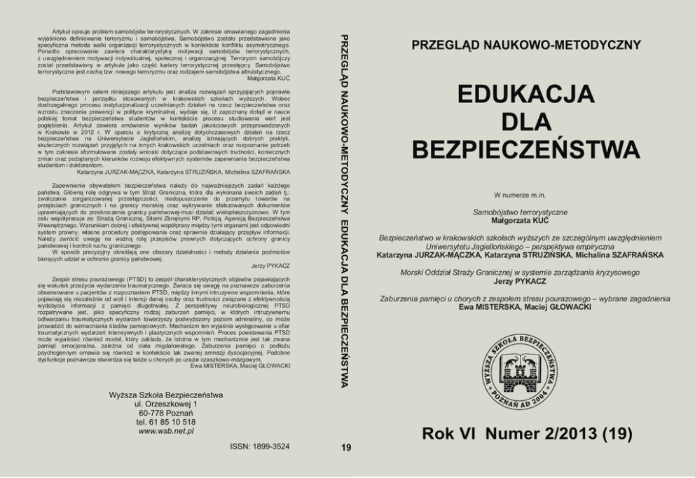 Artyku³ opisuje problem samobójstw terrorystycznych. W zakresie omawianego zagadnienia wyjaœniono definiowanie terroryzmu i samobójstwa. Samobójstwo zosta³o przedstawione jako specyficzna metoda walki organizacji terrorystycznych w kontekœcie konfliktu asymetrycznego. Ponadto opracowanie zawiera charakterystykê motywacji samobójstw terrorystycznych, z uwzglêdnieniem motywacji indywidualnej, spo³ecznej i organizacyjnej. Terroryzm samobójczy zosta³ przedstawiony w artykule jako czêœæ kariery terrorystycznej przestêpcy. Samobójstwo terrorystyczne jest cech¹ tzw. nowego terroryzmu oraz rodzajem samobójstwa altruistycznego. Ma³gorzata KUÆ Podstawowym celem niniejszego artyku³u jest analiza rozwi¹zañ sprzyjaj¹cych poprawie bezpieczeñstwa i porz¹dku stosowanych w krakowskich szko³ach wy¿szych. Wobec dostrzegalnego procesu instytucjonalizacji uczelnianych dzia³añ na rzecz bezpieczeñstwa oraz wzrostu znaczenia prewencji w polityce kryminalnej, wydaje siê, i¿ zapoznany dot¹d w nauce polskiej temat bezpieczeñstwa studentów w kontekœcie procesu studiowania wart jest pog³êbienia. Artyku³ zawiera omówienie wyników badañ jakoœciowych przeprowadzonych w Krakowie w 2012 r. W oparciu o krytyczn¹ analizê dotychczasowych dzia³añ na rzecz bezpieczeñstwa na Uniwersytecie Jagielloñskim, analizê istniej¹cych dobrych praktyk, skutecznych rozwi¹zañ przyjêtych na innych krakowskich uczelniach oraz rozpoznanie potrzeb w tym zakresie sformu³owane zosta³y wnioski dotycz¹ce podstawowych trudnoœci, koniecznych zmian oraz po¿¹danych kierunków rozwoju efektywnych systemów zapewniania bezpieczeñstwa studentom i doktorantom. Katarzyna JURZAK-M¥CZKA, Katarzyna STRUZIÑSKA, Michalina SZAFRAÑSKA Zapewnienie obywatelom bezpieczeñstwa nale¿y do najwa¿niejszych zadañ ka¿dego pañstwa. G³ówn¹ rolê odgrywa w tym Stra¿ Graniczna, która dla wykonana swoich zadañ tj.: zwalczanie zorganizowanej przestêpczoœci, niedopuszczenie do przemytu towarów na przejœciach granicznych i na granicy morskiej oraz wykrywanie sfa³szowanych dokumentów uprawniaj¹cych do przekroczenia granicy pañstwowej-musi dzia³aæ wielop³aszczyznowo. W tym celu wspó³pracuje ze: Stra¿¹ Graniczn¹, Si³ami Zbrojnymi RP, Policj¹, Agencj¹ Bezpieczeñstwa Wewnêtrznego. Warunkiem dobrej i efektywnej wspó³pracy miêdzy tymi organami jest odpowiedni system prawny, w³asne procedury postêpowania oraz sprawnie dzia³aj¹cy przep³yw informacji. Nale¿y zwróciæ uwagê na wa¿n¹ rolê przepisów prawnych dotycz¹cych ochrony granicy pañstwowej i kontroli ruchu granicznego. W sposób precyzyjny okreœlaj¹ one obszary dzia³alnoœci i metody dzia³ania podmiotów bior¹cych udzia³ w ochronie granicy pañstwowej. Jerzy PYKACZ W numerze m.in. Samobójstwo terrorystyczne Ma³gorzata KUÆ Bezpieczeñstwo w krakowskich szko³ach wy¿szych ze szczególnym uwzglêdnieniem Uniwersytetu Jagielloñskiego – perspektywa empiryczna Katarzyna JURZAK-M¥CZKA, Katarzyna STRUZIÑSKA, Michalina SZAFRAÑSKA Morski Oddzia³ Stra¿y Granicznej w systemie zarz¹dzania kryzysowego Jerzy PYKACZ Zespó³ stresu pourazowego (PTSD) to zespó³ charakterystycznych objawów pojawiaj¹cych siê wskutek prze¿ycia wydarzenia traumatycznego. Zwraca siê uwagê na poznawcze zaburzenia obserwowane u pacjentów z rozpoznaniem PTSD, miêdzy innymi intruzywne wspomnienia, które pojawiaj¹ siê niezale¿nie od woli i intencji danej osoby oraz trudnoœci zwi¹zane z efektywnoœci¹ wydobycia informacji z pamiêci d³ugotrwa³ej. Z perspektywy neurobiologicznej PTSD rozpatrywane jest, jako specyficzny rodzaj zaburzeñ pamiêci, w których intruzywnemu odtwarzaniu traumatycznych wydarzeñ towarzyszy podwy¿szony poziom adrenaliny, co mo¿e prowadziæ do wzmacniania œladów pamiêciowych. Mechanizm ten wyjaœnia wystêpowanie u ofiar traumatycznych wydarzeñ intensywnych i plastycznych wspomnieñ. Proces powstawania PTSD mo¿e wyjaœniaæ równie¿ model, który zak³ada, ¿e istotna w tym mechanizmie jest tak zwana pamiêæ emocjonalna, zale¿na od cia³a migda³owatego. Zaburzenia pamiêci o pod³o¿u psychogennym omawia siê równie¿ w kontekœcie tak zwanej amnezji dysocjacyjnej. Podobne dysfunkcje poznawcze stwierdza siê tak¿e u chorych po urazie czaszkowo-mózgowym. Ewa MISTERSKA, Maciej G£OWACKI Zaburzenia pamiêci u chorych z zespo³em stresu pourazowego – wybrane zagadnienia Ewa MISTERSKA, Maciej G£OWACKI Wy¿sza Szko³a Bezpieczeñstwa ul. Orzeszkowej 1 60-778 Poznañ tel. 61 85 10 518 www.wsb.net.pl Rok VI Numer 2/2013 (19) ISSN: 1899-3524 19