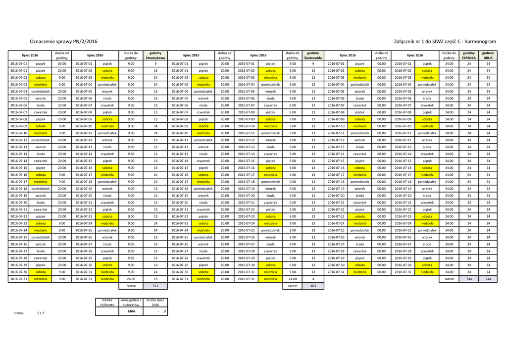 Oznaczenie sprawy PN/2/2016 lipiec 2016 służba od godziny Załącznik nr 1 do SIWZ część C - harmonogram służba do godziny lipiec 2016 godziny Strumykowa służba od godziny lipiec 2016 służba do godziny lipiec 2016 godziny Światowida służba od godziny lipiec 2016 lipiec 2016 służba do godziny godziny SYRENKA godziny ORLIK 2016-07-01 piątek 00.00 2016-07-01 piątek 9.00 9 2016-07-01 piątek 00.00 2016-07-01 piątek 9.00 9 2016-07-01 piątek 00.00 2016-07-01 piątek 24.00 24 24 2016-07-01 piątek 20.00 2016-07-02 sobota 9.00 13 2016-07-01 piątek 20.00 2016-07-02 sobota 9.00 13 2016-07-02 sobota 00.00 2016-07-02 sobota 24.00 24 24 2016-07-02 sobota 9.00 2016-07-03 niedziela 9.00 24 2016-07-02 sobota 20.00 2016-07-03 niedziela 9.00 13 2016-07-03 niedziela 00.00 2016-07-03 niedziela 24.00 24 24 2016-07-03 niedziela 9.00 2016-07-04 poniedziałek 9.00 24 2016-07-03 niedziela 20.00 2016-07-04 poniedziałek 9.00 13 2016-07-04 poniedziałek 00.00 2016-07-04 poniedziałek 24.00 24 24 2016-07-04 poniedziałek 20.00 2016-07-05 wtorek 9.00 13 2016-07-04 poniedziałek 20.00 2016-07-05 wtorek 9.00 13 2016-07-05 wtorek 00.00 2016-07-05 wtorek 24.00 24 24 2016-07-05 wtorek 20.00 2016-07-06 środa 9.00 13 2016-07-05 wtorek 20.00 2016-07-06 środa 9.00 13 2016-07-06 środa 00.00 2016-07-06 środa 24.00 24 24 2016-07-06 środa 20.00 2016-07-07 czwartek 9.00 13 2016-07-06 środa 20.00 2016-07-07 czwartek 9.00 13 2016-07-07 czwartek 00.00 2016-07-07 czwartek 24.00 24 24 2016-07-07 czwartek 20.00 2016-07-08 piątek 9.00 13 2016-07-07 czwartek 20.00 2016-07-08 piątek 9.00 13 2016-07-08 piątek 00.00 2016-07-08 piątek 24.00 24 24 2016-07-08 piątek 20.00 2016-07-09 sobota 9.00 13 2016-07-08 piątek 20.00 2016-07-09 sobota 9.00 13 2016-07-09 sobota 00.00 2016-07-09 sobota 24.00 24 24 2016-07-09 sobota 9.00 2016-07-10 niedziela 9.00 24 2016-07-09 sobota 20.00 2016-07-10 niedziela 9.00 13 2016-07-10 niedziela 00.00 2016-07-10 niedziela 24.00 24 24 2016-07-10 niedziela 9.00 2016-07-11 poniedziałek 9.00 24 2016-07-10 niedziela 20.00 2016-07-11 poniedziałek 9.00 13 2016-07-11 poniedziałek 00.00 2016-07-11 poniedziałek 24.00 24 24 2016-07-11 poniedziałek 20.00 2016-07-12 wtorek 9.00 13 2016-07-11 poniedziałek 20.00 2016-07-12 wtorek 9.00 13 2016-07-12 wtorek 00.00 2016-07-12 wtorek 24.00 24 24 2016-07-12 wtorek 20.00 2016-07-13 środa 9.00 13 2016-07-12 wtorek 20.00 2016-07-13 środa 9.00 13 2016-07-13 środa 00.00 2016-07-13 środa 24.00 24 24 2016-07-13 środa 20.00 2016-07-14 czwartek 9.00 13 2016-07-13 środa 20.00 2016-07-14 czwartek 9.00 13 2016-07-14 czwartek 00.00 2016-07-14 czwartek 24.00 24 24 2016-07-14 czwartek 20.00 2016-07-15 piątek 9.00 13 2016-07-14 czwartek 20.00 2016-07-15 piątek 9.00 13 2016-07-15 piątek 00.00 2016-07-15 piątek 24.00 24 24 2016-07-15 piątek 20.00 2016-07-16 sobota 9.00 13 2016-07-15 piątek 20.00 2016-07-16 sobota 9.00 13 2016-07-16 sobota 00.00 2016-07-16 sobota 24.00 24 24 2016-07-16 sobota 9.00 2016-07-17 niedziela 9.00 24 2016-07-16 sobota 20.00 2016-07-17 niedziela 9.00 13 2016-07-17 niedziela 00.00 2016-07-17 niedziela 24.00 24 24 2016-07-17 niedziela 9.00 2016-07-18 poniedziałek 9.00 24 2016-07-17 niedziela 20.00 2016-07-18 poniedziałek 9.00 13 2016-07-18 poniedziałek 00.00 2016-07-18 poniedziałek 24.00 24 24 2016-07-18 poniedziałek 20.00 2016-07-19 wtorek 9.00 13 2016-07-18 poniedziałek 20.00 2016-07-19 wtorek 9.00 13 2016-07-19 wtorek 00.00 2016-07-19 wtorek 24.00 24 24 2016-07-19 wtorek 20.00 2016-07-20 środa 9.00 13 2016-07-19 wtorek 20.00 2016-07-20 środa 9.00 13 2016-07-20 środa 00.00 2016-07-20 środa 24.00 24 24 2016-07-20 środa 20.00 2016-07-21 czwartek 9.00 13 2016-07-20 środa 20.00 2016-07-21 czwartek 9.00 13 2016-07-21 czwartek 00.00 2016-07-21 czwartek 24.00 24 24 2016-07-21 czwartek 20.00 2016-07-22 piątek 9.00 13 2016-07-21 czwartek 20.00 2016-07-22 piątek 9.00 13 2016-07-22 piątek 00.00 2016-07-22 piątek 24.00 24 24 2016-07-22 piątek 20.00 2016-07-23 sobota 9.00 13 2016-07-22 piątek 20.00 2016-07-23 sobota 9.00 13 2016-07-23 sobota 00.00 2016-07-23 sobota 24.00 24 24 2016-07-23 sobota 9.00 2016-07-24 niedziela 9.00 24 2016-07-23 sobota 20.00 2016-07-24 niedziela 9.00 13 2016-07-24 niedziela 00.00 2016-07-24 niedziela 24.00 24 24 2016-07-24 niedziela 9.00 2016-07-25 poniedziałek 9.00 24 2016-07-24 niedziela 20.00 2016-07-25 poniedziałek 9.00 13 2016-07-25 poniedziałek 00.00 2016-07-25 poniedziałek 24.00 24 24 2016-07-25 poniedziałek 20.00 2016-07-26 wtorek 9.00 13 2016-07-25 poniedziałek 20.00 2016-07-26 wtorek 9.00 13 2016-07-26 wtorek 00.00 2016-07-26 wtorek 24.00 24 24 2016-07-26 wtorek 20.00 2016-07-27 środa 9.00 13 2016-07-26 wtorek 20.00 2016-07-27 środa 9.00 13 2016-07-27 środa 00.00 2016-07-27 środa 24.00 24 24 2016-07-27 środa 20.00 2016-07-28 czwartek 9.00 13 2016-07-27 środa 20.00 2016-07-28 czwartek 9.00 13 2016-07-28 czwartek 00.00 2016-07-28 czwartek 24.00 24 24 2016-07-28 czwartek 20.00 2016-07-29 piątek 9.00 13 2016-07-28 czwartek 20.00 2016-07-29 piątek 9.00 13 2016-07-29 piątek 00.00 2016-07-29 piątek 24.00 24 24 2016-07-29 piątek 20.00 2016-07-30 sobota 9.00 13 2016-07-29 piątek 20.00 2016-07-30 sobota 9.00 13 2016-07-30 sobota 00.00 2016-07-30 sobota 24.00 24 24 2016-07-30 sobota 9.00 2016-07-31 niedziela 9.00 24 2016-07-30 sobota 20.00 2016-07-31 niedziela 9.00 13 2016-07-31 niedziela 00.00 2016-07-31 niedziela 24.00 24 24 2016-07-31 niedziela 9.00 2016-07-31 niedziela 24.00 15 2016-07-31 niedziela 20.00 2016-07-31 niedziela 24.00 4 razem 744 744 razem 513 razem 403 suma godzin z 4 obiektów brutto lipiec 2016 stawka 1h/brutto strona 5z7 2404 - zł