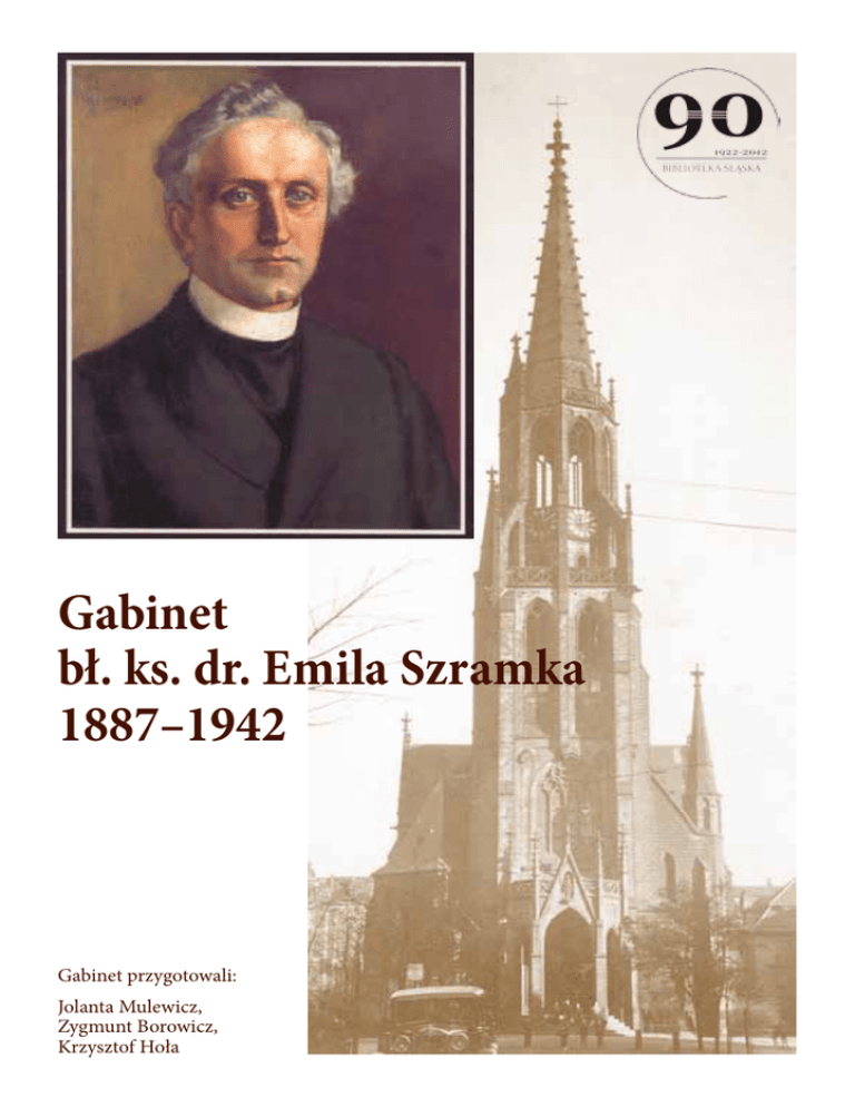 Gabinet bł. ks. dr. Emila Szramka 1887–1942 Gabinet przygotowali: Jolanta Mulewicz, Zygmunt Borowicz, Krzysztof Hoła 13 czerwca 1999 roku papież Jan Paweł II beatyfikował ks. dr. Emila Szramka, jednego ze 108 polskich męczenników II wojny światowej „Ks. dr Emil Szramek należał do najwybitniejszych duszpasterzy na Śląsku okresu międzywojennego. Jako duszpasterz był jednocześnie przywódcą polskiej inteligencji i krzewicielem polskiej kultury na Górnym Śląsku. Rozumiał, że Śląsk winien być nie tylko miejscem wielkiej pracy, ale również terenem zmagań o wewnętrzny wymiar człowieka, który uzewnętrznia się w tworzeniu i rozwijaniu kultury” – tak wspominał postać błogosławionego ks. abp Damian Zimoń w 2010 roku. Ks. Wiktor Jacewicz, współwięzień ks. E. Szramka, powiedział o nim, że do ostatniej chwili życia bardzo wysoko dzierżył sztandar człowieczeństwa i kapłaństwa. Dla Ślązaków był człowiekiem o niezłomnym charakterze i głębokiej duchowości, z której czerpał siły do wielorakiej działalności. Dla wielu współczesnych to wnikliwy badacz kultury i stosunków społecznych, klasyczny górnośląski inteligent, doskonale wykształcony, wybitny humanista. Dzieciństwo i lata młodzieńcze Emil Michał Szramek urodził się 29 września 1887 roku w Tworkowie koło Raciborza. Był synem Augusta – tkacza chałupnika i Józefy z d. Kandziora. W 1895 roku ojciec – nie widząc wyjścia z trudnej sytuacji ekonomicznej – opuścił rodzinę, wyjechał do Ameryki i już nie wrócił. Mały Emil bardzo przeżył rozstanie z ojcem. Jego wychowaniem i edukacją zajęła się matka, która przekazała mu religijność i poczucie polskości. Z domu wyniósł znajomość mówionego języka polskiego, prawie pozbawionego naleciałości gwarowych. To Zapis metrykalny chrztu E. Szramka dzięki matce już jako mały w księgach parafialnych kościoła w Tworkowie chłopiec zbierał pieśni ludowe, aby w wieku późniejszym rozwinąć swoje zainteresowania folklorem Śląska, w nim bowiem widział ładunek polskości. Ważną rolę w rozbudzaniu zainteresowań historycznych, a także pogłębieniu świadomości narodowej ks. Emila Szramka odegrał ks. Józef Gregor, katecheta, badacz śląskiego folkloru, autor pierwszej polskiej E. Szramek mapy Górnego Śląska. z matką i siostrą Naukę rozpoczął w szkole powszechnej w Tworkowie i kontynuował ją w gimnazjum w Raciborzu, a po jego ukończeniu podjął studia filozoficzno-teologiczne na Uniwersytecie Fotografia E. Szramka Wrocławskim (1907–1911). W tym czasie uczestniczył także w doz lat studenckich datkowych prelekcjach, m.in. z historii Śląska, ekonomii politycznej i psychologii mowy. Pomagał innym studentom w poznawaniu polskiej literatury i kultury. Brał czynny udział w pracach tajnych polskich organizacji – „Zet” i „Koło Polskie”. W 1911 roku otrzymał z rąk kardynała Georga Koppa święcenia kapłańskie. Ks. Emil Szramek – duszpasterz Od sierpnia 1911 roku był współpracownikiem ks. Jana Kubotha w Bytomiu Miechowicach, a w styczniu 1912 roku został wikarym w kościele Marii Magdaleny w Tychach, gdzie proboszczem był ks. Jan Kapica. W czasie wolnym od zajęć duszpasterskich zagłębiał się w studiach nad językiem polskim, folklorem i historią Śląska. W 1912 roku uczestniczył w Kongresie Eucharystycznym w Wiedniu. W 1914 roku pod pseudonimem Ludomir wydał broszurę O zbiorach pieśni ludowych na GórKs. E. Szramek i stuła, nym Śląsku oraz na podstawie dysertacji której używał o kolegiacie św. Krzyża w Opolu (Das Kollegiatstift zum hl. Kreuz in Oppeln), którą napisał pod kierunkiem ks. prof. Josepha Jungnitza, uzyskał stopień doktora teologii. W 1915 roku ukończył kurs pedagogiczny w Seminarium Nauczycielskim w Głogowie, a w 1916 roku zdał egzaminy proboszczowskie. We wrześniu 1916 roku został przeniesiony do parafii Zabrze Zaborze, a w 1917 roku zaczął pracę w Mikołowie, gdzie podczas plebiscytu i powstań śląskich czynnie uczestniczył w umacnianiu polskości. Cieszył się opinią sumiennego i bezstronnego księdza, który śmiałymi wystąpieniami ratował niesłusznie Strona tytułowa oskarżonych obywateli. Był współ- dysertacji doktorskiej ks. E. Szramka założycielem Towarzystwa Oświaty im. św. Jacka (1918) oraz redaktorem naczelnym pisma „Głosy znad Odry” (do 1924 roku), na którego łamach często bronił prawa Górnoślązaków do używania języka polskiego. Współpracował również z Biurem Organizacyjnym przy Komisariacie Plebiscytowym. W lutym 1923 roku został powołany przez ks. AuguOkładki pisma „Głosy znad Odry” sta Hlonda na stanowisko kanclerza Administracji Apostolskiej dla Śląska Polskiego. Był pierwszym redaktorem „Rozporządzeń Administracji Apostolskiej” (od 1925 roku „Wiadomości Diecezjalnych”), gdzie ukazywało się wiele jego artykułów. Ks. E. Szramek jest autorem źródeł do historii diecezji – księgi Catalogus sacerdotum Dioecesis Katowicensis, w której umieścił 97 biogramów wspomnień pośmiertnych poświęconych kapłanom diecezji. Po utworzeniu diecezji katowickiej wszedł w skład Kościół parafialny NMP w Katowicach kapituły katedralnej. i jego proboszcz ks. E. Szramek W 1926 roku papież Pius XI powierzył ks. E. Szramkowi parafię Niepokalanego Poczęcia Najświętszej Maryi Panny w Katowicach. W tym samym roku został kanonikiem, a nieco później bp Stanisław Adamski mianował go prałatem. Jako żarliwy orędownik harmonijnego współżycia różnych narodowości i kultur w parafii NMP, w której część ludności była pochodzenia niemieckiego, odprawiał nabożeństwa w dwóch językach. Dla wszystkich parafian – tych biednych i bogatych – był sprawiedliwy, choć bardzo wymagający. Otwartość i tolerancja, a także poczucie taktu sprawiły, iż potrafił łagodzić konflikty między rodowitymi Ślązakami a przybyszami z in