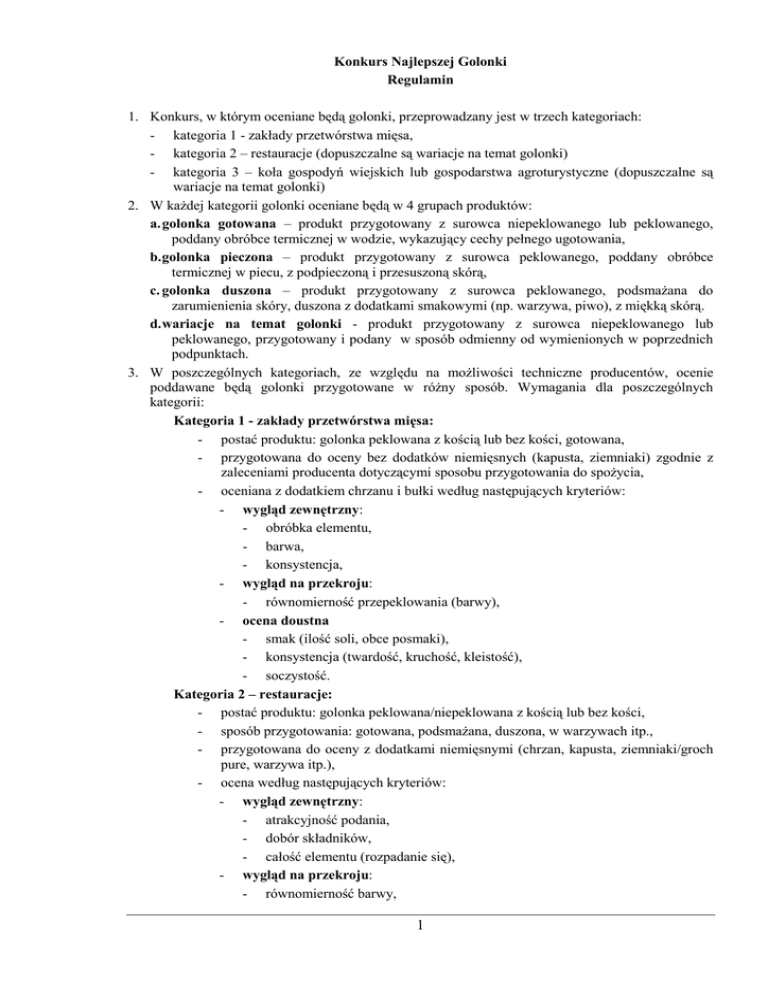 Konkurs Najlepszej Golonki Regulamin 1. Konkurs, w którym oceniane będą golonki, przeprowadzany jest w trzech kategoriach: - kategoria 1 - zakłady przetwórstwa mięsa, - kategoria 2 – restauracje (dopuszczalne są wariacje na temat golonki) - kategoria 3 – koła gospodyń wiejskich lub gospodarstwa agroturystyczne (dopuszczalne są wariacje na temat golonki) 2. W kaŜdej kategorii golonki oceniane będą w 4 grupach produktów: a. golonka gotowana – produkt przygotowany z surowca niepeklowanego lub peklowanego, poddany obróbce termicznej w wodzie, wykazujący cechy pełnego ugotowania, b. golonka pieczona – produkt przygotowany z surowca peklowanego, poddany obróbce termicznej w piecu, z podpieczoną i przesuszoną skórą, c. golonka duszona – produkt przygotowany z surowca peklowanego, podsmaŜana do zarumienienia skóry, duszona z dodatkami smakowymi (np. warzywa, piwo), z miękką skórą. d. wariacje na temat golonki - produkt przygotowany z surowca niepeklowanego lub peklowanego, przygotowany i podany w sposób odmienny od wymienionych w poprzednich podpunktach. 3. W poszczególnych kategoriach, ze względu na moŜliwości techniczne producentów, ocenie poddawane będą golonki przygotowane w róŜny sposób. Wymagania dla poszczególnych kategorii: Kategoria 1 - zakłady przetwórstwa mięsa: - postać produktu: golonka peklowana z kością lub bez kości, gotowana, - przygotowana do oceny bez dodatków niemięsnych (kapusta, ziemniaki) zgodnie z zaleceniami producenta dotyczącymi sposobu przygotowania do spoŜycia, - oceniana z dodatkiem chrzanu i bułki według następujących kryteriów: - wygląd zewnętrzny: - obróbka elementu, - barwa, - konsystencja, - wygląd na przekroju: - równomierność przepeklowania (barwy), - ocena doustna - smak (ilość soli, obce posmaki), - konsystencja (twardość, kruchość, kleistość), - soczystość. Kategoria 2 – restauracje: - postać produktu: golonka peklowana/niepeklowana z kością lub bez kości, - sposób przygotowania: gotowana, podsmaŜana, duszona, w warzywach itp., - przygotowana do oceny z dodatkami niemięsnymi (chrzan, kapusta, ziemniaki/groch pure, warzywa itp.), - ocena według następujących kryteriów: - wygląd zewnętrzny: - atrakcyjność podania, - dobór składników, - całość elementu (rozpadanie się), - wygląd na przekroju: - równomierność barwy, 1 - atrakcyjność barwy, - ocena doustna - smak (atrakcyjność smakowa, występowanie obcych posmaków), - konsystencja (twardość, kruchość, kleistość), - soczystość. Kategoria 3 – koła gospodyń wiejskich i gospodarstwa agroturystyczne (wariacje na temat golonki): - postać produktu: golonka peklowana/niepeklowana z kością lub bez kości, - sposób przygotowania: gotowana, podsmaŜana, duszona, w warzywach itp., - przygotowana do oceny z dodatkami niemięsnymi (chrzan, kapusta, ziemniaki/groch pure, warzywa itp.), - ocena według następujących kryteriów: - wygląd zewnętrzny: - atrakcyjność podania, - dobór składników, - całość elementu (rozpadanie się), - wygląd na przekroju: - równomierność barwy, - atrakcyjność barwy, - ocena doustna - smak (atrakcyjność smakowa, występowanie obcych posmaków), - konsystencja (twardość, kruchość, kleistość), - soczystość. 4. W wyrobach oceniana będzie poŜądalność konsumpcyjna w skali 5-cio punktowej; ocena 1 – ocena dyskwalifikująca, ocena 5 – ocena najwyŜsza. Wyroby oceniane będą przez kapitułę pod przewodnictwem prof. dr hab. Włodzimierza Dolaty z Uniwersytetu Przyrodniczego w Poznaniu 5. Ocena produktów będzie anonimowa (kaŜdy produkt oznaczony będzie wylosowanym przez producenta numerem kodowym). 6. Wyniki konkursu ogłoszone będą w dniu oceny w godzinach popołudniowych lub wieczornych. 2