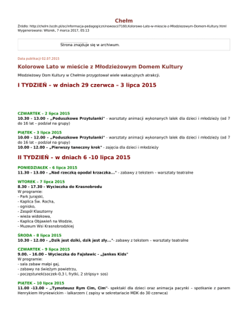 Chełm Źródło: http://chelm.lscdn.pl/oc/informacja-pedagogiczn/nowosci/7160,Kolorowe-Lato-w-miescie-z-Mlodziezowym-Domem-Kultury.html Wygenerowano: Wtorek, 7 marca 2017, 05:13 Strona znajduje się w archiwum. Data publikacji 02.07.2015 Kolorowe Lato w mieście z Młodzieżowym Domem Kultury Młodzieżowy Dom Kultury w Chełmie przygotował wiele wakacyjnych atrakcji. I TYDZIEŃ – w dniach 29 czerwca – 3 lipca 2015 CZWARTEK – 2 lipca 2015 10.30 - 13.00 – „Poduszkowe Przytulanki" - warsztaty animacji wykonanych lalek dla dzieci i młodzieży (od 7 do 16 lat – podział na grupy) PIĄTEK – 3 lipca 2015 10.00 - 12.00 – „Poduszkowe Przytulanki" - warsztaty animacji wykonanych lalek dla dzieci i młodzieży (od 7 do 16 lat – podział na grupy) 10.00 - 12.00 – „Pierwszy taneczny krok" - zajęcia dla dzieci i młodzieży II TYDZIEŃ – w dniach 6 -10 lipca 2015 PONIEDZIAŁEK – 6 lipca 2015 11.30 - 13.00 - „Nad rzeczką opodal krzaczka..." - zabawy z tekstem – warsztaty teatralne WTOREK – 7 lipca 2015 8.30 - 17.30 - Wycieczka do Krasnobrodu W programie: - Park Jurajski, - Kaplica Św. Rocha, - ognisko, - Zespół Klasztorny - wieża widokowa, - Kaplica Objawień na Wodzie, - Muzeum Wsi Krasnobrodzkiej ŚRODA – 8 lipca 2015 10.30 - 12.00 - „Dzik jest dziki, dzik jest zły..."- zabawy z tekstem – warsztaty teatralne CZWARTEK – 9 lipca 2015 9.00. - 16.00 – Wycieczka do Fajsławic - „Jankes Kids" W programie: - sala zabaw małpi gaj, - zabawy na świeżym powietrzu, - poczęstunek(soczek-0,3 l, frytki, 2 stripsy+ sos) PIĄTEK – 10 lipca 2015 11.00 -13.00 – „Tymoteusz Rym Cim, Cim"- spektakl dla dzieci oraz animacja pacynki – spotkanie z panem Henrykiem Hryniewickim - lalkarzem ( zapisy w sekretariacie MDK do 30 czerwca) III TYDZIEŃ – w dniach 14 – 16 lipca 2015 WTOREK – 14 lipca 2015 12.00 – 14.00 - „ Sto Pociech ze smakiem"- warsztaty kulinarne z profesjonalnym kucharzem - (zapisy w sekretariacie MDK do 10 lipca) ŚRODA – 15 lipca 2015 9.00 – 15.00 – Wycieczka do Wólki Bieleckiej - „Gród Słowiański" W programie: - zwiedzanie i zajęcia interaktywne (stanowisko bojowe, wybijanie monet, tańce dawne, drzeworyt i plecionkarstwo, tkactwo, lepienie z gliny, pokaz machin oblężniczych), - pieczenie kiełbasek CZWARTEK – 16 lipca 2015 „Gliniane cudeńka"- spotkanie z garncarzem – (podział na grupy - zapisy w sekretariacie MDK) 10.00 - 11.30 – I grupa 11.30 - 13.00 – II grupa IV TYDZIEŃ – w dniach 20 – 23 lipca 2015 PONIEDZIALEK – 20 lipca 2015 10.00 – 13.00 - „Prawie Dakar" - zabawy na torze samochodowym (zapisy w sekretariacie MDK – dzieci od lat 10 ) WTOREK – 21 lipca 2015 8.00 - 17.00 – Wycieczka do miejscowości Susiec W programie: - Szlak Szumów nad Tanwią - Rezerwat „Czartowe Pole", - Górecko Kościelne, - obiad ŚRODA – 22 lipca 2015 „ Dawno dawno temu..."- pisanie głogolicą (pismo słowiańskie) na papierze czerpanym - (podział na grupy zapisy w sekretariacie MDK) 10.00 - 11.30 – I grupa 11.30 - 13.00 – II grupa CZWARTEK – 23 lipca 2015 10.00 - 13.30 - „Spotkanie z historią - epoka średniowiecza" - strzelanie z łuku, - bicie monet (denary), - strzelanie z katapulty, - dyby, - pieczenie podpłomyków. WAŻNE – w przypadku zapisów w sekretariacie MDK – ilość miejsc ograniczona Przez cały okres wakacji trwać będą również V Chełmskie Wakacje Teatralne. Wszystkie spektakle odbęda się w Soboty a rozpoczynać będą się o godz. 17 na Placu Łuczkowskiego. W razie złej pogody przedstawienia obejrzymy w sali gimnastycznej Szkoły Podstawowej nr. 10 przy ul . Reformackiej 13: 11 25 08 22 lipca 2015 - „Wrażliwość" – Spektakl w wykonaniu Teatru CoNieco z Białegostoku lipca 2015 - „Koziołek Matołek" – Spektakl w wykonaniu Teatru Vaška z Torunia sierpnia 2015 - „Fintikluszki" - Spektakl w wykonaniu Teatru Małe Mi z Warszawy sierpnia 2015 - „Calineczka" – spektakl w wykonaniu Teatru Łątka z Łodzi.