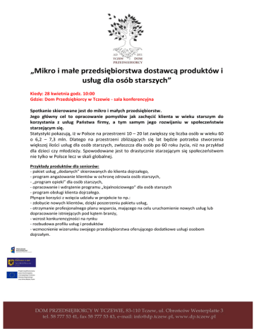 „Mikro i małe przedsiębiorstwa dostawcą produktów i usług dla osób starszych” Kiedy: 28 kwietnia godz. 10:00 Gdzie: Dom Przedsiębiorcy w Tczewie - sala konferencyjna Spotkanie skierowane jest do mikro i małych przedsiębiorstw. Jego główny cel to opracowanie pomysłów jak zachęcić klienta w wieku starszym do korzystania z usług Państwa firmy, a tym samym jego rozwijaniu w społeczeństwie starzejącym się. Statystyki pokazują, iż w Polsce na przestrzeni 10 – 20 lat zwiększy się liczba osób w wieku 60 o 6,2 – 7,3 mln. Dlatego na przestrzeni zbliżających się lat będzie potrzeba stworzenia większej ilości usług dla osób starszych, zwłaszcza dla osób po 60 roku życia, niż na przykład dla dzieci czy młodzieży. Spowodowane jest to drastycznie starzejącym się społeczeństwem nie tylko w Polsce lecz w skali globalnej. Przykłady produktów dla seniorów: - pakiet usług „dodanych” skierowanych do klienta dojrzałego, - program angażowanie klientów w ochronę zdrowia osób starszych, - „program opieki” dla osób starszych, - opracowanie i wdrążenie programu „lojalnościowego” dla osób starszych - program obsługi klienta dojrzałego. Płynące korzyści z wzięcia udziału w projekcie to np.: - zdobycie nowych klientów, dzięki poszerzeniu pakietu usług, - otrzymanie profesjonalnego planu wsparcia, mającego na celu uruchomienie nowych usług lub dopracowanie istniejących pod kątem branży, - wzrost konkurencyjności na rynku - rozbudowa profilu usług i produktów - wzmocnienie wizerunku swojego przedsiębiorstwa oferującego dodatkowe usługi osobom dojrzałym. Agenda: 10:00 – 10:20 – Otwarcie spotkania i prezentacja oferty Domu Przedsiębiorcy 10:20 – Polityka senioralna miasta Tczewa – Z-Ca Prezydenta Miasta Tczewa Adam Urban 10:50 – Profil klienta dojrzałego – p. Marzena Grochowska Get Choice 11:20- Uniwersytet III wieku – czego oczekują seniorzy? 12:00 – Przerwa na poczęstunek 12:30 – Obsługa klienta 50 jak profilować usługi dla klientów – p. Aleksandra Harasiuk Goot at service 13:00 – Dobre praktyki – z jakich usług seniorzy mogą już skorzystać? – Przedsiębiorcy z terenu miasta Tczewa 13:30 – Podsumowanie 14:00 – Zakończenie Organizatorzy: Urząd Miejski w Tczewie – Dom Przedsiębiorcy Get Choice Innowacyjne Wsparcie Biznesu– Marzena Grochowska Z uwagi na ograniczoną ilość miejsc bardzo prosimy o potwierdzenie udziału, wysyłając imię i nazwisko na nasz adres e-mail: [email protected]. Opis prelegentów: Aleksandra Harasiuk GOOD AT SERVICE ekspert w zakresie strategii obsługi klienta, sprzedaży, marketingu, komunikacji. Absolwentka Prywatnej Wyższej Szkoły Biznesu i Administracji w Warszawie Wydziału Strategii Finansowych i Inwestycyjnych o kierunku bankowość. W instytucjach finansowych przepracowała 16 lat – m. in. w Spółdzielczej Kasie Oszczędnościowo – KREDYTOWEJ im F. Stefczyka, Powszechnym BANKU Kredytowym SA, Kredyt Banku SA, Xelion Doradcy Finansowi. W organizacji Pracodawcy Pomorza pełni funkcję Przewodniczącej Sekcji Handlu i Usług, Animatora Klastra podmiotów ekonomii społecznej w OWES oraz Przewodniczącej Platformy Przedsiębiorczości im. Henryka Kaczmarka – Kanolda,w ramach której inicjowana jest współpraca pomiędzy uczniami,nauczycielami i przedsiębiorcami w tematach dotyczących przedsiębiorczości. Uczestniczy w szkoleniach przygotowujących do otwarcia własnej firmy bierze udział w pracy komisji, oceniających biznesplany. Marzena Grochowska GET CHOICE Certfikowany doradca PARPU w projekcie MMP dostawcą usług dla osób starszych, przedsiębiorca praktyk, bussines i life coach, trener biznesu. Absolwentka Akademii Medycznej w Bydgoszczy, Wyższej Szkoły Bankowej w Gdańsku, Gdańskiej Wyższej Szkoły Humanistycznej, Akademii Trenerów Biznesu w Katowicach, Noble Mantahattan Coaching Polska. Ponad 2500 przeszkolonych uczestników w biznesie medycznym. Specjalista do spraw kompetencji miękkich w biznesie. Szczególnie bliskie obszary to zarządzanie zasobami ludzkimi, zarządzanie talentami, motywowanie, sprzedaż, rozwój osobisty. Poszukuje innowacyjnych rozwiązań w biznesie oraz nowych sposobów docierania do ludzi. Pasjonuje się ludźmi, posiada otwarty styl komunikowania się oraz motywowania ludzi do osiągania celów i brania za nie odpowiedzialności. Z biznesem medycznym związana od 15 lat jest członkinią Polskiego Stowarzyszenia Kobiet Biznesu.