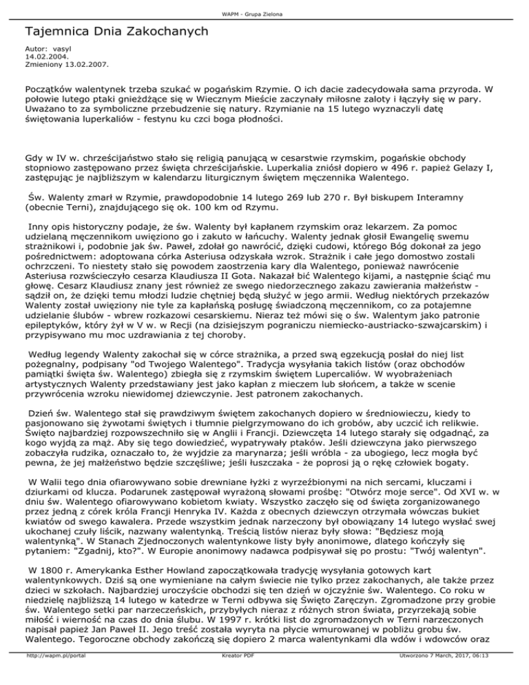 WAPM - Grupa Zielona Tajemnica Dnia Zakochanych Autor: vasyl 14.02.2004. Zmieniony 13.02.2007. Początków walentynek trzeba szukać w pogańskim Rzymie. O ich dacie zadecydowała sama przyroda. W połowie lutego ptaki gnieżdżące się w Wiecznym Mieście zaczynały miłosne zaloty i łączyły się w pary. Uważano to za symboliczne przebudzenie się natury. Rzymianie na 15 lutego wyznaczyli datę świętowania luperkaliów - festynu ku czci boga płodności. Gdy w IV w. chrześcijaństwo stało się religią panującą w cesarstwie rzymskim, pogańskie obchody stopniowo zastępowano przez święta chrześcijańskie. Luperkalia zniósł dopiero w 496 r. papież Gelazy I, zastępując je najbliższym w kalendarzu liturgicznym świętem męczennika Walentego. Św. Walenty zmarł w Rzymie, prawdopodobnie 14 lutego 269 lub 270 r. Był biskupem Interamny (obecnie Terni), znajdującego się ok. 100 km od Rzymu. Inny opis historyczny podaje, że św. Walenty był kapłanem rzymskim oraz lekarzem. Za pomoc udzielaną męczennikom uwięziono go i zakuto w łańcuchy. Walenty jednak głosił Ewangelię swemu strażnikowi i, podobnie jak św. Paweł, zdołał go nawrócić, dzięki cudowi, którego Bóg dokonał za jego pośrednictwem: adoptowana córka Asteriusa odzyskała wzrok. Strażnik i całe jego domostwo zostali ochrzczeni. To niestety stało się powodem zaostrzenia kary dla Walentego, ponieważ nawrócenie Asteriusa rozwścieczyło cesarza Klaudiusza II Gota. Nakazał bić Walentego kijami, a następnie ściąć mu głowę. Cesarz Klaudiusz znany jest również ze swego niedorzecznego zakazu zawierania małżeństw sądził on, że dzięki temu młodzi ludzie chętniej będą służyć w jego armii. Według niektórych przekazów Walenty został uwięziony nie tyle za kapłańską posługę świadczoną męczennikom, co za potajemne udzielanie ślubów - wbrew rozkazowi cesarskiemu. Nieraz też mówi się o św. Walentym jako patronie epileptyków, który żył w V w. w Recji (na dzisiejszym pograniczu niemiecko-austriacko-szwajcarskim) i przypisywano mu moc uzdrawiania z tej choroby. Według legendy Walenty zakochał się w córce strażnika, a przed swą egzekucją posłał do niej list pożegnalny, podpisany "od Twojego Walentego". Tradycja wysyłania takich listów (oraz obchodów pamiątki święta św. Walentego) zbiegła się z rzymskim świętem Lupercaliów. W wyobrażeniach artystycznych Walenty przedstawiany jest jako kapłan z mieczem lub słońcem, a także w scenie przywrócenia wzroku niewidomej dziewczynie. Jest patronem zakochanych. Dzień św. Walentego stał się prawdziwym świętem zakochanych dopiero w średniowieczu, kiedy to pasjonowano się żywotami świętych i tłumnie pielgrzymowano do ich grobów, aby uczcić ich relikwie. Święto najbardziej rozpowszechniło się w Anglii i Francji. Dziewczęta 14 lutego starały się odgadnąć, za kogo wyjdą za mąż. Aby się tego dowiedzieć, wypatrywały ptaków. Jeśli dziewczyna jako pierwszego zobaczyła rudzika, oznaczało to, że wyjdzie za marynarza; jeśli wróbla - za ubogiego, lecz mogła być pewna, że jej małżeństwo będzie szczęśliwe; jeśli łuszczaka - że poprosi ją o rękę człowiek bogaty. W Walii tego dnia ofiarowywano sobie drewniane łyżki z wyrzeźbionymi na nich sercami, kluczami i dziurkami od klucza. Podarunek zastępował wyrażoną słowami prośbę: "Otwórz moje serce". Od XVI w. w dniu św. Walentego ofiarowywano kobietom kwiaty. Wszystko zaczęło się od święta zorganizowanego przez jedną z córek króla Francji Henryka IV. Każda z obecnych dziewczyn otrzymała wówczas bukiet kwiatów od swego kawalera. Przede wszystkim jednak narzeczony był obowiązany 14 lutego wysłać swej ukochanej czuły liścik, nazwany walentynką. Treścią listów nieraz były słowa: "Będziesz moją walentynką". W Stanach Zjednoczonych walentynkowe listy były anonimowe, dlatego kończyły się pytaniem: "Zgadnij, kto?". W Europie anonimowy nadawca podpisywał się po prostu: "Twój walentyn". W 1800 r. Amerykanka Esther Howland zapoczątkowała tradycję wysyłania gotowych kart walentynkowych. Dziś są one wymieniane na całym świecie nie tylko przez zakochanych, ale także przez dzieci w szkołach. Najbardziej uroczyście obchodzi się ten dzień w ojczyźnie św. Walentego. Co roku w niedzielę najbliższą 14 lutego w katedrze w Terni odbywa się Święto Zaręczyn. Zgromadzone przy grobie św. Walentego setki par narzeczeńskich, przybyłych nieraz z różnych stron świata, przyrzekają sobie miłość i wierność na czas do dnia ślubu. W 1997 r. krótki list do zgromadzonych w Terni narzeczonych napisał papież Jan Paweł II. Jego treść została wyryta na płycie wmurowanej w pobliżu grobu św. Walentego. Tegoroczne obchody zakończą się dopiero 2 marca walentynkami dla wdów i wdowców oraz http://wapm.pl/portal Kreator PDF Utworzono 7 March, 2017, 06:13 WAPM - Grupa Zielona ludzi starszych i chorych. Wiele miast w Europie przyznaje się do posiadania relikwii św. Walentego, w tym Lublin, Kraków, Chełmno, Lipsko czy Stromiec. W tych miejscach 14 lutego organizowane są obchody ku czci patrona zakochanych. W bazylice św. Floriana w Krakowie gościem wieczoru, na który zaproszeni są nie tylko zakochani, ale także wszyscy szukający prawdziwej miłości, będzie sam św. Walenty, jako że jego relikwie znajdują się w świątyni. http://wapm.pl/portal Kreator PDF Utworzono 7 March, 2017, 06:13