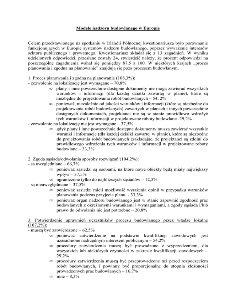 Modele nadzoru budowlanego w Europie Celem przedstawionego na spotkaniu w Irlandii Północnej kwestionariusza było porównanie funkcjonujących w Europie systemów nadzoru budowlanego, poprzez wyważenie interesów sektora publicznego i prywatnego. Kwestionariusz składał się z 13 zagadnień. W wyniku udzielonych odpowiedzi, przesłane zostały 24, stwierdzić należy, że procent odpowiedzi na poszczególne zagadnienia wahał się pomiędzy 87,5 a 100. W niektórych krajach „proces planowania i zgodna na planowanie” znajdują się poza procesem budowlanym. 1. Proces planowania i zgodna na planowanie (108,3%): - zezwolenie na lokalizację jest wymagane – 70,8% • plany i inne powszechnie dostępne dokumenty nie mogą zawierać wszystkich warunków i informacji (dla każdej działki zawartej w planie), które są niezbędne do projektowania robót budowlanych – 54, 2% • ponieważ, niezależnie od jakości warunków i informacji (które są niezbędne do projektowania robót budowlanych) zawartych w planach i innych powszechnie dostępnych dokumentach, projektanci nie są w stanie prawidłowo wdrożyć tych warunków i informacji w projektowane roboty budowlane -29,2% - zezwolenie na lokalizację nie jest wymagane – 37,5% • gdyż plany i inne powszechnie dostępne dokumenty muszą zawierać wszystkie warunki i informacje (dla każdej działki zawartej w planie), które są niezbędne do projektowania robót budowlanych (zakładając, że projektanci są zdolni do prawidłowego wdrożenia tych warunków i informacji w projektowane roboty budowlane – 33,3% 2. Zgoda sąsiada/odwołania sposoby rozwiązań (104,2%): - są uwzględniane – 66,7% • ponieważ sąsiedzi są osobami, na które nowe obiekty będą miały największy wpływ – 37,5% • ograniczone tylko do najbliższych sąsiadów – 12,5% - są nieuwzględniane – 37,5% • ponieważ sąsiedzi mieli możliwość wyrażenia opinii w przypadku warunków planowania podczas przyjęcia planu - 33,3% • ponieważ organ nadzoru budowlanego jest w stanie zapewnić zgodność prac budowlanych z określonymi warunkami i wymaganiami, a zgody sąsiada i/lub prawo do odwołania nie jest potrzebne – 20,8% 3. Potwierdzenie uprawnień uczestników procesu budowlanego przez władze lokalne (107,2%): - muszą być zatwierdzone – 62,5% • ponieważ zatwierdzenie na podstawie kwalifikacji zawodowych jest uzasadnione nadrzędnym interesem publicznym – 54,2% • procedury zatwierdzenia muszą być prowadzone z wyprzedzeniem, dla wszystkich lub niektórych czynności w zakresie kwalifikacji zawodowych – 29,2% • procedury zatwierdzenia muszą być przeprowadzone tuż przed rozpoczęciem robót budowlanych, i powinny być proporcjonalne do stopnia złożoności prowadzonych prac budowlanych – 16,7% • inne – 8,3% - nie muszą być zatwierdzone – 41,7% • ponieważ system ubezpieczeń jest wystarczający w sprawach odpowiedzialności uczestników procesu budowlanego – 0% • wystarczy, aby wymagania dotyczące zdrowia i bezpieczeństwa były zawarte w przepisach ogólnych i określały odpowiedzialność niektórych uczestników procesu budowlanego (przy założeniu, że prawo może zapewnić, aby uczestnicy procesu budowlanego wykonywali swoje obowiązki zgodnie z przepisami) – 20,8% • ponieważ jest to wybór inwestora, i rynek pozwala na odróżnienie podmiotów kompetentnych i niekompetentnych – 4,2% • inne – 16,7% 4. Szczególne wnioski z aplikacji (np. plan wywozu śmieci, zużycie energii i wykorzystanie odnawialnych źródeł energii, określenie procedur, woda, kanalizacja, postępowanie z odprowadzeniem wody): - cel kontroli wniosku • czy wniosek jest poprawny? – 58,3% • czy metoda jest poprawna? – 41,7% • brak konieczności sprawdzenia – 4,2% 5. Szczególne zadania nadzoru budowlanego (np. pożar, bezpieczeństwo konstrukcji) (62,5%): - cel kontroli • sprawdzenie zgodności z zatwierdzonym projektem budowlanym – 54,2% • ochrona przed istotnymi odstępstwami od zatwierdzonego projektu – 41,7% - zadania kontrole na terenie budowy • przeprowadzane przez inspektora nadzoru budowlanego – 12,5% • przeprowadzane przez osobę prywatną – 8,3% • autocertyfikacja – 16,7% • inne – 12,5% 6. Odstępstwa od zezwolenia na lokalizację lub pozwolenia na budowę (104,2%): - po uzyskaniu przez inwestora zmian w zezwoleniu na lokalizację lub pozwoleniu na budowę – 91,7% • ponieważ odstępstwo oznacza, że inwestor buduje inny obiekt budowlany (nie zatwierdzony) – 66,7% • złożone dokumenty muszą być takie same jak oryginalne (niezależnie od skali odstępstwa, inwestor musi złożyć całą dokumentację zawierającą nowe rozwiązanie techniczne obiektu budowlanego) – 37,5% • złożone dokumenty muszą obejmować tylko część prac budowlanych, które odbiegają od pierwotnego projektu – 58,3% - bez obowiązku uzyskania przez inwestora zmiany pozwolenia na planowanie lub na budowę – 12,5% • inwestor musi zawiadomić w odpowiednim czasie właściwy organ; organ ma prawo zawieszenia robót budowlanych, jeśli odstępstwo nie może zostać zaakceptowane (nie do przyjęcia w zakresie warunków i wymogów określonych dla lokalizacji) – 8,3% • • inwestor musi dostarczyć dokumentację, taką samą jak dokumentacja oryginalna (wcześniej zatwierdzona) – 4,2% ponieważ zgodność z określonymi wymaganiami zostanie sprawdzona podczas kontroli końcowej – 4,2% 7. Zakończenie procedury, pozwolenie na użytkowanie oraz świadectwa ukończenia (108,3%): - procedury muszą zostać przeprowadzone przez właściwy organ – 100 % • procedury muszą być oparte na dokumentacji wydanej przez niezależne laboratoria i inne podobne podmioty – 41,7% • procedury mogą być oparte na dokumentacji wykonawcy dotyczącej badania systemu zarządzania jakością zebranej podczas procesu budowlanego – 29,2% • procedury mogą być oparte na dokumentacj