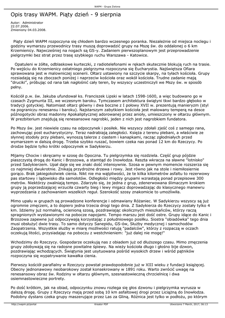 WAPM - Grupa Zielona Opis trasy WAPM. Piąty dzień - 9 sierpnia Autor: Administrator 22.07.2006. Zmieniony 04.03.2008. Piąty dzień WAPM rozpoczyna się chłodem bardzo wczesnego poranka. Niezależnie od miejsca noclegu i godziny wymarszu przewodnicy trasy muszą doprowadzić grupy na Mszę św. do oddalonej o 6 km Krzemienicy. Najwcześniej na nogach są GS-y. Zadaniem pierwszoplanowym jest przeprowadzenie pielgrzymki bez strat przez trasę szybkiego ruchu Warszawa - Katowice. Opatuleni w żółte, odblaskowe kurteczki, z radiotelefonami w rękach skutecznie blokują ruch na trasie. Po wejściu do Krzemienicy ostatniego pielgrzyma rozpoczyna się Eucharystia. Najświętsza Ofiara sprawowana jest w malowniczej scenerii. Ołtarz ustawiony na szczycie skarpy, na tyłach kościoła. Grupy rozsiadają się na zboczach poniżej i naprzeciw kościoła oraz wokół kościoła. Trudne zadanie mają "druciki", próbując od rana tak nagłośnić cały teren, by wszyscy uczestniczyli we Mszy św. w sposób pełny. Kościół p.w. św. Jakuba ufundował ks. Franciszek Lipski w latach 1598-1600, a więc budowano go w czasach Zygmunta III, we wczesnym baroku. Tymczasem architektura świątyni tkwi bardzo głęboko w tradycji gotyckiej. Natomiast ołtarz główny i dwa boczne z I połowy XVII w. prezentują manieryzm (styl na pograniczu renesansu i baroku). Najstarszym zabytkiem kościoła jest malowany temperą na desce późnogotycki obraz madonny Apokaliptycznej adorowanej przez anioły, umieszczony w ołtarzu głównym. W prezbiterium znajdują się renesansowe nagrobki, jeden z nich jest nagrobkiem fundatora. Po Mszy św. jest niewiele czasu na odpoczynek i posiłek. Nie wszyscy zdołali zjeść coś z samego rana, zachowując post eucharystyczny. Teraz nadrabiają zaległości. Księża z terenu plebani, a właściwie ze słynnej stodoły przy plebani, wynoszą talerze z ciastem i kanapkami, racząc zgłodniałych przed wymarszem w dalszą drogę. Trzeba szybko ruszać, bowiem czeka nas ponad 12 km do Rzeczycy. Po drodze będzie tylko krótki odpoczynek w Sadykierzu. Mijamy Chociw i skręcamy w szosę do Opoczna. Tu pielgrzymka się rozdziela. Część grup pójdzie piaszczystą drogą do Kanic i Brzozowa, a stamtąd do Inowłodza. Reszta wkracza na sławne "lotnisko" przed Sadykierzem. Upał daje się we znaki dość intensywnie. Szosa w pewnym momencie rozszerza się co najmniej dwukrotnie. Znikają przydrożne drzewa i rowy. Jest równo jak na stole i niemiłosiernie gorąco. Brak jakiegokolwiek cienia. Nikt nie ma wątpliwości, że te kilka kilometrów asfaltu to rezerwowy pas startowy i lądowisko dla samolotów. Odległości między grupami wzrastają ponad przepisowe 300 metrów. Niektórzy zwalniają tempo. Zdarzyło się, że jedna z grup, zdenerwowana ślimaczym krokiem grupy ją poprzedzającej wrzuciła czwarty bieg i lewy migacz doprowadzając do klasycznego manewru wyprzedzania z zachowaniem wszelkich reguł. Szerokość szosy znakomicie to umożliwiła. Mimo upału w grupach są prowadzone konferencje i odmawiany Różaniec. W Sadykierzu wszyscy są już ogromnie zmęczeni, a to dopiero jedna trzecia drogi tego dnia. Z Sadykierza do Rzeczycy zostały tylko 4 km. Idziemy już normalną, ocienioną szosą, pozdrawiając okolicznych mieszkańców, którzy raczą spragnionych wystawionymi na pobocze napojami. Tempo marszu jest dość ostre. Grupy idące do Kanic i Brzozowa zapewne już odpoczywają korzystając z południowego posiłku. Siostra "obiadówka" tego dnia musi obsłużyć dwie trasy. To samo dotyczy Sanepidu, GS-ów, Służby medycznej i samochodów Zaopatrzenia. Wszystkie służby w miarę możliwości ratują "padalców", którzy z rozpaczą w oczach oczekują litości, przysiadając na poboczu z westchnieniem: "już dalej nie mogę!" Wchodzimy do Rzeczycy. Gospodarze oczekują nas z obiadem już od dłuższego czasu. Mimo zmęczenia grupy zdobywają się na radosne powitalne śpiewy. Na wieży kościoła długo i głośno bije dzwon, pozdrawiając wchodzących. Świątynia jest usytuowana pośród wysokich drzew i wśród pątników rozpoczyna się wypatrywanie kawałka cienia. Pierwszy kościół parafialny w Rzeczycy powstał prawdopodobnie już w XIII wieku z fundacji książęcej. Obecny jednonawowy neobarokowy został konsekrowany w 1891 roku. Warto zwrócić uwagę na renesansowy obraz św. Rodziny w ołtarzu głównym, szesnastowieczną chrzcielnicę i dwa osiemnastowieczne portrety. Po dość krótkim, jak na obiad, odpoczynku znowu rozlega się głos dzwonu i pielgrzymka wyrusza w dalszą drogę. Grupy z Rzeczycy mają przed sobą 10 km asfaltowej drogi przez Liciążną do Inowłodza. Podobny dystans czeka grupy maszerujące przez Las za Gliną. Różnica jest tylko w podłożu, po którym http://wapm.pl/portal Kreator PDF Utworzono 7 March, 2017, 06:13 WAPM - Grupa Zielona trzeba iść. Jednej i drugiej ekipie natomiast sprzyja droga wśród przepięknych lasów nad Pilicą. Czas marszu wypełniają codzienne modlitwy i konferencje programu duchowego WAPM wygłaszane częstokroć przez odwiedzających pielgrzymkę gości. Długie etapy sprzyjają słuchaniu i modlitewnemu skupieniu. Zahartowani już pątnicy zdają się znosić trudy znacznie lepiej niż zaproszeni goście. Ciszę leśną rozdziera odgłos tub niesionych przez braci tubowych. Spóźnionym z wymarszem po leśnych odpoczynkach pielgrzymom i "pielgrzymkom" dość łatwo jest namierzyć kierunek, w którym udała się grupa, kierując się donośnym echem. Jest już dość późne popołudnie. Pierwsze grupy zbliżają się do malowniczo położonego nad Pilicą Inowłodza. Do miasta prowadzi stromo spadająca w dół szosa. Schodząc nią po lewej stronie wśród drzew dostrzegamy okrągłą wieżyczkę przykrytą stożkowym dachem. Mijamy najstarszy obiekt sakralny na naszej trasie. Kościół p.w. św. Idziego do dziś stanowi zagadkę dla historyków. Tradycja głosi, że ufundował go ksi