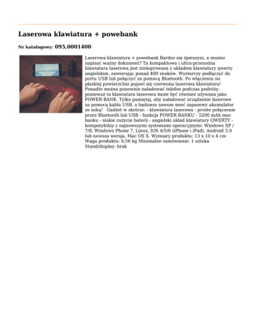 Laserowa klawiatura + powebank Nr katalogowy: 095,0001400 Laserowa klawiatura + powebank Bardzo się śpieszysz, a musisz napisać ważny dokument? Ta kompaktowa i ultra-przenośna klawiatura laserowa jest zintegrowana z układem klawiatury qwerty angielskim, zawierając ponad 400 znaków. Wystarczy podłączyć do portu USB lub połączyć za pomocą Bluetooth. Po włączeniu na płaskiej powierzchni pojawi się czerwona laserowa klawiatura! Ponadto można ponownie naładować telefon podczas podróży, ponieważ ta klawiatura laserowa może być również używana jako POWER BANK. Tylko pamiętaj, aby naładować urządzenie laserowe za pomocą kabla USB, a będziesz zawsze mieć zapasowy akumulator ze sobą! Gadżet w skrócie: - klawiatura laserowa - proste połączenie przez Bluetooth lub USB - funkcja POWER BANKU - 5200 mAh moc banku - niskie zużycie baterii - angielski układ klawiatury QWERTY kompatybilny z najnowszymi systemami operacyjnymi: Windows XP / 7/8, Windows Phone 7, Linux, IOS 4/5/6 (iPhone i iPad), Android 3.0 lub nowsza wersja, Mac OS X. Wymiary produktu: 13 x 10 x 4 cm Waga produktu: 0,56 kg Minimalne zamówienie: 1 sztuka Stand/display: brak
