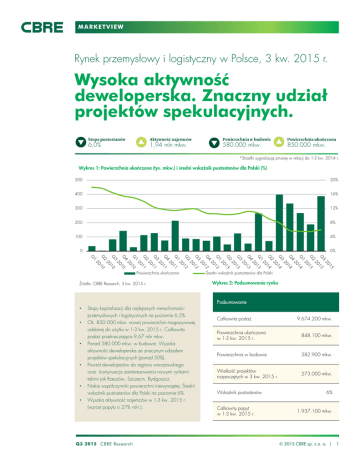 MARKETVIEW Rynek przemysłowy i logistyczny w Polsce, 3 kw. 2015 r. Wysoka aktywność deweloperska. Znaczny udział projektów spekulacyjnych. 6,0% 1,94 mln mkw. 580.000 mkw. 850.000 mkw. *Strzałki sygnalizują zmianę w relacji do 1-3 kw. 2014 r. Wykres 1: Powierzchnia ukończona (tys. mkw.) i średni wskaźnik pustostanów dla Polski (%) 500 20% 400 16% 300 12% 200 8% 100 4% 0 0% Powierzchnia ukończona Źródło: CBRE Research, 3 kw. 2015 r. Średni wskaźnik pustostanów dla Polski Wykres 2: Podsumowanie rynku Podsumowanie • • • • • • Stopy kapitalizacji dla najlepszych nieruchomości przemysłowych i logistycznych na poziomie 6,5%. Ok. 850.000 mkw. nowej powierzchni magazynowej oddanej do użytku w 1-3 kw. 2015 r. Całkowita podaż przekraczająca 9,67 mln mkw. Ponad 580.000 mkw. w budowie. Wysoka aktywność deweloperska ze znacznym udziałem projektów spekulacyjnych (ponad 50%). Powrót deweloperów do regionu warszawskiego oraz kontynuacja zainteresowania nowymi rynkami takimi jak Rzeszów, Szczecin, Bydgoszcz. Niskie współczynniki powierzchni niewynajętej. Średni wskaźnik pustostanów dla Polski na poziomie 6%. Wysoka aktywność najemców w 1-3 kw. 2015 r. (wzrost popytu o 27% r-d-r.). Q3 2015 CBRE Research Całkowita podaż 9.674.200 mkw. Powierzchnia ukończona w 1-3 kw. 2015 r. 848.100 mkw. Powierzchnia w budowie 582.900 mkw. Wielkość projektów rozpoczętych w 3 kw. 2015 r. 273.000 mkw. Wskaźnik pustostanów Całkowity popyt w 1-3 kw. 2015 r. 6% 1.937.100 mkw. © 2015 CBRE sp. z o. o. | 1 M A R K E T V I E W POLAND INDUSTRIAL Wykres 4: Największe projekty ukończone w 3 kw. 2015 r. Wykres 3: Wolumen transakcji inwestycyjnych wg typu nieruchomości (mln EUR) 3 500 3 000 2 500 Region Obiekt Powierzchnia (mkw.) Wrocław Panattoni Park Wrocław III 50.700 Górny Śląsk Panattoni BTS Bielsko-Biała 45.000 Wrocław Goodman Wrocław IV Logistics Centre 39.500 Północ Goodman Pomeranian Logistics Centre 39.300 Polska Centralna Panattoni Business Center Łódź II 33.000 2 000 1 500 1 000 500 0 2007 2008 2009 2010 2011 2012 2013 2014 2015 Biurowe Przemysłowe i logistyczne Handlowe Inne Źródło: CBRE Research, 3 kw. 2015 r. Źródło: CBRE Research, 3 kw. 2015 r. Wykres 5: Popyt na powierzchnię przemysłową i logistyczną (tys. mkw.) Wykres 6: Czynsze umowne, 3 kw. 2015 r. (EUR/ mkw./ mies.) 3 000 Warszawa I 2 500 Kraków Wschód 2 000 Wrocław 1 500 Szczecin 1 000 Północ Poznań 500 Polska Centralna 0 2007 2008 2009 2010 2011 2012 2013 2014 2015 Warszawa I Warszawa II Wrocław Poznań Górny Śląsk Centralna Polska Północ Szczecin Kraków Wschód Warszawa II Górny Śląsk 2.0 2.5 3.0 3.5 4.0 4.5 5.0 5.5 Źródło: CBRE Research, 3 kw. 2015 r. Źródło: CBRE Research, 3 kw. 2015 r. Wykres 7: Podaż powierzchni przemysłowo-logistycznej w podziale na regiony (tys. mkw.) Warszawa II Górny Śląsk Poznań Wrocław Centralna Polska Warszawa I Północ Kraków Wschód Szczecin 0 500 1 000 Powierzchnia istniejąca 1 500 2 000 2 500 Powierzchnia w budowie Źródło: CBRE Research, 3 kw. 2015 r. Q3 2015 CBRE Research © 2015 CBRE sp. z o. o. | 2 M A R K E T V I E W POLAND INDUSTRIAL • Wykres 8: Popyt w 1-3 kw. 2015 r. w podziale na sektory LOGISTYKA 42% PRODUKCJA 24% HANDEL 24% • USŁUGI 2% INNE 8% • • • • Q3 2015 CBRE Research © 2015 CBRE sp. z o. o. | 3 M A R K E T V I E W POLAND INDUSTRIAL Szczecin Północ Poznań Polska Centralna Warszawa I & II Wrocław Wschód Górny Śląsk Kraków Powierzchnia istniejąca Powierzchnia w budowie KONTAKT Disclaimer: CBRE oświadcza, iż informacje zawarte w raportach pochodzą ze źródeł, które uważa za wiarygodne, jakkolwiek prawdziwość informacji nie została przez CBRE zweryfikowana i związku z tym CBRE nie gwarantuje ani nie zapewnia, że informacje te są prawdziwe. Jakiekolwiek przewidywania, opinie, założenia, oszacowania zawarte w raportach zostały podane jedynie dla przykładu i nie odzwierciedlają aktualnej ani przyszłej sytuacji na rynku. Ani CBRE ani jakikolwiek jej reprezentant, lub pracownik CBRE nie ponosi odpowiedzialności za szkody poniesione przez Klienta powstałe na skutek wykorzystania w jakikolwiek sposób raportów w całości lub w części.