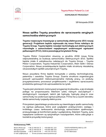 18 listopada 2016 Nowa spółka Toyoty powołana do opracowania seryjnych samochodów elektrycznych Toyota rozpoczyna inwestycje w samochody elektryczne (EV) nowej generacji. Projektem będzie zajmowała się nowa firma należąca do Toyota Group. Toyota będzie rozwijać technologię aut elektrycznych równolegle z samochodami napędzanymi wodorowymi ogniwami paliwowymi (FCV), które pozostają priorytetem firmy. Toyota Motor Corporation otworzy w grudniu 2016 nową firmę odpowiedzialną za budowę samochodów elektrycznych (EV). Spółka będzie miała 4 udziałowców należących do Toyota Group – Toyota Motor Corporation, Toyota Industries Corporation, Aisin Seiki i Denso Corporation. Nowe przedsięwzięcie będzie miało strukturę niezależną od pozostałych spółek wewnętrznych Toyoty. Nowo powołana firma będzie korzystała z wiedzy technologicznej, patentów i zasobów Toyota Group. Zwarta struktura organizacyjna pozwoli wprowadzić niekonwencjonalne metody pracy, co posłuży przyspieszonemu procesowi projektowania i szybkiemu opracowaniu produktów gotowych do wprowadzenia na rynek. Toyota jest pionierem motoryzacji przyjaznej środowisku, a jej strategia polega na proponowaniu klientom wielu różnych oszczędnych i ekologicznych rozwiązań, takich jak hybrydy, hybrydy plug-in oraz samochody na wodorowe ogniwa paliwowe. Firma ma w swoim dorobku także samochody i pojazdy elektryczne. Priorytetem japońskiego producenta są nieemitujące spalin samochody na ogniwa paliwowe, które pod względem praktyczności, zasięgu i krótkiego czasu tankowania dorównują samochodom spalinowym, przewyższając je komfortem jazdy i wydajnością. Zdaniem Toyoty, auta napędzane wodorem są optymalnym rozwiązaniem, które zdecyduje o kształcie przyszłej motoryzacji. Strona 1 z 2 Obecny etap rozwoju ekologicznych napędów oraz infrastruktury przemawia za równoległym inwestowaniem w auta elektryczne. Niejednorodna sytuacja energetyczna i infrastrukturalna w różnych częściach świata, a także coraz bardziej zaostrzone regulacje dotyczące zwiększania udziału samochodów nieemitujących spalin w ogólnej sprzedaży nowych aut powodują, że rośnie zapotrzebowanie na szeroki wybór zeroemisyjnych pojazdów, dostosowanych do sytuacji na poszczególnych rynkach. Dlatego równolegle z inwestycjami oraz promocją samochodów na ogniwa paliwowe Toyota zdecydowała o stworzeniu organizacji, która szybko doprowadzi do wprowadzenia na rynek samochodów elektrycznych tej marki. „W ciągu ostatnich kilku lat przeprowadziliśmy znaczące inwestycje w długofalowy rozwój firmy. Stworzyliśmy Toyota Research Institute, przedsiębiorstwo powołane do badań nad sztuczną inteligencją i autonomicznymi samochodami, przejęliśmy w całości Daihatsu i powołaliśmy nową firmę wewnętrzną odpowiedzialną za opracowywanie kompaktowych samochodów na rynki rozwijające się. Przedsiębiorstwo mające za zadanie budowę samochodów elektrycznych stanowi część tego procesu. Mam nadzieję, że nowa organizacja będzie siłą napędową innowacji w całej grupie Toyoty” – powiedział Akio Toyoda, prezydent i CEO Toyota Motor Corporation. Strona 2 z 2