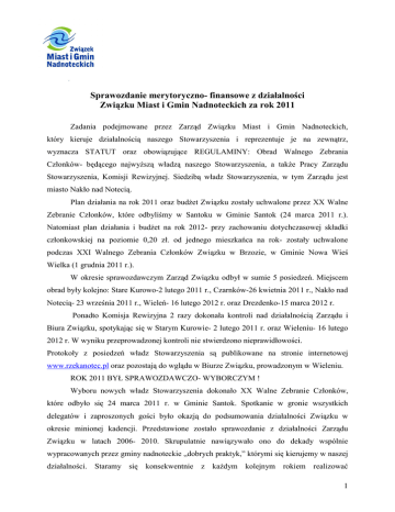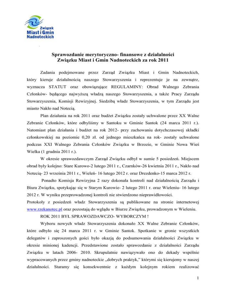 Sprawozdanie merytoryczno- finansowe z działalności Związku Miast i Gmin Nadnoteckich za rok 2011 Zadania podejmowane przez Zarząd Związku Miast i Gmin Nadnoteckich, który kieruje działalnością naszego Stowarzyszenia i reprezentuje je na zewnątrz, wyznacza STATUT oraz obowiązujące REGULAMINY: Obrad Walnego Zebrania Członków- będącego najwyższą władzą naszego Stowarzyszenia, a także Pracy Zarządu Stowarzyszenia, Komisji Rewizyjnej. Siedzibą władz Stowarzyszenia, w tym Zarządu jest miasto Nakło nad Notecią. Plan działania na rok 2011 oraz budżet Związku zostały uchwalone przez XX Walne Zebranie Członków, które odbyliśmy w Santoku w Gminie Santok (24 marca 2011 r.). Natomiast plan działania i budżet na rok 2012- przy zachowaniu dotychczasowej składki członkowskiej na poziomie 0,20 zł. od jednego mieszkańca na rok- zostały uchwalone podczas XXI Walnego Zebrania Członków Związku w Brzozie, w Gminie Nowa Wieś Wielka (1 grudnia 2011 r.). W okresie sprawozdawczym Zarząd Związku odbył w sumie 5 posiedzeń. Miejscem obrad były kolejno: Stare Kurowo-2 lutego 2011 r., Czarnków-26 kwietnia 2011 r., Nakło nad Notecią- 23 września 2011 r., Wieleń- 16 lutego 2012 r. oraz Drezdenko-15 marca 2012 r. Ponadto Komisja Rewizyjna 2 razy dokonała kontroli nad działalnością Zarządu i Biura Związku, spotykając się w Starym Kurowie- 2 lutego 2011 r. oraz Wieleniu- 16 lutego 2012 r. W wyniku przeprowadzonej kontroli nie stwierdzono nieprawidłowości. Protokoły z posiedzeń władz Stowarzyszenia są publikowane na stronie internetowej www.rzekanotec.pl oraz pozostają do wglądu w Biurze Związku, prowadzonym w Wieleniu. ROK 2011 BYŁ SPRAWOZDAWCZO- WYBORCZYM ! Wyboru nowych władz Stowarzyszenia dokonało XX Walne Zebranie Członków, które odbyło się 24 marca 2011 r. w Gminie Santok. Spotkanie w gronie wszystkich delegatów i zaproszonych gości było okazją do podsumowania działalności Związku w okresie minionej kadencji. Przedstawione zostało sprawozdanie z działalności Zarządu Związku w latach 2006- 2010. Skrupulatnie nawiązywało ono do dekady wspólnie wypracowanych przez gminy nadnoteckie „dobrych praktyk,” którymi się kierujemy w naszej działalności. Staramy się konsekwentnie z każdym kolejnym rokiem realizować 1 Porozumienie na lata 2000- 2020 „Przywrócić Noteć miastom i gminom oraz ich społeczeństwu” będące wzajemnym zobowiązaniem do współpracy na rzecz poprawy stanu infrastruktury Noteci. Obecnie Związek liczy 15 członków zwyczajnych, są nimi reprezentowane przez wójtów i burmistrzów gminy nadnoteckie: Gmina BARCIN, Gmina BIAŁE BŁOTA, Gmina MIASTO CZARNKÓW, Gmina DRAWSKO, Miasto i Gmina DREZDENKO, Miasto i Gmina KRZYŻ WIELKOPOLSKI, Miasto i Gmina NAKŁO NAD NOTECIĄ, Miasto i Gmina NOWA WIEŚ WIELKA, Miasto i Gmina PAKOŚĆ, Gmina SANTOK, Gmina STARE KUROWO, Miasto i Gmina UJŚCIE, Miasto i Gmina WIELEŃ, Gmina ZWIERZYN, Gmina ZŁOTNIKI KUJAWSKIE. Ponadto mamy wśród naszych członków wspierających ŻEGLUGĘ BYDGOSKĄ Sp. z o.o., WYŻSZĄ SZKOŁĘ ŚRODOWISKA w Bydgoszczy oraz członka honorowego ZESPÓŁ SZKÓŁ ŻEGLUGI ŚRÓDLĄDOWEJ im. kmdr. Bolesława Romanowskiego w Nakle nad Notecią. Miło mi również poinformować, że w ostatnim czasie Zarząd Związku przyjął w poczet członków wspierających Uniwersytet im. Kazimierza Wielkiego w Bydgoszczy- z jedną uwagą, że członkostwo będzie pełne- po zatwierdzeniu przez Senat Uczelni. O członkostwo w Związku stara się również Stowarzyszenie Wodniaków Przystań Gorzów. Dla pełnej informacji dodam, że podpisana została Umowa partnerska ze Stowarzyszeniem Bractwo Bydgoskiego Węzła Wodnego. Śmiało mogę powiedzieć, że dzisiaj Związek Miast i Gmin Nadnoteckich stanowi silną i liczną grupę, a to z pewnością przekłada się na skuteczność naszego działania, która jest efektem synergii współpracy. Dlatego, w tym miejscu pragnę podkreślić, że mam zaszczyt jako delegat Gminy Miasta Czarnków pełnić funkcję Prezesa Zarządu Związku. Dla szerszej reprezentacji zdecydowaliśmy, zgodnie z obowiązującym Statutem Stowarzyszenia o zwiększeniu ilości członków Zarządu- z 6 do 7 osób oraz ilości członków Komisji Rewizyjnej- z 4 do 5. Wyboru do władz naszego Stowarzyszenia dokonało XX Walne Zebranie Członków (obrady w Santoku), po wymaganym ukonstytuowaniu się (obrady w Czarnkowie) skład osobowy Zarządu Związku Miast i Gmin Nadnoteckich mamy następujący: 1. Prezes Związku – Franciszek Strugała ( delegat Miasta Czarnków ) 2. V-ce Prezes – Sławomir Napierała ( delegat Miasta i Gminy Nakło nad Notecią ) 3. Sekretarz – Stanisław Chudzik ( delegat Gminy Santok ) 4. Skarbnik – Marek Tchórzka ( delegat Gminy Drawsko ) 5. Członek – Andrzej Wiśniewski ( delegat Gminy Zwierzyn ) 6. Członek – Wojciech Oskwarek ( delegat Gminy Nowa Wieś Wielka ) 7. Członek – Maciej Pietruszak ( delegat Miasta i Gminy Drezdenko ). 2 Natomiast w obecnej kadencji skład osobowy Komisji Rewizyjnej jest poniższy: 1. Przewodniczący Komisji Rewizyjnej - Zbigniew Stochaj (delegat Miasta i Gminy Wieleń) 2. Zastępca Przewodniczącego Komisji - Wiesław Własak ( delegat Gminy Stare Kurowo ) 3. Sekretarz Komisji - Katarzyna Kirstein- Piotrowska ( delegat Gminy Białe Błota ) 4. Członek Komisji - Zygmunt Jasiewicz ( delegat Miasta i Gminy Krzyż Wielkopolski ) 5. Członek Komisji – Wiesław Kończal ( delegat Miasta i Gminy Pakość ). PODSUMOWANIE PROJEKTU „ROZBUDOWA STRATEGII ZMiGN” (2009- 2010). W rozbudowie ujętych zostało sześć gmin, które w ostatnich latach zostały członkami Związku (Białe Błota, Krzyż Wlkp., Nowa Wieś Wielka, Pakość, Ujście, Zwierzyn). Osobny rozdział poświęcony został członkom wspierającym oraz honorowemu, których działania związane są z celami realizowanymi przez Związek. Kluczowym naszym celem jest zbudowanie infrastruktury służącej rozwojo