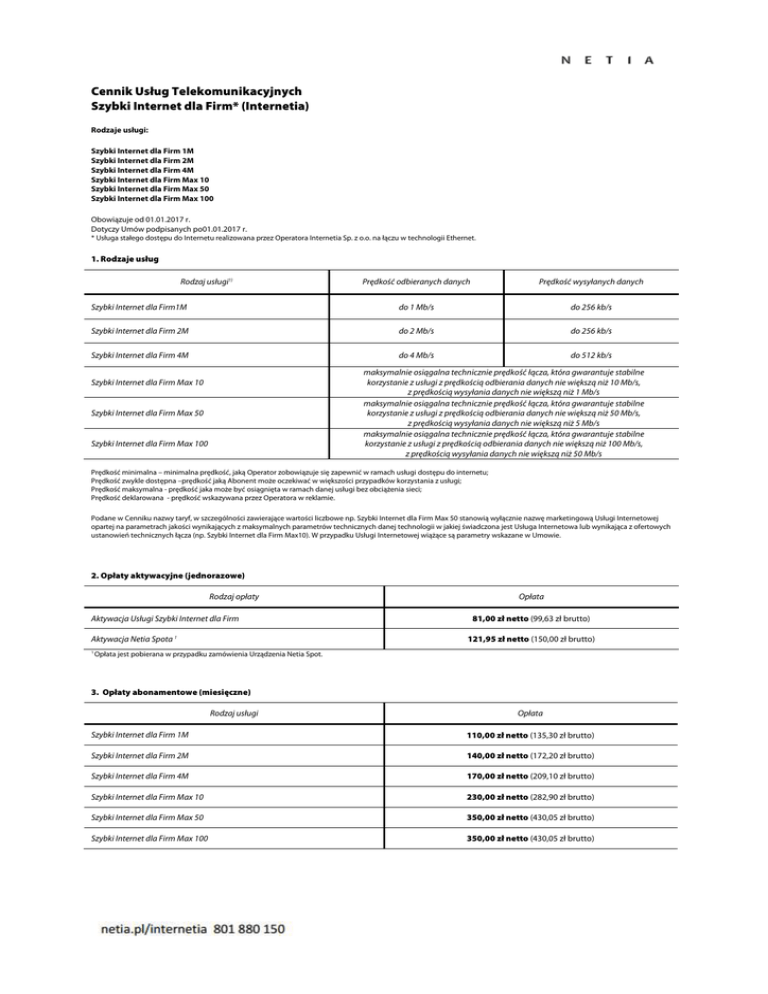 Cennik Usług Telekomunikacyjnych Szybki Internet dla Firm* (Internetia) Rodzaje usługi: Szybki Internet dla Firm 1M Szybki Internet dla Firm 2M Szybki Internet dla Firm 4M Szybki Internet dla Firm Max 10 Szybki Internet dla Firm Max 50 Szybki Internet dla Firm Max 100 Obowiązuje od 01.01.2017 r. Dotyczy Umów podpisanych po01.01.2017 r. * Usługa stałego dostępu do Internetu realizowana przez Operatora Internetia Sp. z o.o. na łączu w technologii Ethernet. 1. Rodzaje usług Rodzaj usługi1) Prędkość odbieranych danych Prędkość wysyłanych danych Szybki Internet dla Firm1M do 1 Mb/s do 256 kb/s Szybki Internet dla Firm 2M do 2 Mb/s do 256 kb/s Szybki Internet dla Firm 4M do 4 Mb/s do 512 kb/s maksymalnie osiągalna technicznie prędkość łącza, która gwarantuje stabilne korzystanie z usługi z prędkością odbierania danych nie większą niż 10 Mb/s, z prędkością wysyłania danych nie większą niż 1 Mb/s maksymalnie osiągalna technicznie prędkość łącza, która gwarantuje stabilne korzystanie z usługi z prędkością odbierania danych nie większą niż 50 Mb/s, z prędkością wysyłania danych nie większą niż 5 Mb/s maksymalnie osiągalna technicznie prędkość łącza, która gwarantuje stabilne korzystanie z usługi z prędkością odbierania danych nie większą niż 100 Mb/s, z prędkością wysyłania danych nie większą niż 50 Mb/s Szybki Internet dla Firm Max 10 Szybki Internet dla Firm Max 50 Szybki Internet dla Firm Max 100 Prędkość minimalna – minimalna prędkość, jaką Operator zobowiązuje się zapewnić w ramach usługi dostępu do internetu; Prędkość zwykle dostępna –prędkość jaką Abonent może oczekiwać w większości przypadków korzystania z usługi; Prędkość maksymalna - prędkość jaka może być osiągnięta w ramach danej usługi bez obciążenia sieci; Prędkość deklarowana - prędkość wskazywana przez Operatora w reklamie. Podane w Cenniku nazwy taryf, w szczególności zawierające wartości liczbowe np. Szybki Internet dla Firm Max 50 stanowią wyłącznie nazwę marketingową Usługi Internetowej opartej na parametrach jakości wynikających z maksymalnych parametrów technicznych danej technologii w jakiej świadczona jest Usługa Internetowa lub wynikająca z ofertowych ustanowień technicznych łącza (np. Szybki Internet dla Firm Max10). W przypadku Usługi Internetowej wiążące są parametry wskazane w Umowie. 2. Opłaty aktywacyjne (jednorazowe) Rodzaj opłaty Aktywacja Usługi Szybki Internet dla Firm Aktywacja Netia Spota 1 1 Opłata 81,00 zł netto (99,63 zł brutto) 121,95 zł netto (150,00 zł brutto) Opłata jest pobierana w przypadku zamówienia Urządzenia Netia Spot. 3. Opłaty abonamentowe (miesięczne) Rodzaj usługi Opłata Szybki Internet dla Firm 1M 110,00 zł netto (135,30 zł brutto) Szybki Internet dla Firm 2M 140,00 zł netto (172,20 zł brutto) Szybki Internet dla Firm 4M 170,00 zł netto (209,10 zł brutto) Szybki Internet dla Firm Max 10 230,00 zł netto (282,90 zł brutto) Szybki Internet dla Firm Max 50 350,00 zł netto (430,05 zł brutto) Szybki Internet dla Firm Max 100 350,00 zł netto (430,05 zł brutto) Cennik Usług Telekomunikacyjnych Szybki Internet dla Firm (Internetia) 5. Pozostałe opłaty Rodzaj usługi Dzierżawa Netia Spota Kara za niezwrócenie Netia Spota 1, 2 1 Sposób naliczania Opłata Opłata miesięczna 20,00 zł netto (24,60 zł brutto) Opłata jednorazowa 200,00 zł netto (246,00 zł brutto) Urządzenia są udostępniane Abonentowi przez Operatora, w przypadku rozwiązania Umowy w zakresie Usługi Internetowej. Abonent zobowiązany jest do zwrócenia na własny koszt udostępnionego urządzenia w ciągu 14 dni od daty rozwiązania Umowy.