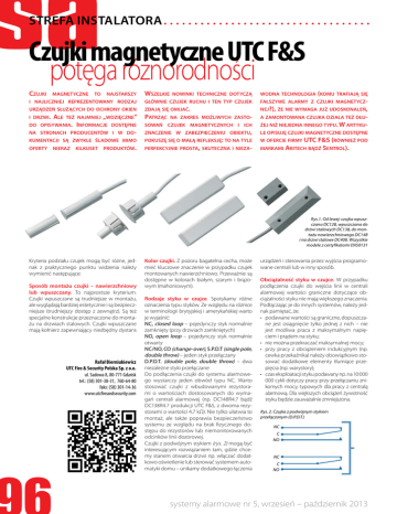 Strefa Instalatora Czujki magnetyczne UTC F&S potęga różnorodności Czujki magnetyczne to najstarszy i najliczniej reprezentowany rodzaj urządzeń służących do ochrony okien i drzwi. Ale też najmniej „wdzięczne” do opisywania. Informacje Wszelkie nowinki techniczne dotyczą głównie czujek ruchu i ten typ czujek zdają się omijać. Patrząc na zakres możliwych zasto- dostępne sowań czujek magnetycznych i ich na stronach producentów i w do- znaczenie w zabezpieczeniu obiektu, kumentacji są zwykle śladowe mimo oferty nieraz kilkuset produktów. pokuszę się o małą refleksję: to na tyle perfekcyjnie prosta, skuteczna i nieza- wodna technologia (komu trafiają się fałszywe alarmy z czujki magnetycznej?), że nie wymaga już udoskonaleń, a zamontowana czujka działa też dłużej niż niejedna innego typu. W artykule opisuję czujki magnetyczne dostępne w ofercie firmy UTC F&S (również pod markami Aritech bądź Sentrol). Rys.1. Od lewej: czujka wpuszczana DC128, wpuszczana do drzwi stalowych DC138, do montażu nawierzchniowego DC148 i na drzwi stalowe DC408. Wszystkie modele z certyfikatami EN50131 Kryteria podziału czujek mogą być różne, jednak z praktycznego punktu widzenia należy wymienić następujące: Sposób montażu czujki – nawierzchniowy lub wpuszczany. To najprostsze kryterium. Czujki wpuszczane są trudniejsze w montażu, ale wyglądają bardziej estetycznie i są bezpieczniejsze (trudniejszy dostęp z zewnątrz). Są też specjalne konstrukcje przeznaczone do montażu na drzwiach stalowych. Czujki wpuszczane mają kołnierz zapewniający niezbędny dystans Rafał Bierniukiewicz UTC Fire & Security Polska Sp. z o.o. ul. Sadowa 8, 80-771 Gdańsk tel.: (58) 301-38-31, 760-64-80 faks: (58) 301-14-36 www.utcfireandsecurity.com magnesu i kontaktronu od drzwi. Czujki przykręcane do drzwi mają konstrukcję utrzymującą magnes i kontaktron w niezbędnej odległości od ferromagnetycznej płyty drzwi. Czujki nawierzchniowe do drzwi stalowych często występują w wykonaniach heavy-duty o znacznej odporności mechanicznej (montaż np. na podłodze garażu), a przewód schowany w pancerzu jest zabezpieczony przed uszkodzeniem. Kolor czujki. Z pozoru bagatelna cecha, może mieć kluczowe znaczenie w przypadku czujek montowanych nawierzchniowo. Przeważnie są dostępne w kolorach białym, szarym i brązowym (mahoniowym). Rodzaje styku w czujce. Spotykamy różne oznaczenia typu styków. Ze względu na różnice w terminologii brytyjskiej i amerykańskiej warto je wyjaśnić: NC, closed loop – pojedynczy styk normalnie zamknięty (przy drzwiach zamkniętych) NO, open loop – pojedynczy styk normalnie otwarty NC/NO, CO (change-over), S.P.D.T (single pole, double throw) – jeden styk przełączany D.P.D.T. (double pole, double throw) – dwa niezależne styki przełączane Do podłączenia czujki do systemu alarmowego wystarczy jeden obwód typu NC. Warto stosować czujki z wbudowanymi rezystorami o wartościach dostosowanych do wymagań centrali alarmowej (np. DC148R4.7 bądź DC138R4.7 produkcji UTC F&S, z dwoma rezystorami o wartości 4,7 kΩ). Nie tylko ułatwia to montaż, ale także poprawia bezpieczeństwo systemu ze względu na brak fizycznego dostępu do rezystorów lub niemonitorowanych odcinków linii dozorowej. Czujki z podwójnym stykiem (rys. 2) mogą być interesującym rozwiązaniem tam, gdzie chcemy stanem otwarcia drzwi np. włączać dodatkowo oświetlenie lub sterować systemem automatyki domu – unikamy dodatkowego łączenia urządzeń i sterowania przez wyjścia programowane centrali lub w inny sposób. Obciążalność styku w czujce. W przypadku podłączenia czujki do wejścia linii w centrali alarmowej wartości graniczne dotyczące obciążalności styku nie mają większego znaczenia. Podłączając je do innych systemów, należy jednak pamiętać, że: • podawane wartości są graniczne, dopuszczane jest osiągnięcie tylko jednej z nich – nie jest możliwa praca z maksymalnym napięciem i prądem na styku; • nie można przekraczać maksymalnej mocy; • przy pracy z obciążeniem indukcyjnym (np. cewka przekaźnika) należy obowiązkowo stosować dodatkowe elementy tłumiące przepięcia (np. warystory); • czas eksploatacji styku podawany np. na 10 000 000 cykli dotyczy pracy przy przełączaniu znikomych mocy, typowych dla pracy z centralą alarmową. Dla większych obciążeń żywotność styku będzie zauważalnie zmniejszona. Rys. 2. Czujka z podwójnym stykiem przełączanym (D.P.D.T.) NC C NO NC C NO systemy alarmowe nr 5, wrzesień – październik 2013 Y Rys. 3. Czujki magnetyczne bez polaryzacji (1), z dużą szczeliną (2) (3) i dodatkowym zabezpieczeniem antysabotażowym (4) (5). Odległości magnesu na osi Y podano w milimetrach S N lub N S S N N S S N N S N S N S N S N S [mm] 40 35 30 25 20 15 10 5 0 Przykładowo firma Sentrol definiuje dla większości swoich czujek magnetycznych następujące dopuszczalne wartości: • napięcie przełączane: 100 V (DC), • prąd przełączany: 0,5 A (DC) dla styku NC, 0,25 A (DC) dla pozostałych typów, • maks. moc przełączana: 7,5 W dla styku NC, 3 W dla pozostałych typów. Z przewodem czy z zaciskami śrubowymi? Czujki do montażu wpuszczanego z reguły mają przewód o długości około 2 m (dostępne są wersje dłuższe) z 4-5 żyłami (jedna para to zamknięta pętla sabotażowa, pozostałe 2-3 żyły są do styku alarmowego). Wybierając to rozwiązanie, warto pomyśleć o wersjach z wbudowanymi rezystorami końca linii w czujkę. Często wymagają dodatkowej puszki połączeniowej niedaleko drzwi lub wprowadzenia tego przewodu, np. do wnętrza czujki ruchu lub innego urządzenia systemu alarmowego. Czujki z zaciskami śrubowymi to najprostsze warianty czujek montowanych nawierzchniowo. Ich zaletą jest możliwość łatwego dołączenia do doprowadzonego przewodu i prosta wymiana. Należy pamiętać o starannym przyłączeniu przewodów i zab