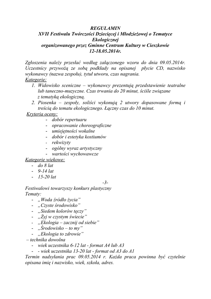 REGULAMIN XVII Festiwalu Twórczości Dziecięcej i Młodzieżowej o Tematyce Ekologicznej organizowanego przez Gminne Centrum Kultury w Cieszkowie 12-18.05.2014r. Zgłoszenia należy przesłać według załączonego wzoru do dnia 09.05.2014r. Uczestnicy przywożą ze sobą podkłady na opisanej płycie CD, nazwisko wykonawcy (nazwa zespołu), tytuł utworu, czas nagrania. Kategorie: 1. Widowisko sceniczne – wykonawcy prezentują przedstawienie teatralne lub taneczno-muzyczne. Czas trwania do 20 minut, ściśle związane z tematyką ekologiczną. 2. Piosenka – zespoły, soliści wykonują 2 utwory dopasowane formą i treścią do tematu ekologicznego. Łączny czas do 10 minut. Kryteria oceny: - dobór repertuaru - opracowanie choreograficzne - umiejętności wokalne - dobór i estetyka kostiumów - rekwizyty - ogólny wyraz artystyczny - wartości wychowawcze Kategorie wiekowe: - do 8 lat - 9-14 lat - 15-20 lat -3Festiwalowi towarzyszy konkurs plastyczny Tematy: - „Woda źródło życia” - „Czyste środowisko” - „Siedem kolorów tęczy” - „Żyj w czystym świecie” - „Ekologia – zacznij od siebie” - „Środowisko – to my” - „Ekologia to zdrowie” – technika dowolna - wiek uczestnika 6-12 lat - format A4 lub A3 - - wiek uczestnika 13-20 lat - format od A3 do A1 Termin nadsyłania prac 09.05.2014 r. Każda praca powinna być czytelnie opisana imię i nazwisko, wiek, szkoła, adres. Uwaga: Wszystkie nadesłane prace przechodzą na własność organizatora Festiwalu Wystawę prac plastycznych można będzie oglądać w sali GCK Cieszków przy ulicy Sikorskiego 35 w dniach 12 – 18 .05.2014r. w godz. 800 – 1800. Podsumowanie i wręczenie nagród w konkursie plastycznym 18.05.2014r. Nagrody i wyróżnienia W każdej kategorii Festiwalu będą przyznawane nagrody i wyróżnienia ufundowane przez Wojewódzki Fundusz Ochrony Środowiska i Gospodarki Wodnej we Wrocławiu. Organizatorzy zapewniają nagłośnienie.
