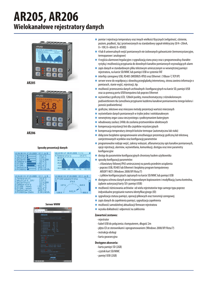 AR205, AR206 Wielokanałowe rejestratory danych pomiar i rejestracja temperatury oraz innych wielkości fizycznych (wilgotność, ciśnienie, n AR205 AR206 Sposoby prezentacji danych Serwer WWW poziom, prędkość, itp.) przetworzonych na standardowy sygnał elektryczny (0/4÷20mA, 0÷10V, 0÷60mV, 0÷850Ω) 4 lub 8 uniwersalnych wejść pomiarowych nie izolowanych galwanicznie (termorezystancyjne, n termoparowe i analogowe) 4 wyjścia alarmowe/regulacyjne z sygnalizacją stanu pracy oraz z programowalną charakten rystyką i możliwością przypisania do dowolnych kanałów pomiarowych wyzwalających alarm zapis danych w standardowym pliku tekstowym umieszczonym w wewnętrznej pamięci n rejestratora, na karcie SD/MMC lub pamięci USB w systemie FAT interfejs szeregowy USB, RS485 (MODBUS-RTU) oraz Ethernet (10base-T, TCP/IP) n serwer www do współpracy z dowolną przeglądarką internetową, strona zawiera informacje o n pomiarach, stanie wyjść, rejestracji, itp. możliwość przenoszenia danych archiwalnych i konfiguracyjnych na karcie SD, pamięci USB n oraz za pomocą portu USB komputera lub poprzez Ethernet wyświetlacz graficzny LCD, 128x64 punkty, monochromatyczny z różnokolorowym n podświetleniem tła (umożliwia przypisanie każdemu kanałowi pomiarowemu innego koloru i jasności podświetlenia) graficzne, tekstowe oraz mieszane metody prezentacji wartości mierzonych n wyświetlanie danych pomiarowych w trybie jedno i wielokanałowym n wewnętrzny zegar czasu rzeczywistego z podtrzymaniem bateryjnym n wbudowany zasilacz 24Vdc do zasilania przetworników obiektowych n kompensacja rezystancji linii dla czujników rezystancyjnych n kompensacja temperatury zimnych końców termopar (automatyczna lub stała) n dołączone bezpłatne oprogramowanie umożliwiające prezentację graficzną lub tekstową n zarejestrowanych wyników oraz konfigurację parametrów programowalne rodzaje wejść, zakresy wskazań, alfanumeryczny opis kanałów pomiarowych, n opcje rejestracji, alarmów, wyświetlania, komunikacji, dostępu oraz inne parametry konfiguracyjne dostęp do parametrów konfiguracyjnych chroniony hasłem użytkownika n sposoby konfiguracji parametrów: n - z klawiatury foliowej IP65 umieszczonej na panelu przednim urządzenia - poprzez USB, RS485 lub Ethernet i bezpłatny program komputerowy ARSOFT-WZ1 (Windows 2000/XP/Vista/7) - z plików konfiguracyjnych zapisanych na karcie SD/MMC lub pamięci USB dostępna ochrona danych przed niepowołanym kopiowaniem i modyfikacją (suma kontrolna, n żądanie autoryzacji karty SD i pamięci USB) możliwość różnicowania archiwów od wielu rejestratorów tego samego typu poprzez n indywidualne przypisanie numeru identyfikacyjnego (ID) sygnalizacja statusu pamięci, operacji plikowych oraz transmisji szeregowej n zapis danych do zapełnienia pamięci, sygnalizacja zapełnienia n możliwość samodzielnej aktualizacji firmware rejestratora n wysoka dokładność i odporność na zakłócenia n Zawartość zestawu: - rejestrator - kabel USB do połączenia z komputerem, długość 2m - płyta CD ze sterownikami i oprogramowaniem (Windows 2000/XP/Vista/7) - instrukcja obsługi - karta gwarancyjna Dostępne akcesoria: - karta pamięci SD (2GB) - czytnik kart SD/MMC - pamięć USB (2GB) Dane techniczne Obudowa i sposób montażu Uniwersalne wejścia (programowalne): zakresy pomiarowe Mocowanie tablicowe, uchwytami z boku obudowy - Pt100 (RTD, 3- lub 2-przewodowe) -200 ÷ 850 °C Wymiary 96 × 96 × 79 mm - Ni100 (RTD, 3- lub 2-przewodowe) -50 ÷ 170 °C Okno tablicy 92 × 89 mm - termopara J (TC, Fe-CuNi) -40 ÷ 800 °C Materiał samogasnący NORYL 94V-0, poliwęglan - termopara K (TC, NiCr-NiAl) -40 ÷ 1200 °C - termopara S (TC, PtRh 10-Pt) -40 ÷ 1600 °C - termopara B (TC, PtRh30PtRh6) 300 ÷ 1800 °C - termopara R (TC, PtRh13-Pt) -40 ÷ 1600 °C - termopara T (TC, Cu-CuNi) -25 ÷ 350 °C - termopara E (TC, NiCr-CuNi) -25 ÷ 850 °C -35 ÷ 1300 °C - prądowe (Rwe = 100 Ω) 0/4 ÷ 72 poliwęglan - termopara N (TC, NiCrSi-NiSi) 7 20 mA - napięciowe (Rwe = 150 kΩ ) 0÷ 10 V - napięciowe (Rwe > 2 M Ω) 0÷ 60 mV - rezystancyjne (3- lub 2-przewodowe) 0 ÷ 850 Ω Ilość wejść pomiarowych 4 lub 8 (opcja), nieseparowane galwanicznie Czas odpowiedzi (10÷90%) 1 ÷ 5 s (programowalny) Rezystancja doprowadzeń (RTD, Ω) Rd < 25 Ω (dla każdej linii) Prąd wejścia rezystancyjnego (RTD, Ω) ~650 μA (multipleksowany) 16 NORYL 88 Listwa zaciskowa i gniazda Błędy przetwarzania (w temperaturze otoczenia 25°C): - dla RTD, mA, V,mV, Ω 0,1 % zakresu pomiarowego ±1 cyfra +24 V GND IN3 IN2 IN1 +24 V GND IN3 IN2 IN1 IN3 GND IN2 IN1 WEJŚCIE 8 +24 V IN3 GND IN2 IN1 +24 V IN3 GND P2 P3 P4 45 46 47 48 49 50 51 52 53 54 _ + SSR1 _ + SSR2 _ + SSR3 _ + SSR4 RS485 +24 V + Pt100 Ni100 (2-p) IN3 Pt100 Ni100 (3-p) GND mA zwora + UWAGA: W modelu AR206 złącze USB dostępne jest również na panelu przednim. NIE UŻYWAĆ JEDNOCZEŚNIE! _ TC, mV + tranzystorowe typu NPN OC, 24V, rezystancja wewnętrzna 850 Ω _ 5A / 250Vac (dla obciążeń rezystancyjnych), SPST IN2 41 42 43 44 IN2 - przekaźnikowe Wyjścia (4 niezależne) - SSR (opcja) IN1 Uzas IN1 kwarcowy, uwzględnia lata przestępne, podtrzymanie bateria litowa CR1220 KARTA SD P1 FAT16, FAT32, maksymalny rozmiar 4GB, zalecany rozmiar ≤1GB i FAT16, złącze typu A4 Zegar czasu rzeczywistego (RTC) WEJŚCIE 4 maks. 2GB USB + 5V - RS + RS FAT16, FAT32, maksymalny rozmiar 2GB, zalecany rozmiar ≤1GB i FAT16, złącze z wyrzutnikiem WEJŚCIE 3 maks. 4GB RGND - zewnętrzna karta SD/MMC +24 V IN3 GND IN2 IN1 programowalny od 1s do 8 godz. (1) 4MB, typu FLASH, system plików FAT12, zapis do 45 tys. pomiarów dla 8 kanałów, do 70 tys. dla 4 kanałów Zasilanie (Uzas) WEJŚCIE 7 WEJŚCIE 2 ETHERNET 10base-T, RJ45, serwer www, protokoły TCP/IP: DHCP, NetBIOS, ICMP, UDP, TCP, transfer danych ok. 10 kB/s - wewnętrzna Wyświetlacz graficzny LCD WEJŚCIE 1 protokół MODBUS-RTU, SLAVE, szybkość 2,4÷115,2 