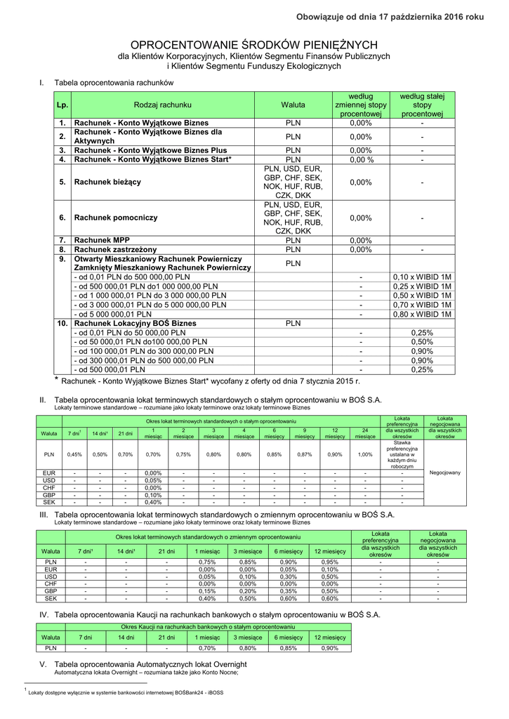 Obowiązuje od dnia 17 października 2016 roku OPROCENTOWANIE ŚRODKÓW PIENIĘŻNYCH dla Klientów Korporacyjnych, Klientów Segmentu Finansów Publicznych i Klientów Segmentu Funduszy Ekologicznych Tabela oprocentowania rachunków I. Lp. 3. 4. 5. Rachunek bieżący 6. Rachunek pomocniczy 2. PLN według stałej stopy procentowej - PLN 0,00% - PLN PLN PLN, USD, EUR, GBP, CHF, SEK, NOK, HUF, RUB, CZK, DKK PLN, USD, EUR, GBP, CHF, SEK, NOK, HUF, RUB, CZK, DKK PLN PLN 0,00% 0,00 % - 0,00% - 0,00% - Waluta Rachunek - Konto Wyjątkowe Biznes Rachunek - Konto Wyjątkowe Biznes dla Aktywnych Rachunek - Konto Wyjątkowe Biznes Plus Rachunek - Konto Wyjątkowe Biznes Start* 1. według zmiennej stopy procentowej 0,00% Rodzaj rachunku 7. 8. 9. Rachunek MPP 0,00% Rachunek zastrzeżony 0,00% Otwarty Mieszkaniowy Rachunek Powierniczy PLN Zamknięty Mieszkaniowy Rachunek Powierniczy - od 0,01 PLN do 500 000,00 PLN - od 500 000,01 PLN do1 000 000,00 PLN - od 1 000 000,01 PLN do 3 000 000,00 PLN - od 3 000 000,01 PLN do 5 000 000,00 PLN - od 5 000 000,01 PLN 10. Rachunek Lokacyjny BOŚ Biznes PLN - od 0,01 PLN do 50 000,00 PLN - od 50 000,01 PLN do100 000,00 PLN - od 100 000,01 PLN do 300 000,00 PLN - od 300 000,01 PLN do 500 000,00 PLN - od 500 000,01 PLN * Rachunek - Konto Wyjątkowe Biznes Start* wycofany z oferty od dnia 7 stycznia 2015 r. II. - 0,10 x WIBID 1M 0,25 x WIBID 1M 0,50 x WIBID 1M 0,70 x WIBID 1M 0,80 x WIBID 1M 0,25% 0,50% 0,90% 0,90% 0,25% Tabela oprocentowania lokat terminowych standardowych o stałym oprocentowaniu w BOŚ S.A. Lokaty terminowe standardowe – rozumiane jako lokaty terminowe oraz lokaty terminowe Biznes Okres lokat terminowych standardowych o stałym oprocentowaniu 21 dni 1 miesiąc 2 miesiące 3 miesiące 4 miesiące 6 miesięcy 9 miesięcy 12 miesięcy 24 miesiące 0,50% 0,70% 0,70% 0,75% 0,80% 0,80% 0,85% 0,87% 0,90% 1,00% - - 0,00% 0,05% 0,00% 0,10% 0,40% - - - - - - - Waluta 7 dni 1 14 dni¹ PLN 0,45% EUR USD CHF GBP SEK - Lokata preferencyjna dla wszystkich okresów Stawka preferencyjna ustalana w każdym dniu roboczym Lokata negocjowana dla wszystkich okresów - Negocjowany III. Tabela oprocentowania lokat terminowych standardowych o zmiennym oprocentowaniu w BOŚ S.A. Lokaty terminowe standardowe – rozumiane jako lokaty terminowe oraz lokaty terminowe Biznes Okres lokat terminowych standardowych o zmiennym oprocentowaniu Waluta 7 dni¹ 14 dni¹ 21 dni 1 miesiąc 3 miesiące 6 miesięcy 12 miesięcy PLN EUR USD CHF GBP SEK - - - 0,75% 0,00% 0,05% 0,00% 0,15% 0,40% 0,85% 0,00% 0,10% 0,00% 0,20% 0,50% 0,90% 0,05% 0,30% 0,00% 0,35% 0,60% 0,95% 0,10% 0,50% 0,00% 0,50% 0,60% Lokata preferencyjna dla wszystkich okresów - IV. Tabela oprocentowania Kaucji na rachunkach bankowych o stałym oprocentowaniu w BOŚ S.A. Okres Kaucji na rachunkach bankowych o stałym oprocentowaniu Waluta 7 dni 14 dni 21 dni 1 miesiąc 3 miesiące 6 miesięcy 12 miesięcy PLN - - - 0,70% 0,80% 0,85% 0,90% V. Tabela oprocentowania Automatycznych lokat Overnight Automatyczna lokata Overnight – rozumiana także jako Konto Nocne; 1 Lokaty dostępne wyłącznie w systemie bankowości internetowej BOŚBank24 - iBOSS Lokata negocjowana dla wszystkich okresów - Waluta PLN EUR Kwota Automatycznej lokaty Overnight - od 50 000,00 PLN do 100 000,00 PLN - od 100 000,01 PLN do 300 000,00 PLN - od 300 000,01 PLN do 500 000,00 PLN - od 500 000,01 PLN - od 15 000,00 EUR Oprocentowanie według stałej stopy procentowej 0,20 x WIBID O/N 0,30 x WIBID O/N 0,50 x WIBID O/N 0,40 x WIBID O/N 0,01% VI. Pozostałe Warunki 1. 2. 3. 4. * niepotrzebne skreślić Minimalna kwota wpłat wynosi: a. na rachunek lokat terminowych według stałej i zmiennej stopy procentowej – 10 000,00 PLN dla PLN lub równowartość 3 000,00 USD dla innych walut wymienialnych, b. na rachunek lokat preferencyjnych – 100 000,00 PLN, c. na rachunek lokat negocjowanych – 500 000,00 PLN dla PLN lub równowartość 100 000,00 PLN dla innych walut wymienialnych. Dla Kaucji na rachunkach bankowych o stałym oprocentowaniu w BOŚ S.A. na okres umowny do 1 roku (włącznie): a. kwota kaucji od 100 000,00 PLN uprawnia do uzyskania stawki preferencyjnej ustalanej w każdym dniu roboczym, b. kwota kaucji od 500 000,00 PLN uprawnia do negocjacji wysokości oprocentowania kaucji. W przypadku złożenia dyspozycji wypłaty środków pieniężnych z rachunku lokaty w złotych i w walutach wymienialnych przed upływem terminu umownego lokaty (zerwanie lokaty) odsetki nie przysługują. Stopa odsetek karnych dla niedozwolonych debetów na rachunkach we wszystkich walutach wynosi równowartość odsetek maksymalnych za opóźnienie ustalonych zgodnie z przepisami ustawy Kodeks cywilny.