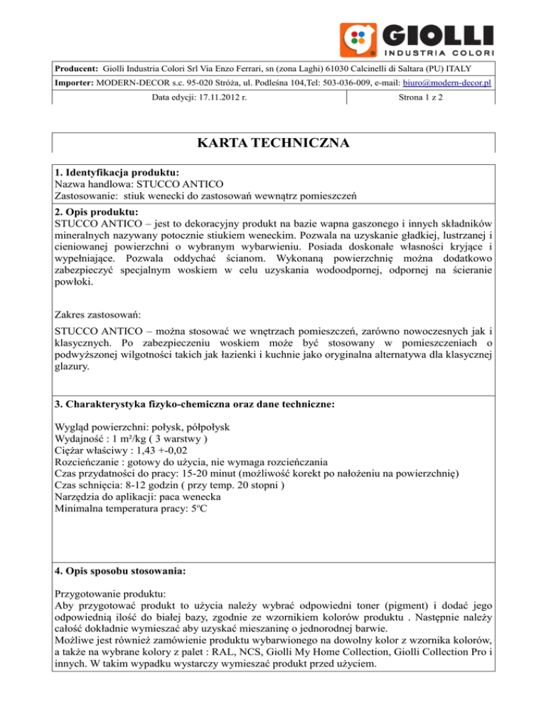 Producent: Giolli Industria Colori Srl Via Enzo Ferrari, sn (zona Laghi) 61030 Calcinelli di Saltara (PU) ITALY Importer: MODERN-DECOR s.c. 95-020 Stróża, ul. Podleśna 104,Tel: 503-036-009, e-mail: [email protected] Data edycji: 17.11.2012 r. Strona 1 z 2 KARTA TECHNICZNA 1. Identyfikacja produktu: Nazwa handlowa: STUCCO ANTICO Zastosowanie: stiuk wenecki do zastosowań wewnątrz pomieszczeń 2. Opis produktu: STUCCO ANTICO – jest to dekoracyjny produkt na bazie wapna gaszonego i innych składników mineralnych nazywany potocznie stiukiem weneckim. Pozwala na uzyskanie gładkiej, lustrzanej i cieniowanej powierzchni o wybranym wybarwieniu. Posiada doskonałe własności kryjące i wypełniające. Pozwala oddychać ścianom. Wykonaną powierzchnię można dodatkowo zabezpieczyć specjalnym woskiem w celu uzyskania wodoodpornej, odpornej na ścieranie powłoki. Zakres zastosowań: STUCCO ANTICO – można stosować we wnętrzach pomieszczeń, zarówno nowoczesnych jak i klasycznych. Po zabezpieczeniu woskiem może być stosowany w pomieszczeniach o podwyższonej wilgotności takich jak łazienki i kuchnie jako oryginalna alternatywa dla klasycznej glazury. 3. Charakterystyka fizyko-chemiczna oraz dane techniczne: Wygląd powierzchni: połysk, półpołysk Wydajność : 1 m²/kg ( 3 warstwy ) Ciężar właściwy : 1,43 +-0,02 Rozcieńczanie : gotowy do użycia, nie wymaga rozcieńczania Czas przydatności do pracy: 15-20 minut (możliwość korekt po nałożeniu na powierzchnię) Czas schnięcia: 8-12 godzin ( przy temp. 20 stopni ) Narzędzia do aplikacji: paca wenecka Minimalna temperatura pracy: 5oC 4. Opis sposobu stosowania: Przygotowanie produktu: Aby przygotować produkt to użycia należy wybrać odpowiedni toner (pigment) i dodać jego odpowiednią ilość do białej bazy, zgodnie ze wzornikiem kolorów produktu . Następnie należy całość dokładnie wymieszać aby uzyskać mieszaninę o jednorodnej barwie. Możliwe jest również zamówienie produktu wybarwionego na dowolny kolor z wzornika kolorów, a także na wybrane kolory z palet : RAL, NCS, Giolli My Home Collection, Giolli Collection Pro i innych. W takim wypadku wystarczy wymieszać produkt przed użyciem. Producent: Giolli Industria Colori Srl Via Enzo Ferrari, sn (zona Laghi) 61030 Calcinelli di Saltara (PU) ITALY Importer: MODERN-DECOR s.c. 95-020 Stróża, ul. Podleśna 104,Tel: 503-036-009, e-mail: [email protected] Data edycji: 17.11.2012 r. Strona 2 z 2 Przygotowanie powierzchni: Powierzchnia musi być sucha i gładka. Jeżeli to konieczne, należy usunąć luźne fragmenty i wyrównać powierzchnię. Do przygotowania powierzchni zalecamy masę szpachlową GIOLLISTUCCO IN POLVERE. Następnie powierzchnię należy zagruntować za pomocą wysokiej jakości gruntu akrylowego ( zalecany grunt ACRILFIX ). Po wyschnięciu należy powierzchnię pokryć produktem FONDO PER DECORATIVI LISCIO Nakładanie: Dla uzyskania optymalnego efektu należy nałożyć trzy warstwy produktu w odstępie 8-12 godzin każda. Dwie pierwsze warstwy należy nałożyć tak aby otrzymać możliwie gładką powierzchnię. Trzecią warstwę należy nakładać i polerować rantem pacy tak aby otrzymać błyszczącą, lustrzaną powierzchnię o wysokim połysku. Wykonaną powłokę można dodatkowo ( po całkowitym wyschnięciu, nie wcześniej niż po 24 godzinach ) zabezpieczyć specjalnym woskiem CERA PER STUCCO ANTICO, który umożliwi stosowanie powłok wykonanych stiukiem weneckim w pomieszczeniach o podwyższonej wilgotności ( łazienki, kuchnie ). 5. Bezpieczeństwo stosowania: W trakcie używania produktu powinny być stosowane standardowe metody ochrony przed substancjami chemicznymi.
