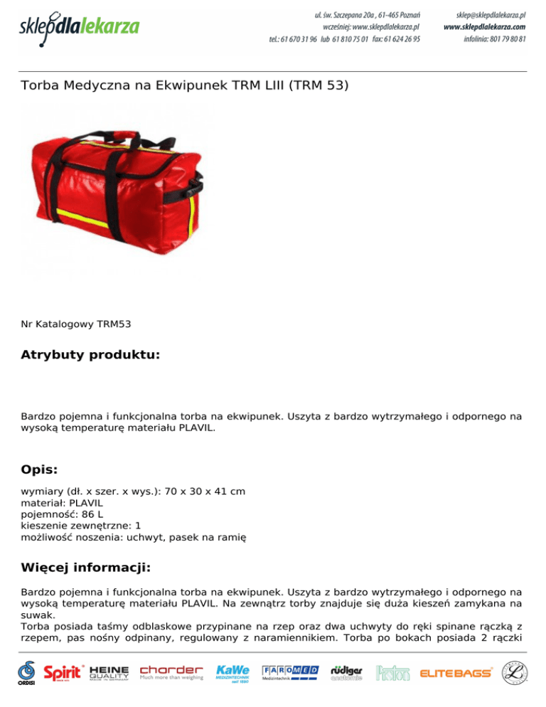 Torba Medyczna na Ekwipunek TRM LIII (TRM 53) Nr Katalogowy TRM53 Atrybuty produktu: Bardzo pojemna i funkcjonalna torba na ekwipunek. Uszyta z bardzo wytrzymałego i odpornego na wysoką temperaturę materiału PLAVIL. Opis: wymiary (dł. x szer. x wys.): 70 x 30 x 41 cm materiał: PLAVIL pojemność: 86 L kieszenie zewnętrzne: 1 możliwość noszenia: uchwyt, pasek na ramię Więcej informacji: Bardzo pojemna i funkcjonalna torba na ekwipunek. Uszyta z bardzo wytrzymałego i odpornego na wysoką temperaturę materiału PLAVIL. Na zewnątrz torby znajduje się duża kieszeń zamykana na suwak. Torba posiada taśmy odblaskowe przypinane na rzep oraz dwa uchwyty do ręki spinane rączką z rzepem, pas nośny odpinany, regulowany z naramiennikiem. Torba po bokach posiada 2 rączki gumowe. Spód torby zabezpieczony gumowymi stopkami typu „jeż”. Powered by TCPDF (www.tcpdf.org)