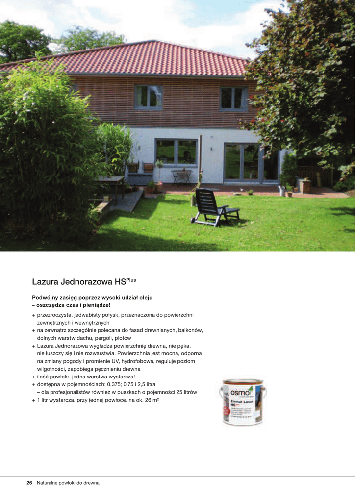 Lazura Jednorazowa HSPlus Podwójny zasięg poprzez wysoki udział oleju – oszczędza czas i pieniądze! + przezroczysta, jedwabisty połysk, przeznaczona do powierzchni zewnętrznych i wewnętrznych + na zewnątrz szczególnie polecana do fasad drewnianych, balkonów, dolnych warstw dachu, pergoli, płotów + Lazura Jednorazowa wygładza powierzchnię drewna, nie pęka, nie łuszczy się i nie rozwarstwia. Powierzchnia jest mocna, odporna na zmiany pogody i promienie UV, hydrofobowa, reguluje poziom wilgotności, zapobiega pęcznieniu drewna + ilość powłok: jedna warstwa wystarcza! + dostępna w pojemnościach: 0,375; 0,75 i 2,5 litra – dla profesjonalistów również w puszkach o pojemności 25 litrów + 1 litr wystarcza, przy jednej powłoce, na ok. 26 m² 26 | Naturalne powłoki do drewna 9211 Biały Świerk * na świerku 9236 Modrzew na świerku 9212 Srebrna Topola na świerku 9221 Sosna na świerku 9222 Naturalny Świerk * na świerku 9232 Mahoń na świerku 9233 Hemlock * na świerku 9234 Czerwień Skandynawska na świerku 9241 Dąb na świerku 9242 Zieleń Choinkowa na świerku 9252 Patyna na świerku 9261 Orzech na świerku 9262 Teak na świerku 9264 Palisander na świerku 9235 Czerwony Cedr na świerku * jasne przezroczyste powłoki dają jedynie nieznaczną ochronę UV, dlatego też zaleca się je stosować na powierzchniach mało narażonych na działanie promieni słonecznych. 9271 Heban na świerku Wskazówka: zaprezentowane kolory są oryginalnie sfotografowanymi drewnianymi wzorami. Mimo to mogą wystąpić odchylenia od rzeczywistych kolorów na skutek różnicy wydruku. Uzyskany efekt może różnić się w zależności od gatunku drewna, dlatego zaleca się wykonanie prób. ią liwośc z moż zenia nanos wania fo li bez sz niądze s i pie a z c a dz Oszczę orzystna 2 k am cena z ższa N a jw y ść o jn a w yd t ko w a i w yją ć jakoś Zewnętrzne powierzchnie drewniane | 27