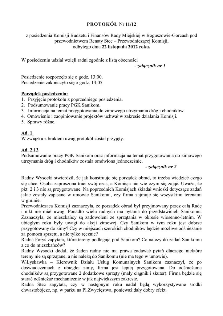 PROTOKÓŁ Nr 11/12 z posiedzenia Komisji Budżetu i Finansów Rady Miejskiej w Boguszowie-Gorcach pod przewodnictwem Renaty Stec – Przewodniczącej Komisji, odbytego dnia 22 listopada 2012 roku. W posiedzeniu udział wzięli radni zgodnie z listą obecności - załącznik nr 1 Posiedzenie rozpoczęło się o godz. 13:00. Posiedzenie zakończyło się o godz. 14:05. Porządek posiedzenia: 1. Przyjęcie protokołu z poprzedniego posiedzenia. 2. Podsumowanie pracy PGK Sanikom. 3. Informacja na temat przygotowania do zimowego utrzymania dróg i chodników. 4. Omówienie i zaopiniowanie projektów uchwał w zakresie działania Komisji. 5. Sprawy różne. Ad. 1 W związku z brakiem uwag protokół został przyjęty. Ad. 2 i 3 Podsumowanie pracy PGK Sanikom oraz informacja na temat przygotowania do zimowego utrzymania dróg i chodników została omówiona jednocześnie. - załącznik nr 2 Radny Wysocki stwierdził, że jak konstruuje się porządek obrad, to trzeba wiedzieć czego się chce. Osoba zaproszona traci swój czas, a Komisja nie wie czym się zająć. Uważa, że pkt. 2 i 3 nie są przygotowane. Na poprzednich Komisjach składał wnioski dotyczące zadań jakie zostały zapisane w umowie Sanikomu, czy firma zajmuje się wszystkimi terenami w gminie. Przewodnicząca Komisji zaznaczyła, że porządek obrad był przyjmowany przez całą Radę i nikt nie miał uwag. Ponadto wielu radnych ma pytania do przedstawicieli Sanikomu. Zaznaczyła, że mieszkańcy są zadowoleni ze sprzątania w okresie wiosenno-letnim. W ubiegłym roku były uwagi do akcji zimowej. Czy Sanikom w tym roku jest dobrze przygotowany do zimy? Czy w miejscach szerokich chodników będzie możliwe odśnieżanie za pomocą sprzętu, a nie tylko ręcznie? Radna Foryś zapytała, które tereny podlegają pod Sanikom? Co należy do zadań Sanikomu a co do mieszkańców? Radny Wysocki dodał, że żaden radny nie ma prawa zadawać pytań dlaczego niektóre tereny nie są sprzątane, a nie należą do Sanikomu (nie ma tego w umowie). W.Łyskawka – Kierownik Działu Usług Komunalnych Sanikom zaznaczył, że po doświadczeniach z ubiegłej zimy, firma jest lepiej przygotowana. Do odśnieżania chodników są przygotowane 2 dodatkowe sprzęty (mały ciągnik i skuter). Firma będzie się starać odśnieżać mechanicznie w jak największym zakresie. Radna Stec zapytała, czy w następnym roku nadal będą wykorzystywane środki chwastobójcze, np. w parku na Pl.Zwycięstwa, ponieważ dały dobry efekt. W. Łyskawka zaznaczył, że jeśli środki odniosły sukces, to będą wykorzystywane nadal, ale pod warunkiem, że Sanikom wygra ponownie przetarg. Radna Foryś zwolniła się – 13.30. Stan radnych – 6 osób. Radna Stec zapytała w jaki sposób rozwiązać problem wywozu skoszonej trawy z prywatnych posesji? A.Wojdyła – Prezes Sanikom potwierdził, że problem wywozu trawy będzie rozwiązany od dnia 01.07.2013 r., ponieważ ten rodzaj odpadów będzie wywożony. Burmistrz Miasta dodał, że osoby fizyczne będą mogły bez dodatkowych opłat dostarczyć odpady biodegradowalne ( w tym trawę) do punktu selektywnej zbiórki odpadów komunalnych (PSZOK).Dlatego opłata za odbiór nieczystości będzie musiała być skalkulowana biorąc pod uwagę także ten punkt. Zostaną przedstawione projekty uchwał w tym temacie. Przebieg tego procesu jest długotrwały. Trwają prace nad przygotowaniem modelu rozwiązania. Radna Stec zapytała czy liczba osób zatrudnionych do odśnieżania będzie tej zimy wystarczająca? W. Łyskawka poinformował, że jest zatrudnionych 14 osób, więc uważa, że to wystarczająca liczba. Zastępca Burmistrza dodał, że jest również podwykonawca, który również będzie uczestniczył w odśnieżaniu sprzętem. W. Łyskawka przedstawił sposoby przygotowania do akcji zimowej z uwzględnieniem uwag, które zostały przedstawione po poprzednim sezonie zimowym. Ad. 4 A) Projekt uchwały w sprawie zmian w Uchwale Budżetowej na rok 2012 omówiła Z.Mostowska – Skarbnik Miasta. – załącznik nr 3 Radni nie wnieśli uwag. Przewodnicząca poddała projekt uchwały pod głosowanie. Stanowisko Komisji: Komisja w głosowaniu jawnym, głosami 6 za pozytywnie zaopiniowała projekt uchwały. B) Projekt uchwały w sprawie ustalenia wysokości opłat za korzystanie z kolei linowej i wyciągu narciarskiego „Góra Dzikowiec” na sezon zimowy 2012/2013 przedstawił G.Urban – kierownik kolei linowej. – załącznik nr 4 Radni nie wnieśli uwag. Przewodnicząca poddała projekt uchwały pod głosowanie. Stanowisko Komisji: Komisja w głosowaniu jawnym, głosami 6 za pozytywnie zaopiniowała projekt uchwały. C) Projekt uchwały zmieniającej uchwałę w sprawie określenia wysokości stawek podatku od nieruchomości przedstawiła Z.Mostowska. - załącznik nr 5 Radny Wysocki zapytał czy chodzi o to, że inna stawka będzie od gabinetów a inna od pomieszczeń gospodarczych? Skarbnik Miasta zaznaczyła, że sprawę trzeba rozpatrywać w kontekście całej ustawy o działalności leczniczej, ponieważ dla organu podatkowego nie ma to znaczenia, jedynie zmienia się zapis. Stanowisko Komisji: Komisja w głosowaniu jawnym, głosami 6 za pozytywnie zaopiniowała projekt uchwały. D) Projekt uchwały zmieniającej uchwałę w sprawie określenia wzorów formularzy dotyczących informacji identyfikujących podmioty i przedmioty opodatkowania w zakresie podatku od nieruchomości omówiła Z.Mostowska. – załącznik nr 6 Radni nie wnieśli uwag. Przewodnicząca Komisji poddała projekt uchwały pod głosowanie. Stanowisko Komisji: Komisja w głosowaniu jawnym, głosami 6 za pozytywnie zaopiniowała projekt uchwały. Ad. 5 Radni nie zabrali głosu w sprawach różnych. Wobec wyczerpania porządku obrad Przewodnicząca Komisji zakończyła posiedzenie. Na tym protokół zakończono. Protokół sporządziła: Agnieszka Oldecka-Świetlik Przewodnicząca Komisji: Renata Stec Szczegółowy zapis posiedzenia 