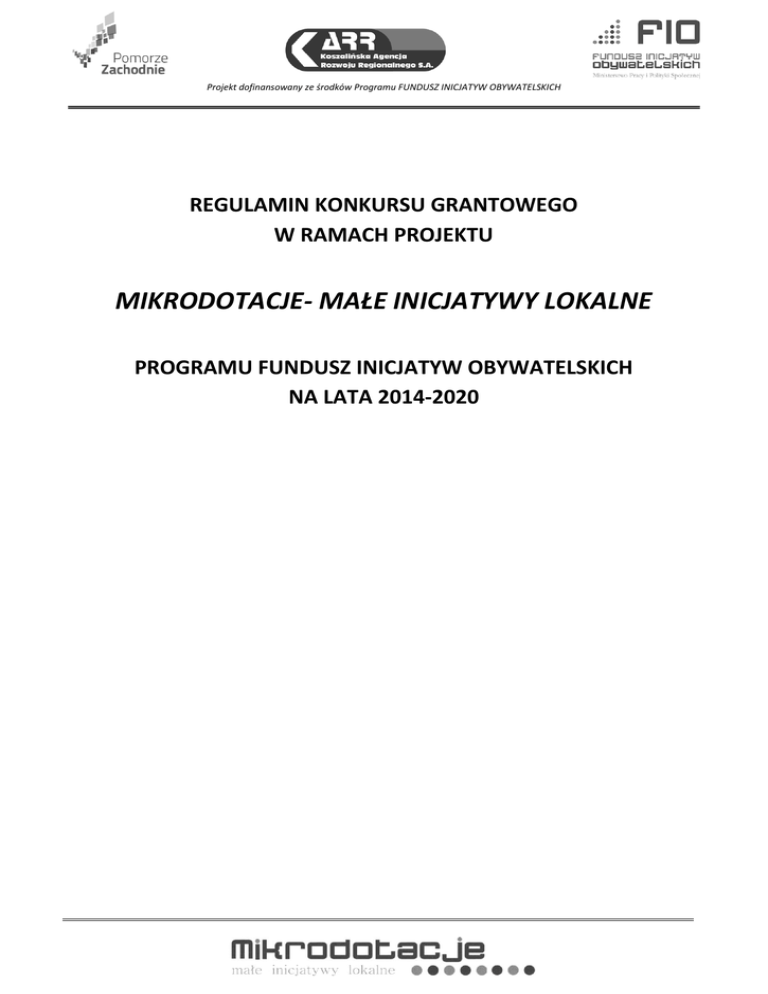Projekt dofinansowany ze środków Programu FUNDUSZ INICJATYW OBYWATELSKICH REGULAMIN KONKURSU GRANTOWEGO W RAMACH PROJEKTU MIKRODOTACJE- MAŁE INICJATYWY LOKALNE PROGRAMU FUNDUSZ INICJATYW OBYWATELSKICH NA LATA 2014-2020 Projekt dofinansowany ze środków Programu FUNDUSZ INICJATYW OBYWATELSKICH I. POSTANOWIENIA OGÓLNE 1.1 Regulamin określa zasady projektu „MIKRODOTACJE- Małe Inicjatywy Lokalne”, realizowanego przez Koszalińską Agencję Rozwoju Regionalnego S.A., zwaną dalej Operatorem, w partnerstwie z Urzędem Marszałkowskim Województwa Zachodniopomorskiego, stanowiącego część realizacji Programu Fundusz Inicjatyw Obywatelskich na lata 2014-2020. 1.2 Mikrodotacje zostaną przyznane zgodnie z art. 16 ust. 7 ustawy z dnia 24 kwietnia 2003 r. o działalności pożytku publicznego i o wolontariacie (dz. U. z 2010 r. Nr 234, poz. 654 z późn. zm.), zwaną dalej „Ustawą”. Środki na mikrogranty pochodzą z Programu Fundusz Inicjatyw Obywatelskich na lata 2014- 2020. 1.3 W ramach Projektu planuje się przyznanie 179 mikrodotacji w wysokości do 5 tys. zł. każda, o łącznej wartości 895 tys. zł. w drodze min. 3 konkursów (w 2014 roku przyznane zostanie 51 dotacji, w 2015 r. 64 dotacje, w 2016 r. 64 dotacje). 1.4 Projekt jest realizowany w okresie od 1 czerwca 2014 r. do 30 listopada 2016 roku. II. CELE PROJEKTU MIKRODOTACJE- MAŁE INICJATYWY LOKALNE 2.1 Wszystkie mikro-projekty realizowane dzięki dotacjom muszą pośrednio zmierzać do osiągnięcia celu głównego i celów szczegółowych Programu Fundusz Inicjatyw Obywatelskich na lata 2014-2020. Za cel główny przyjmuje się zwiększenie zaangażowania obywateli i organizacji pozarządowych w życie publiczne, który zrealizowany będzie poprzez: a) Zwiększenie ilości inicjatyw oddolnych. b) Wzrost liczby obywateli angażujących się w działania organizacji pozarządowych i inicjatywy lokalne. c) Wzrost partycypacji obywateli w sprawach publicznych. d) Wzmocnienie potencjału III sektora. 2.2 Zamierzeniem Projektu jest pomoc w rozwiązywaniu problemów społeczności lokalnych oraz wzmocnienie potencjału młodych organizacji pozarządowych poprzez realizację ww. celów. 2.3 Dotacje można przeznaczyć na dofinansowanie dwóch rodzajów mikro-projektów: 2.3.1 Realizacja inicjatywy oddolnej, czyli działania realizowanego w ramach dowolnej sfery pożytku publicznego, wg art. 4 ust. 1 „Ustawy” tj.: a) pomocy społecznej, w tym pomocy rodzinom i osobom w trudnej sytuacji życiowej oraz wyrównywania szans tych rodzin i osób, b) wspierania rodziny i systemu pieczy zastępczej, c) działalności na rzecz integracji i reintegracji zawodowej i społecznej osób zagrożonych wykluczeniem społecznym, d) działalności charytatywnej, e) podtrzymywania i upowszechniania tradycji narodowej, pielęgnowania polskości oraz rozwoju świadomości narodowej, obywatelskiej i kulturowej, f) działalności na rzecz mniejszości narodowych i etnicznych oraz języka regionalnego, g) ochrony i promocji zdrowia, h) działalności na rzecz osób niepełnosprawnych, i) promocji zatrudnienia i aktywizacji zawodowej osób pozostających bez pracy i zagrożonych zwolnieniem z pracy, j) działalności na rzecz równych praw kobiet i mężczyzn, k) działalności na rzecz osób w wieku emerytalnym, Projekt dofinansowany ze środków Programu FUNDUSZ INICJATYW OBYWATELSKICH l) działalności wspomagającej rozwój gospodarczy, w tym rozwój przedsiębiorczości, m) działalności wspomagającej rozwój techniki, wynalazczości i innowacyjności oraz rozpowszechnianie i wdrażanie nowych rozwiązań technicznych w praktyce gospodarczej, n) działalności wspomagającej rozwój wspólnot i społeczności lokalnych, o) nauki, szkolnictwa wyższego, edukacji, oświaty i wychowania, p) wypoczynku dzieci i młodzieży, q) kultury, sztuki, ochrony dóbr kultury i dziedzictwa narodowego, r) wspierania i upowszechniania kultury fizycznej, s) ekologii i ochrony zwierząt oraz ochrony dziedzictwa przyrodniczego, t) turystyki i krajoznawstwa, u) porządku i bezpieczeństwa publicznego, v) obronności państwa i działalności Sił Zbrojnych Rzeczypospolitej Polskiej, w) upowszechniania i ochrony wolności i praw człowieka oraz swobód obywatelskich, a także działań wspomagających rozwój demokracji, x) ratownictwa i ochrony ludności, y) pomocy ofiarom katastrof, klęsk żywiołowych, konfliktów zbrojnych i wojen w kraju i za granicą, z) upowszechniania i ochrony praw konsumentów, aa) działalności na rzecz integracji europejskiej oraz rozwijania kontaktów i współpracy między społeczeństwami, bb) promocji i organizacji wolontariatu, cc) pomocy Polonii i Polakom za granicą, dd) działalności na rzecz kombatantów i osób represjonowanych, ee) promocji Rzeczypospolitej Polskiej za granicą, ff) działalności na rzecz rodziny, macierzyństwa, rodzicielstwa, upowszechniania i ochrony praw dziecka, gg) przeciwdziałania uzależnieniom i patologiom społecznym, hh) działalności na rzecz organizacji pozarządowych oraz podmiotów wymienionych w art. 3 ust. 3 ustawy o działalności pożytku publicznego i o wolontariacie , w zakresie określonym w pkt 1-32. 2.3.2 Początkowy rozwój młodej organizacji pozarządowej lub innego podmiotu uprawnionego do wnioskowania (zgodnie z definicją określoną w części III Regulaminu) zarejestrowanego na terenie województwa zachodniopomorskiego poprzez: a) zakup sprzętu biurowego, sprzętu związanego z obszarem działań organizacji, oprogramowania komputerowego, b) adaptację lokalu (który organizacja ma prawo wykorzystywać dla swojej działalności przez okres co najmniej 6 m-cy po zakończeniu realizacji projektu w ramach zadania MIKRODOTACJE- Małe Inicjatywy Lokalne), c) podniesienie kwalifikacji pracowników lub wolontariuszy, d) częściowe finansowanie kosztów osobowych związanych z obsługą księgową, prawną lub informatyczną, e) poszerzenie zakresu świadczonych usług 