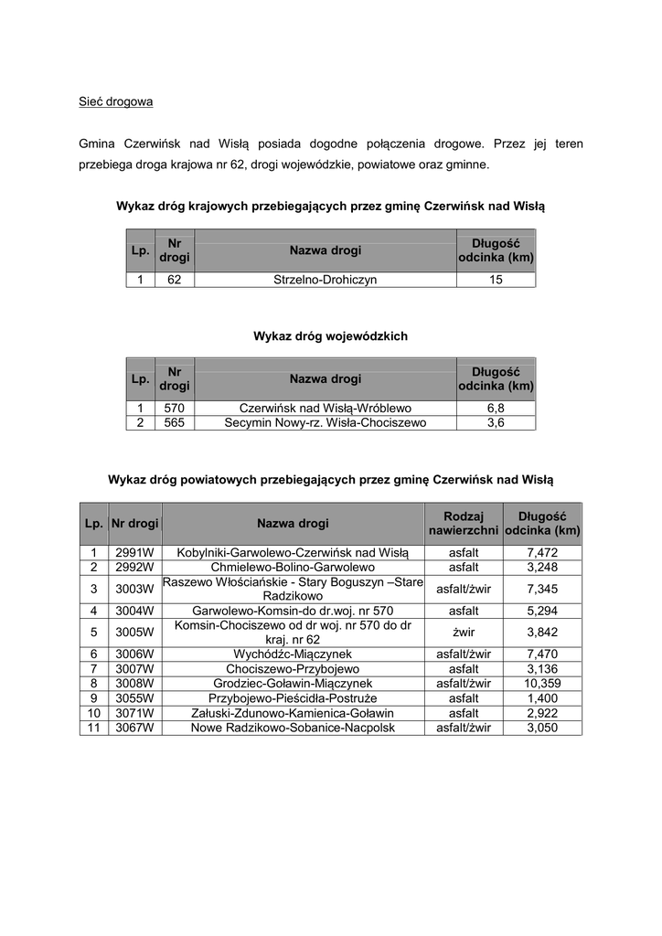 Sieć drogowa Gmina Czerwińsk nad Wisłą posiada dogodne połączenia drogowe. Przez jej teren przebiega droga krajowa nr 62, drogi wojewódzkie, powiatowe oraz gminne. Wykaz dróg krajowych przebiegających przez gminę Czerwińsk nad Wisłą Lp. Nr drogi Nazwa drogi Długość odcinka (km) 1 62 Strzelno-Drohiczyn 15 Wykaz dróg wojewódzkich Lp. Nr drogi Nazwa drogi Długość odcinka (km) 1 2 570 565 Czerwińsk nad Wisłą-Wróblewo Secymin Nowy-rz. Wisła-Chociszewo 6,8 3,6 Wykaz dróg powiatowych przebiegających przez gminę Czerwińsk nad Wisłą Lp. Nr drogi 1 2 2991W 2992W 3 3003W 4 3004W 5 3005W 6 7 8 9 10 11 3006W 3007W 3008W 3055W 3071W 3067W Nazwa drogi Kobylniki-Garwolewo-Czerwińsk nad Wisłą Chmielewo-Bolino-Garwolewo Raszewo Włościańskie - Stary Boguszyn –Stare Radzikowo Garwolewo-Komsin-do dr.woj. nr 570 Komsin-Chociszewo od dr woj. nr 570 do dr kraj. nr 62 Wychódźc-Miączynek Chociszewo-Przybojewo Grodziec-Goławin-Miączynek Przybojewo-Pieścidła-Postruże Załuski-Zdunowo-Kamienica-Goławin Nowe Radzikowo-Sobanice-Nacpolsk Rodzaj Długość nawierzchni odcinka (km) asfalt asfalt 7,472 3,248 asfalt/żwir 7,345 asfalt 5,294 żwir 3,842 asfalt/żwir asfalt asfalt/żwir asfalt asfalt asfalt/żwir 7,470 3,136 10,359 1,400 2,922 3,050 Wykaz dróg gminnych Lp. Nr drogi Nazwa drogi 1 2 3 4 5 300201W 300202W 300203W 300204W 300205W 6 300206W 7 300207W 8 300208W 9 10 11 12 13 14 15 16 17 18 19 20 21 22 23 24 25 26 27 28 29 30 31 300209W 300210W 300211W 300212W 300213W 300214W 300215W 300216W 300217W 300218W 300219W 300220W 300221W 300222W 300223W 300224W 300225W 300226W 300227W 300228W 300229W 300230W 300231W Raszewo Dworskie-Osiek Garwolewo-Osiek-gr.gminy (Łazęki) Stary Boguszyn-gr.gminy (Srebrna) Grodziec-gr.gminy (Strzembowo) Grodziec-gr.gminy (Pieścidła) gr.gminy(Pieścidła)-Łbowo-dr.powiatowa nr 3008W Nowe Przybojewo-gr.gminy (Wygoda Smoszewska) Raszewo Włościańskie-Gawarzec GórnyCzerwińsk nad Wisłą gr.gminy (Gródkowo)-Garwolewo Gawarzec Dolny-Stobiecin Janikowo-Stary Boguszyn Stare Radzikowo-Nowe Przybojewo Kuchary-Skotniki – Grodziec (Stanisławowo) Kuchary-Skotniki przez wieś Chociszewo - Roguszyn- Kuchary-Skotniki Roguszyn-Goławin Wilkowuje Kolonia-Chociszewo Radzikowo Scalone-Wilkowuje Kolonia dr.wojewódzka nr 570-Wilkowuje Kolonia Gawarzec Górny-dr.powiatowa nr 2991W gr.gminy-Majdany-Wola Garwolewo-Komsin Janikowo-Parlin Janikowo-Czerwińsk nad Wisłą Zdziarka-Czerwińsk nad Wisłą-Sielec-Wilkowuje dr.krajowa nr 62-Sielec Zdziarka-Wilkówiec-Wychódźc Zarębin-Wilkówiec Miączyn-dr.krajowa nr 62 Miączyn-Miączynek Wólka Przybojewska-dr.powiatowa nr 3008W Rodzaj Długość nawierzchni odcinka (km) żwirowa asfaltowa/żwirowa żwirowa asfaltowa/żwirowa żwirowa żwirowa żwirowa asfaltowa/żwirowa żwirowa żwirowa żwirowa żwirowa żwirowa żwirowa asfaltowa/żwirowa asfaltowa/żwirowa żwirowa żwirowa żwirowa żwirowa żwirowa żwirowa żwirowa asfalt żwirowa żwirowa żwirowa żwirowa żwirowa żwirowa asfaltowa/żwirowa 3,7 3,2 3,6 1,5 1,5 1,2 3,8 8,2 2,5 2,8 2,3 4,3 1,4 1,0 4,7 4,0 1,5 3,7 1,5 1,0 2,4 4,3 1,8 3,6 6,5 1,7 6,2 2,9 1,1 1,4 2,7