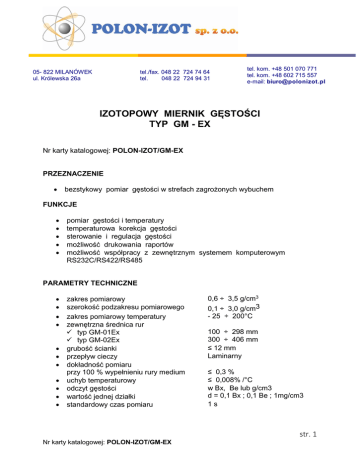 05- 822 MILANÓWEK ul. Królewska 26a tel./fax. 048 22 724 74 64 tel. 048 22 724 94 31 tel. kom. +48 501 070 771 tel. kom. +48 602 715 557 e-mail: [email protected] IZOTOPOWY MIERNIK GĘSTOŚCI TYP GM - EX Nr karty katalogowej: POLON-IZOT/GM-EX PRZEZNACZENIE bezstykowy pomiar gęstości w strefach zagrożonych wybuchem FUNKCJE pomiar gęstości i temperatury temperaturowa korekcja gęstości sterowanie i regulacja gęstości możliwość drukowania raportów możliwość współpracy z zewnętrznym systemem komputerowym RS232C/RS422/RS485 PARAMETRY TECHNICZNE zakres pomiarowy szerokość podzakresu pomiarowego zakres pomiarowy temperatury zewnętrzna średnica rur typ GM-01Ex typ GM-02Ex grubość ścianki przepływ cieczy dokładność pomiaru przy 100 % wypełnieniu rury medium uchyb temperaturowy odczyt gęstości wartość jednej działki standardowy czas pomiaru 0,6 ÷ 3,5 g/cm3 0,1 ÷ 3,0 g/cm3 - 25 ÷ 200°C 100 ÷ 298 mm 300 ÷ 406 mm ≤ 12 mm Laminarny ≤ 0,3 % ≤ 0,008% /°C w Bx, Be lub g/cm3 d = 0,1 Bx ; 0,1 Be ; 1mg/cm3 1s str. 1 Nr karty katalogowej: POLON-IZOT/GM-EX WYJŚCIA STANDARDOWE 4 wyjścia dwustanowe (opcjonalnie do 8) 2 wyjścia analogowe wyjście szeregowe komunikacja z komputerem (komputer nie wchodzi w skład gęstościomierza) Progi zadziałania wyjść tranzystorowych oraz zakresy działania wyjść analogowych ustawiane przy pomocy klawiatury. tranzystorowe typu otwarty dren obc. ≈ 24 V, 1A 0 ÷ 10 V, Imax = 10 mA 4 ÷ 20 mA, Robc= 0,5 kΩ RS232/RS422/RS485 do współpracy z komputerem protokół MODBUS-RTU WARUNKI PRACY temp. otoczenia : sterownik głowica wilgotność względna odporność na wibracje +5 ÷ +40°C -25 ÷ +55°C 20 ÷ 80 % H2O przy 20°C ≤0,5 gn przy f=15 ÷ 60Hz Sterownik i głowica posiada zabezpieczenie pyło i bryzgoszczelne dla stopnia ochrony IP-64 wg PN-93/E-08106. KDB Nr 92.216 elektrycznego urządzenia przeciwwybuchowego wg PN-83/E-08116 ZASILANIE napięcie częstotliwość pobór mocy 230V±15% 50 Hz ≤ 30 VA GABARYTY I CIĘŻAR głowica sterownik 750 x 560 x 360 mm ; ≤ 80 kg 400 x 400 x 210 mm ; ≤ 7 kg Zakład posiada Zezwolenie D-16408 Departamentu Nadzoru Zastosowań Promieniowania Jonizującego PAA na produkcję miernika. Instalację i uruchomienie gwarantuje producent str. 2 Nr karty katalogowej: POLON-IZOT/GM-EX