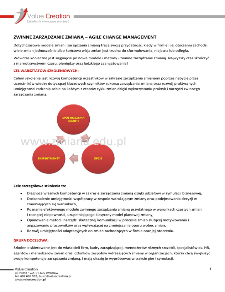 ZWINNE ZARZĄDZANIE ZMIANĄ – AGILE CHANGE MANAGEMENT Dotychczasowe modele zmian i zarządzania zmianą tracą swoją przydatność, kiedy w firmie i jej otoczeniu zachodzi wiele zmian jednocześnie albo końcowa wizja zmian jest trudna do sformułowania, niejasna lub odległa. Wówczas konieczne jest sięgnięcie po nowe modele i metody - zwinne zarządzanie zmianą. Najwyższy czas skończyć z marnotrawstwem czasu, pieniędzy oraz ludzkiego zaangażowania! CEL WARSZTATÓW SZKOLENIOWYCH: Celem szkolenia jest rozwój kompetencji uczestników w zakresie zarządzania zmianami poprzez nabycie przez uczestników wiedzy dotyczącej kluczowych czynników sukcesu zarządzania zmianą oraz rozwój praktycznych umiejętności radzenia sobie na każdym z etapów cyklu zmian dzięki wykorzystaniu praktyk i narzędzi zwinnego zarządzania zmianą. Cele szczegółowe szkolenia to: Diagnoza własnych kompetencji w zakresie zarządzania zmianą dzięki udziałowi w symulacji biznesowej, Doskonalenie umiejętności współpracy w zespole wdrażającym zmiany oraz podejmowania decyzji w zmieniających się warunkach, Poznanie efektywnego modelu zwinnego zarządzania zmianą przydatnego w warunkach częstych zmian i rosnącej niepewności, uzupełniającego klasyczny model planowej zmiany, Opanowanie metod i narzędzi skutecznej komunikacji w procesie zmian służącej motywowaniu i angażowaniu pracowników oraz wpływającej na zmniejszanie oporu wobec zmian, Rozwój umiejętności adaptacyjnych do zmian zachodzących w firmie oraz jej otoczeniu. GRUPA DOCELOWA: Szkolenie skierowane jest do właścicieli firm, kadry zarządzającej, menedżerów różnych szczebli, specjalistów ds. HR, agentów i menedżerów zmian oraz członków zespołów wdrażających zmiany w organizacjach, którzy chcą zwiększyć swoje kompetencje zarządzania zmianą, i mają okazję je wypróbować w trakcie gier i symulacji. 1 KORZYŚCI ZE SZKOLENIA: Odnoszące się do obszaru wiedzy przekazywanej na szkoleniu: • • • Rozszerzenie wiedzy uczestników dotyczącej istotnych czynników powodzenia zarządzania zmianą, Zdobycie wiedzy o strategii i taktykach wdrażania zmian w firmie w oparciu o cykl zwinnego zarządzania zmianą, Rozszerzenie wiedzy o metodach diagnozy sytuacji w firmie, wyboru opcji działań, radzenia sobie z reakcjami wobec zmian oraz komunikacji zmian. Odnoszące się do obszaru praktycznych umiejętności: • • • • Zwiększenie umiejętności pozwalających na unikanie istotnych błędów na każdym z etapów cyklu zarządzania zmianą, Udoskonalenie umiejętność wykorzystywania zwinnych praktyk i narzędzi zarządzania zmianą oraz rewizji taktyki w odpowiedzi na zmiany zachodzące w organizacji i reakcje pracowników, Rozwinięcie umiejętności współpracy w zespole kierującym zmianami i wymiany doświadczeń pomiędzy osobami zaangażowanymi w zmiany (sprawdzane w ramach prowadzonej w trakcie szkolenia symulacji menedżerskiej), Rozwinięcie umiejętności komunikowania zmian pracownikom w oparciu o praktyki zwinne (kanwy i wzorce, radiator informacji, spotkania Lean Coffee itp.) Odnoszące się do rozwoju świadomości i budowanych postaw: • • Uświadomienie sobie przez uczestników roli działań podejmowanych przez menedżerów (przełożonych) i agentów zmian na każdym z etapów procesu zmian, Zbudowanie pozytywnego nastawienia do strategii zarządzania zmianą uwzględniającej skuteczne przywództwo, efektywną komunikację zmian oraz partycypację pracowników. METODYKA: analiza przypadków, ćwiczenia, praca indywidualna i grupowa, gry i symulacje, dyskusja moderowana, krótki wykład. PROGRAM: 1. Współczesne trendy w zmianach organizacyjnych • • • • • Opór i chaos jako nieodłączne składowe zmian - Model Lewina to za mało w „burzliwych czasach”, Jakie są zachowania pracowników oraz wydajność organizacji na każdym z pięciu etapów procesu zmian, Zmiana schematu i podejścia do zarządzania zmianą w firmie, Czy „stare metody” jeszcze działają? Klasyczne i współczesne modele zarządzania zmianą, Najnowsze trendy w zmianach organizacyjnych – Zwinne zarządzanie zmianą (Agile Change Management) 2 2. Praktyka zarządzania zmianą – symulacja biznesowa Agile Change Masters v. 2015 • • • Wprowadzenie do symulacji Agile Change Masters, Postawy pracowników wobec zmian - opór czy reakcja na zmiany? Przełamywanie oporu? – nie tędy droga. 7 taktyk radzenia sobie z reakcjami wobec zmian. 3. Cykl zwinnegogo zarządzania zmianą – krok po kroku • • • • Jak nie wywrócić firmy w czasie zmian? Cykl zwinnego zarządzania zmianą o wykorzystanie kanwy zmian, o budowanie zaangażowania pracowników w zmiany, Narzędzia i metody używane w fazie diagnozy (spostrzeżeń): o nieformalne spotkania Lean Coffee, o retrospektywy, o wywiady z pracownikami i klientami, o badania (np. kultury organizacyjnej, dysfunkcji pracy zespołowej itp.) Wybór właściwych opcji – taktyka wdrożenia: o trzy kluczowe kryteria oceny opcji działania, o klasyfikacja opcji z użyciem listy kontrolnej lub tablicy Kanban, o weryfikacja planu zmiany, Eksperymenty – istota zwinnego i szczupłego zarządzania zmianą: o stawianie hipotez dla eksperymentów (szablon hipotezy), o weryfikacja eksperymentu – poszukiwanie informacji zwrotnych, pomiary, 4. Podsumowanie warsztatów TRENER WIODĄCY: dr Jarosław Rubin Trener biznesu i konsultant zarządzania. Doktor nauk ekonomicznych w dyscyplinie zarządzanie. Ukończył Politechnikę Wrocławską oraz studia Executive MBA na Akademii Ekonomicznej we Wrocławiu. Zajmował stanowiska związane z zarządzaniem oraz marketingiem i sprzedażą w firmach polskich i międzynarodowych od reprezentanta handlowego i doradcy technicznego, poprzez dyrektora ds. marketingu, do dyrektora-prokurenta spółki. Specjalizuje się w problematyce zarządzania, w szczególności zarządzania zmianą i zarządzania ludźmi or