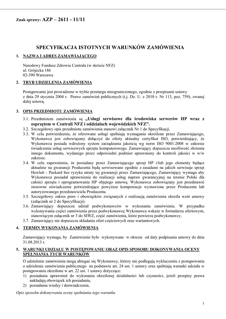 Znak sprawy: AZP – 2611 - 11/11 SPECYFIKACJA ISTOTNYCH WARUNKÓW ZAMÓWIENIA 1. NAZWA I ADRES ZAMAWIAJĄCEGO Narodowy Fundusz Zdrowia Centrala (w skrócie NFZ) ul. Grójecka 186 02-390 Warszawa 2. TRYB UDZIELENIA ZAMÓWIENIA Postępowanie jest prowadzone w trybie przetargu nieograniczonego, zgodnie z przepisami ustawy z dnia 29 stycznia 2004 r. Prawo zamówień publicznych (t.j. Dz. U. z 2010 r. Nr 113, poz. 759), zwanej dalej ustawą. 3. OPIS PRZEDMIOTU ZAMÓWIENIA 3.1. Przedmiotem zamówienia są „Usługi serwisowe dla środowiska serwerów HP wraz z osprzętem w Centrali NFZ i oddziałach wojewódzkich NFZ”. 3.2. Szczegółowy opis przedmiotu zamówienia stanowi załącznik Nr 1 do Specyfikacji. 3.3. W celu potwierdzenia, że oferowane usługi spełniają wymagania określone przez Zamawiającego, Wykonawca jest zobowiązany dołączyć do oferty aktualny certyfikat ISO, potwierdzający, że Wykonawca posiada wdrożony system zarządzania jakością wg norm ISO 9001:2008 w zakresie świadczenia usług serwisowych sprzętu komputerowego. Zamawiający dopuszcza możliwość złożenia innego dokumentu, wydanego przez odpowiedni podmiot uprawniony do kontroli jakości w w/w zakresie. 3.4. W celu zapewnienia, że posiadany przez Zamawiającego sprzęt HP i/lub jego elementy będące aktualnie na gwarancji Producenta będą serwisowane zgodnie z zasadami na jakich serwisuje sprzęt Hewlett - Packard bez ryzyka utraty tej gwarancji przez Zamawiającego, Zamawiający wymaga aby Wykonawca posiadał uprawnienia do realizacji usług napraw gwarancyjnej na terenie Polski dla całości sprzętu i oprogramowania HP objętego umową. Wykonawca zobowiązany jest przedstawić stosowne oświadczenie potwierdzające powyższe kompetencje wystawione przez Producenta lub autoryzowanego przedstawiciela Producenta. 3.5. Szczegółowy zakres praw i obowiązków związanych z realizacją zamówienia określa wzór umowy (załącznik nr 2 do Specyfikacji). 3.6. Zamawiający dopuszcza udział podwykonawców w wykonaniu zamówienia. W przypadku wykonywania części zamówienia przez podwykonawcę Wykonawca wskaże w formularzu ofertowym, stanowiącym załącznik nr 3 do SIWZ, część zamówienia, które powierza podwykonawcy. 3.7. Zamawiający nie dopuszcza składania ofert częściowych oraz wariantowych. 4. TERMIN WYKONANIA ZAMÓWIENIA Zamawiający wymaga, by Zamówienie było wykonywane w okresie od daty podpisania umowy do dnia 31.08.2013 r. 5. WARUNKI UDZIAŁU W POSTĘPOWANIU ORAZ OPIS SPOSOBU DOKONYWANIA OCENY SPEŁNIANIA TYCH WARUNKÓW O udzielenie zamówienia mogą ubiegać się Wykonawcy, którzy nie podlegają wykluczeniu z postępowania o udzielenie zamówienia publicznego na podstawie art. 24 ust. 1 ustawy oraz spełniają warunki udziału w postępowaniu określone w art. 22 ust. 1 ustawy dotyczące: 1) posiadania uprawnień do wykonania określonej działalności lub czynności, jeżeli przepisy prawa nakładają obowiązek ich posiadania, 2) posiadania wiedzy i doświadczenia, Opis sposobu dokonywania oceny spełniania tego warunku 1 - wykażą się, że wykonali (a w przypadku świadczeń okresowych lub ciągłych uwzględniane są również wykonywane) w okresie ostatnich trzech lat przed upływem terminu składania ofert , a jeżeli okres prowadzenia działalności jest krótszy – w tym okresie, • co najmniej 2 usługi, każda trwająca przez co najmniej 12 miesięcy polegające na świadczeniu w języku polskim serwisu opartego o serwery HP klasy x86 zawierająca HP Blade System oraz HP Proliant Server, każda o wartości przekraczającej 1.000.000,00 zł brutto, • co najmniej 2 usługi, każda trwająca przez co najmniej 12 miesięcy, na usługę serwisu pogwarancyjnego środowiska rozproszonego HA (minimum 5 odrębnych lokalizacji), świadczonego w języku polskim. Każda umowa o wartości minimum 5 000 000,00 zł brutto obejmująca minimum następujący sprzęt i oprogramowanie: 2 serwery z systemem operacyjnym HP-UX na procesorach PA-RISC i/lub Integrity dla każdej z 5 lokalizacji (łącznie minimum 10 serwerów) 2 macierze HP klasy Mid-Range i/lub Enterprise (np. HP EVA lub XP) bibliotekę HP MSL i/lub ESL przełącznik LAN typu Procurve i/lub SAN HP Storage Works • co najmniej 2 usługi, każda trwająca przez co najmniej 12 miesięcy polegające na świadczeniu serwisu oraz dostarczaniu nowych wersji oprogramowania i modyfikacji (ang. patches), świadczonych w języku polskim, o wartości sumarycznej minimum 500 000,00 zł brutto w tym dla niżej wymienionego oprogramowania: HP DataProtector HP Open View NNM HP ServiceGuard 3) dysponowania odpowiednim potencjałem technicznym oraz osobami zdolnymi do wykonywania zamówienia, 4) sytuacji ekonomicznej i finansowej. Opis sposobu dokonywania oceny spełniania tego warunku - wykażą się posiadaniem środków finansowych lub zdolności kredytowej w wysokości nie mniejszej niż 2 000 000,00 zł. Ocena spełniania warunków zostanie dokonana według formuły „spełnia” / „nie spełnia” warunków udziału w postępowaniu w oparciu o informacje zawarte w dokumentach i oświadczeniach zawartych w pkt 6 Specyfikacji. Nie spełnienie warunków udziału w postępowaniu skutkować będzie wykluczeniem Wykonawcy z postępowania. 6. WYKAZ OŚWIADCZEŃ LUB DOKUMENTÓW, JAKIE MAJĄ DOSTARCZYĆ WYKONAWCY W CELU POTWIERDZENIA SPEŁNIANIA WARUNKÓW UDZIAŁU W POSTĘPOWANIU 6.1. W celu potwierdzenia spełniania warunków udziału w postępowaniu Wykonawca zobowiązany jest załączyć do oferty następujące dokumenty i oświadczenia: 6.1.1. Oświadczenie o spełnianiu warunków udziału w postępowaniu zgodnie z załącznikiem nr 4 do Specyfikacji. 6.1.2. Wykaz wykonanych usług wraz z dokumentami, że usługi te zostały wykonane należycie. Wykonawca zobowiązany jest przedstawić pisemny wykaz wykonanych (a w przypadku świadczeń okresowych lub ciągłych uwzględniane są również wykonywane) w okresie ostatnich trzech lat p