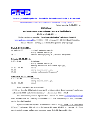 Stowarzyszenie Inżynierów i Techników Pożarnictwa Oddział w Katowicach ________________________________________________________________________ 40-042 KATOWICE, ul. Wita Stwosza 36 tel./ fax. 032 6040169 www.sitp.katowice.pl _______________________________________________________________________________________________________________________________________________________________________________________________________________________________________________ Katowice, dn. 8.02.2011 r. PROGRAM weekendu sportowo-rekreacyjnego w Korbielowie 25.02 - 27.02.2011r. Miejsce zakwaterowania – Pensjonat „Połonina”, ul.Szczyrbok 56 www.polonina.com.pl tel. 033 8634033, tel.kom. 601 381835 Pani Madejska. Dojazd własny – parking u podnóŜa Pensjonatu, przy wyciągu. Piątek 25.02.2011r. od godz.14.00 19.00 - przyjazd, zakwaterowanie, - sporty zimowe, rekreacja, - wieczór folklorystyczny w „Karczmie Szczyrbok”. Sobota 26.02.2011r. 8.30 – 9.30 14.30 – 15.30 16.00 19.00 - śniadanie, sporty zimowe, rekreacja, zawody narciarskie (trasa obok wyciągu), obiad, sporty zimowe, rekreacja, kolacja w „Karczmie Szczyrbok”. Niedziela 27.02.2011r. 9.00 – 10.00 12.30 – 13.30 - śniadanie, - sporty zimowe, rekreacja, - obiad. Koszt uczestnictwa w wysokości: - 300zł os. dorosła, 150zł dzieci (powyŜej 7-lat) i młodzieŜ, dzieci młodsze bezpłatnie, - członkowie SITP O/Katowice i rodziny – odpowiednio 200 i 100 zł. Zainteresowani powinni zgłosić chęć udziału na adres [email protected] bądź telefonicznie kol. Andrzej Płóciniczak – 502 651 558 (z danymi imię, nazwisko, osoba dorosła/dziecko). Wpłaty naleŜy dokonywać przelewem na konto nr 97 1050 1272 1000 0022 0976 4279 (Andrzej Płóciniczak – Dąbrowa Górnicza 42-520 ul. Lanego 15). Zgłoszenia potwierdzone wpłatą przyjmowane są do dnia 18 lutego 2011 r. W przypadku nieobecności uiszczona kwota przeznaczona zostanie na pokrycie kosztów organizacyjnych. Z koleŜeńskim pozdrowieniem: Ryszard Siata O t r z y m u j ą : Zarząd Oddziału SITP Katowice Koło SITP Bytom Koło SITP Częstochowa Koło SITP Katowice Koło SITP Katowice Centrum Koło SITP Legnica Koło SITP Południe Koło SITP Pszczyna Koło SITP Śląsk Centrum Koło SITP Zagłębie