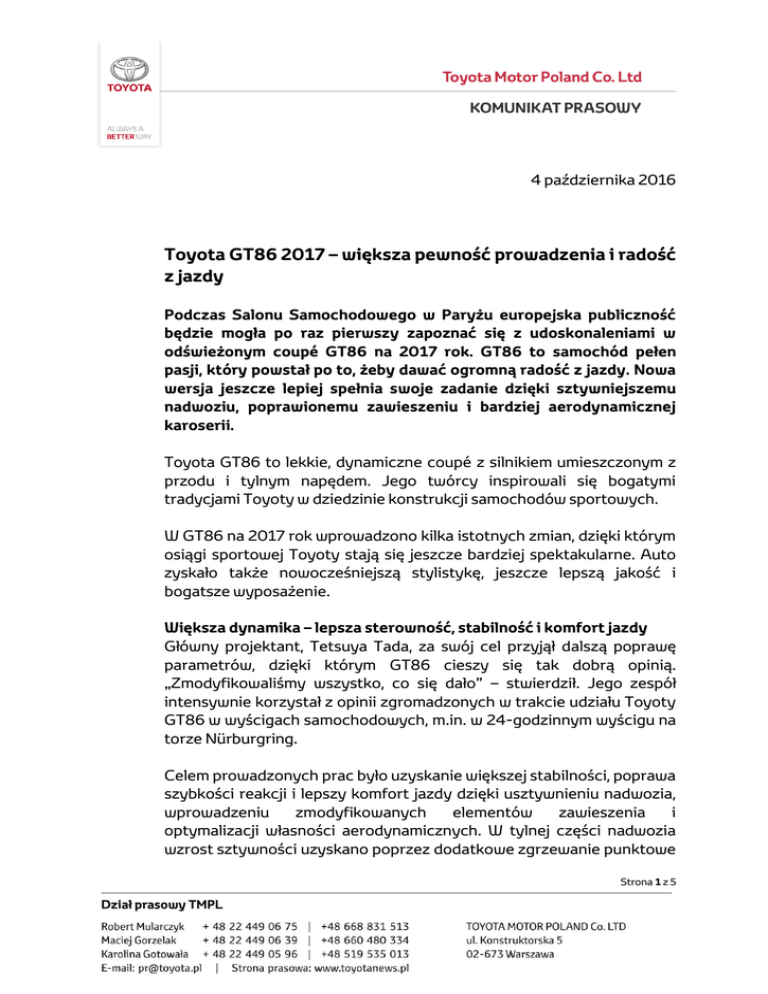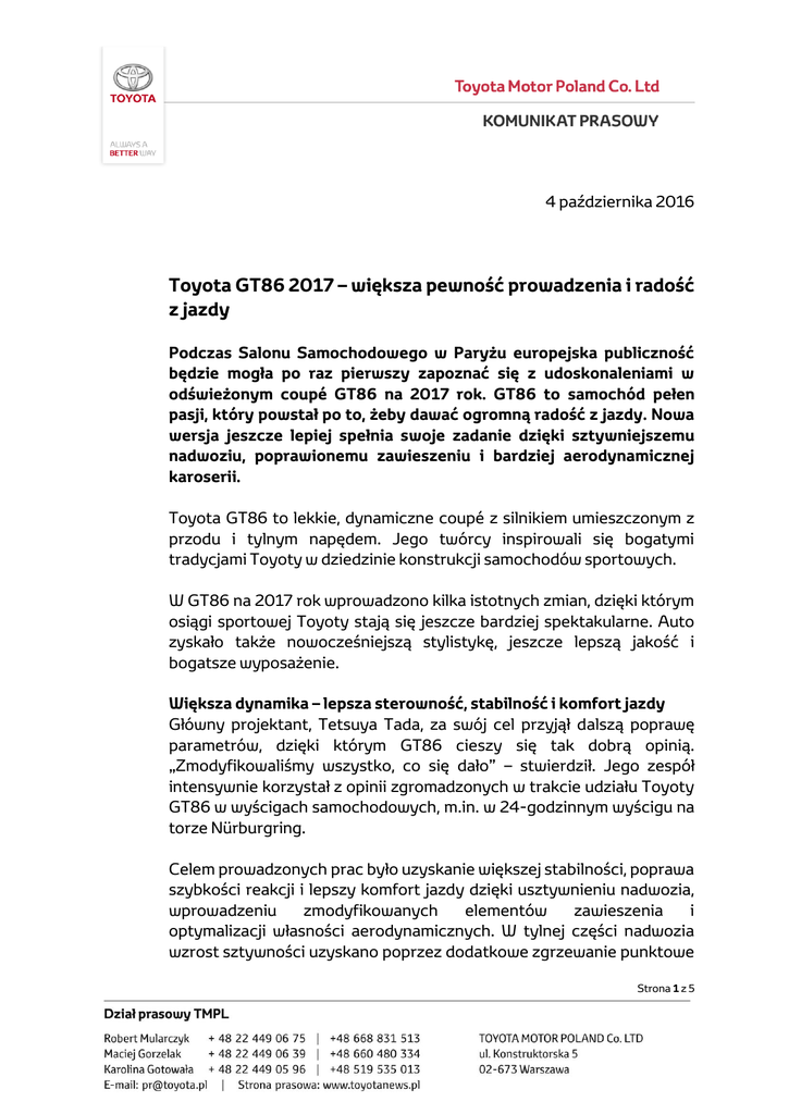 4 października 2016 Toyota GT86 2017 – większa pewność prowadzenia i radość z jazdy Podczas Salonu Samochodowego w Paryżu europejska publiczność będzie mogła po raz pierwszy zapoznać się z udoskonaleniami w odświeżonym coupé GT86 na 2017 rok. GT86 to samochód pełen pasji, który powstał po to, żeby dawać ogromną radość z jazdy. Nowa wersja jeszcze lepiej spełnia swoje zadanie dzięki sztywniejszemu nadwoziu, poprawionemu zawieszeniu i bardziej aerodynamicznej karoserii. Toyota GT86 to lekkie, dynamiczne coupé z silnikiem umieszczonym z przodu i tylnym napędem. Jego twórcy inspirowali się bogatymi tradycjami Toyoty w dziedzinie konstrukcji samochodów sportowych. W GT86 na 2017 rok wprowadzono kilka istotnych zmian, dzięki którym osiągi sportowej Toyoty stają się jeszcze bardziej spektakularne. Auto zyskało także nowocześniejszą stylistykę, jeszcze lepszą jakość i bogatsze wyposażenie. Większa dynamika – lepsza sterowność, stabilność i komfort jazdy Główny projektant, Tetsuya Tada, za swój cel przyjął dalszą poprawę parametrów, dzięki którym GT86 cieszy się tak dobrą opinią. „Zmodyfikowaliśmy wszystko, co się dało” – stwierdził. Jego zespół intensywnie korzystał z opinii zgromadzonych w trakcie udziału Toyoty GT86 w wyścigach samochodowych, m.in. w 24-godzinnym wyścigu na torze Nürburgring. Celem prowadzonych prac było uzyskanie większej stabilności, poprawa szybkości reakcji i lepszy komfort jazdy dzięki usztywnieniu nadwozia, wprowadzeniu zmodyfikowanych elementów zawieszenia i optymalizacji własności aerodynamicznych. W tylnej części nadwozia wzrost sztywności uzyskano poprzez dodatkowe zgrzewanie punktowe Strona 1 z 5 przy słupkach oraz zwiększenie grubości niektórych elementów tylnego panelu i wsporników. Poprawę stabilności i komfortu jazdy udało się osiągnąć dzięki zastosowaniu nowych sprężyn zawieszenia i odpowiednio dostrojonych amortyzatorów marki Showa. Klienci, którzy preferują bardziej sportową jazdę, będą mogli skorzystać z opcji zainstalowania amortyzatorów Sachs (pakiet Sport). Zmiany aerodynamiki obejmują niższy przód pojazdu, modyfikacje przedniego i tylnego zderzaka oraz dodanie z przodu i po bokach karoserii opływowych elementów w celu zoptymalizowania przepływu powietrza. Auto napędza kompaktowy, umieszczony z przodu pojazdu silnik wolnossący 2.0 o mocy 200 KM typu bokser z przeciwsobnym układem cylindrów w płaszczyźnie poziomej. 6-biegowa przekładnia manualna lub automatyczna skrzynia biegów ECT przenosi napęd na tylną oś. Stylistyka nadwozia – dynamiczna sylwetka i lepsza aerodynamika Zmiany w stylistyce nadwozia GT86 pozwoliły poprawić parametry aerodynamiczne pojazdu. Sportowe coupé wygląda jeszcze nowocześniej i bardziej wyróżnia się na drodze. Przeprojektowanie przedniej części auta objęło szerszy, nisko osadzony grill i wyraźnie zaznaczoną dolną listwę przedniego zderzaka ze zintegrowanymi elementami opływowymi. Zmodernizowany przód pojazdu podkreśla jego nisko zawieszoną sylwetkę i zapowiada dynamiczną jazdę. Auto otrzymało także nowy profil aerodynamiczny na przodzie nadwozia i nowe osłony świateł przeciwmgielnych: trzy poprzeczne pasy mają opływowy kształt i znakomicie pasują do całości. Zmodyfikowano także reflektory – w stylistyce podkreślono linie poziome, a ponadto zastosowano nowe lampy typu bi-LED (światła mijania i drogowe). Kierunkowskazy stanowią teraz rzędy pojedynczych diod LED pod ukośnymi liniami białych diod tworzących światła do jazdy dziennej. Ozdobne elementy na szczycie przednich błotników również wyposażono w aerodynamiczne profile. W przypadku modelu 2017 Strona 2 z 5 dostępne są nowe, 17-calowe obręcze kół z cienkimi szprychami wykonane z lekkich stopów, w kolorze ciemnoszarym, o polerowanej powierzchni. Z tyłu pojazdu wprowadzono analogiczne zmiany, które podkreślają nisko zawieszone nadwozie i mocny wygląd. Szerszy i ciemniejszy dyfuzor tworzy wyraźny trapez, który znajduje się na tyle nisko, że zasłania tłumik. Dodatkowo poprawiono aerodynamikę tylnego spojlera i zmodyfikowano tylne reflektory LED, w których wyraźniej podkreślono linie poziome i zastosowano światłowody zwiększające widoczność auta. W nowych kierunkowskazach również wykorzystano technologię LED. Wyższa jakość wnętrza Nowe elementy wyposażenia i sposób wykończenia wnętrza jednoznacznie akcentują charakter GT86, samochodu przeznaczonego dla prawdziwych miłośników jazdy. Świadczy o tym wygląd poszczególnych elementów oraz materiały, z jakich je wykonano. Nowa trójramienna kierownica o średnicy 362 mm jest najmniejszą kierownicą, jaką do tej pory zamontowano w produkcyjnym modelu Toyoty. Zaprojektowano ją w taki sposób, by zagwarantować kierowcy możliwie najwygodniejszy chwyt i przyjemność z prowadzenia. Pośrodku znajduje się posrebrzane logo modelu 86, a w wykończeniu powierzchni zastosowano efekt skrawanego metalu. Na kierownicy znajdują się dodatkowe kontrolki do sterowania nowym systemem audio i wielofunkcyjnym wyświetlaczem TFT o przekątnej 4,2 cala. Wyświetlacz TFT znajduje się na zmodyfikowanej tablicy rozdzielczej z trzema zegarami. Na ekranie można sprawdzić informacje o zużyciu paliwa i przejechanej trasie, a także dane związane ze sportową jazdą, np. monitor przeciążenia, wykresy mocy i momentu obrotowego oraz stoper. Obrotomierz zmodyfikowano w taki sposób, że wartość 7000 obr./min, przy której auto osiąga największą moc, znajduje się na górze wskaźnika. GT86 jest samochodem dla prawdziwych miłośników ostrej jazdy – świadczy o tym choćby nowy, przełączany tryb TRACK, w którym można określić stopień elektronicznej kontroli stabilności toru jazdy i Strona 3 z 5 przyczepności; dostępna jest także opcja całkowitego wyłączenia kontroli. Czarna deska rozdzielcza o jednolitej 