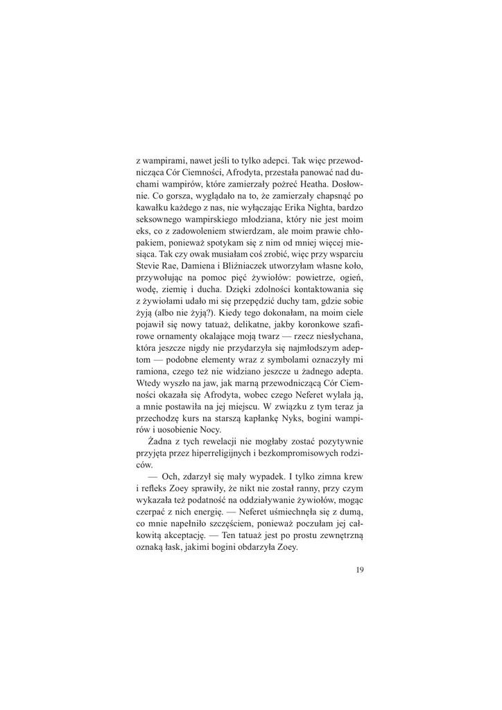 z wampirami, nawet jeśli to tylko adepci. Tak więc przewodnicząca Cór Ciemności, Afrodyta, przestała panować nad duchami wampirów, które zamierzały pożreć Heatha. Dosłownie. Co gorsza, wyglądało na to, że zamierzały chapsnąć po kawałku każdego z nas, nie wyłączając Erika Nighta, bardzo seksownego wampirskiego młodziana, który nie jest moim eks, co z zadowoleniem stwierdzam, ale moim prawie chłopakiem, ponieważ spotykam się z nim od mniej więcej miesiąca. Tak czy owak musiałam coś zrobić, więc przy wsparciu Stevie Rae, Damiena i Bliźniaczek utworzyłam własne koło, przywołując na pomoc pięć żywiołów: powietrze, ogień, wodę, ziemię i ducha. Dzięki zdolności kontaktowania się z żywiołami udało mi się przepędzić duchy tam, gdzie sobie żyją (albo nie żyją?). Kiedy tego dokonałam, na moim ciele pojawił się nowy tatuaż, delikatne, jakby koronkowe szafirowe ornamenty okalające moją twarz — rzecz niesłychana, która jeszcze nigdy nie przydarzyła się najmłodszym adeptom — podobne elementy wraz z symbolami oznaczyły mi ramiona, czego też nie widziano jeszcze u żadnego adepta. Wtedy wyszło na jaw, jak marną przewodniczącą Cór Ciemności okazała się Afrodyta, wobec czego Neferet wylała ją, a mnie postawiła na jej miejscu. W związku z tym teraz ja przechodzę kurs na starszą kapłankę Nyks, bogini wampirów i uosobienie Nocy. Żadna z tych rewelacji nie mogłaby zostać pozytywnie przyjęta przez hiperreligijnych i bezkompromisowych rodziców. — Och, zdarzył się mały wypadek. I tylko zimna krew i refleks Zoey sprawiły, że nikt nie został ranny, przy czym wykazała też podatność na oddziaływanie żywiołów, mogąc czerpać z nich energię. — Neferet uśmiechnęła się z dumą, co mnie napełniło szczęściem, ponieważ poczułam jej całkowitą akceptację. — Ten tatuaż jest po prostu zewnętrzną oznaką łask, jakimi bogini obdarzyła Zoey.