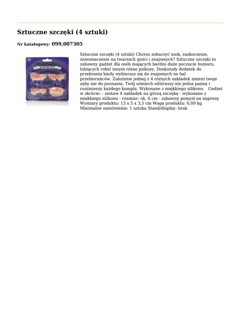 Sztuczne szczęki (4 sztuki) Nr katalogowy: 099,007305 Sztuczne szczęki (4 sztuki) Chcesz zobaczyć szok, zaskoczenie, zniesmaczenie na twarzach gości i znajomych? Sztuczne szczęki to zabawny gadżet dla osób mających bardzo duże poczucie humoru, lubiących robić innym różne psikusy. Doskonały dodatek do przebrania kiedy wybierasz się do znajomych na bal przebierańców. Założenie jednej z 4 różnych nakładek zmieni twoje zęby nie do poznania. Twój uśmiech odstraszy nie jedna pannę i rozśmieszy każdego kumpla. Wykonane z miękkiego silikonu. Gadżet w skrócie: - zestaw 4 nakładek na górną szczękę - wykonane z miękkiego silikonu - rozmiar: ok. 6 cm - zabawny pomysł na imprezę Wymiary produktu: 13 x 5 x 3,5 cm Waga produktu: 0,09 kg Minimalne zamówienie: 1 sztuka Stand/display: brak