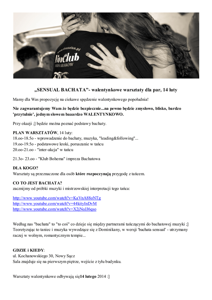 „SENSUAL BACHATA”- walentynkowe warsztaty dla par, 14 luty Mamy dla Was propozycję na ciekawe spędzenie walentynkowego popołudnia! Nie zagwarantujemy Wam że będzie bezpiecznie...na pewno będzie zmysłowo, blisko, bardzo 'przytulnie', jednym słowe m baaardzo WALENTYNKOWO. Przy okazji ;] będzie można poznać podstawy bachaty. PLAN WARSZTATÓW, 14 luty: 18.oo-18.5o - wprowadzenie do bachaty, muzyka, "leading&following"... 19.oo-19.5o - podstawowe kroki, poruszanie w tańcu 20.oo-21.oo - "inter-akcja" w tańcu 21.3o- 23.oo - "Klub Bohema" impreza Bachatowa DLA KOGO? Warsztaty są przeznaczone dla osób które rozpoczynają przygodę z tańcem. CO TO JEST BACHATA? zacznijmy od próbki muzyki i mistrzowskiej interpretacji tego tańca: http://www.youtube.com/watch?v=KaVnA88oNTg http://www.youtube.com/watch?v=44kityInDvM http://www.youtube.com/watch?v=X2jNoJJ6qso Według nas "bachata" to "to coś" co dzieje się między partnerami tańczącymi do bachatowej muzyki ;] Teoretyzując to taniec i muzyka wywodzące się z Dominikany, w wersji 'bachata sensual' - utrzymany raczej w wolnym, romantycznym tempie... GDZIE i KIEDY: ul. Kochanowskiego 30, Nowy Sącz Sala znajduje się na pierwszym piętrze, wejście z tyłu budynku. Warsztaty walentynkowe odbywają się14 lutego 2014 :] CENNIK I ZAPISY: W cenie karnetu mamy: 3h warsztatów + drink/piwo/napój dla każdej osoby na imprezie + ewentualny bilet wstępu na imprezę 3h zajęć dla PARY: 60zł Nasi kursanci płacą 50zł od pary Zapisy tylko w parach :] Zapisy po uprzednim zgłoszeniu mailowym/telefonicznym i dalej wpłacie na konto, lub osobiście podczas naszych regularnych zajęć. W dniu warsztatów cena karnetu +20zł Warunkiem odbycia warsztatów jest zebranie odpowiedniej ilość osób. Na zajęcia polecamy zabrać dużo uśmiechu, niebrudzące parkietu buty i luźne ubranie. Dane do przelewu: Bank Zachodni WBK S.A. VIVACLUB, Kraków 61 1090 2053 0000 0001 0286 1117 Podając w tytule : "Warsztaty bachaty" imiona i nazwiska INFORMACJE: Marcin - 604 707 941 [email protected] Serdecznie zapraszamy!