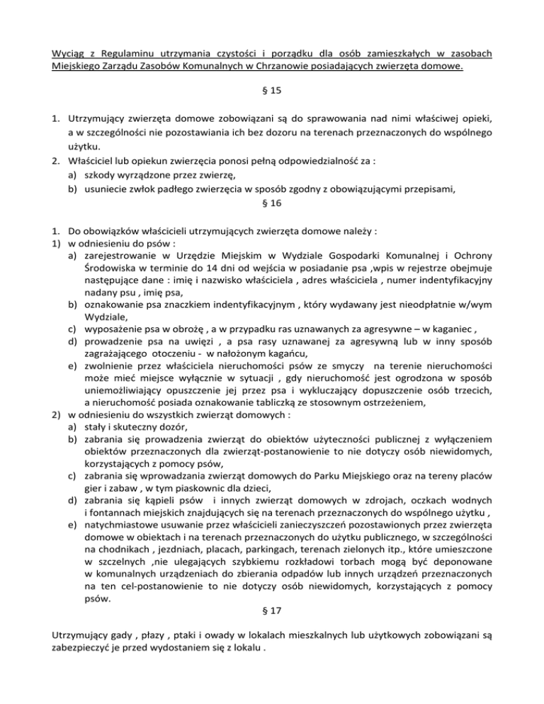 Wyciąg z Regulaminu utrzymania czystości i porządku dla osób zamieszkałych w zasobach Miejskiego Zarządu Zasobów Komunalnych w Chrzanowie posiadających zwierzęta domowe. § 15 1. Utrzymujący zwierzęta domowe zobowiązani są do sprawowania nad nimi właściwej opieki, a w szczególności nie pozostawiania ich bez dozoru na terenach przeznaczonych do wspólnego użytku. 2. Właściciel lub opiekun zwierzęcia ponosi pełną odpowiedzialność za : a) szkody wyrządzone przez zwierzę, b) usuniecie zwłok padłego zwierzęcia w sposób zgodny z obowiązującymi przepisami, § 16 1. Do obowiązków właścicieli utrzymujących zwierzęta domowe należy : 1) w odniesieniu do psów : a) zarejestrowanie w Urzędzie Miejskim w Wydziale Gospodarki Komunalnej i Ochrony Środowiska w terminie do 14 dni od wejścia w posiadanie psa ,wpis w rejestrze obejmuje następujące dane : imię i nazwisko właściciela , adres właściciela , numer indentyfikacyjny nadany psu , imię psa, b) oznakowanie psa znaczkiem indentyfikacyjnym , który wydawany jest nieodpłatnie w/wym Wydziale, c) wyposażenie psa w obrożę , a w przypadku ras uznawanych za agresywne – w kaganiec , d) prowadzenie psa na uwięzi , a psa rasy uznawanej za agresywną lub w inny sposób zagrażającego otoczeniu - w nałożonym kagańcu, e) zwolnienie przez właściciela nieruchomości psów ze smyczy na terenie nieruchomości może mieć miejsce wyłącznie w sytuacji , gdy nieruchomość jest ogrodzona w sposób uniemożliwiający opuszczenie jej przez psa i wykluczający dopuszczenie osób trzecich, a nieruchomość posiada oznakowanie tabliczką ze stosownym ostrzeżeniem, 2) w odniesieniu do wszystkich zwierząt domowych : a) stały i skuteczny dozór, b) zabrania się prowadzenia zwierząt do obiektów użyteczności publicznej z wyłączeniem obiektów przeznaczonych dla zwierząt-postanowienie to nie dotyczy osób niewidomych, korzystających z pomocy psów, c) zabrania się wprowadzania zwierząt domowych do Parku Miejskiego oraz na tereny placów gier i zabaw , w tym piaskownic dla dzieci, d) zabrania się kąpieli psów i innych zwierząt domowych w zdrojach, oczkach wodnych i fontannach miejskich znajdujących się na terenach przeznaczonych do wspólnego użytku , e) natychmiastowe usuwanie przez właścicieli zanieczyszczeń pozostawionych przez zwierzęta domowe w obiektach i na terenach przeznaczonych do użytku publicznego, w szczególności na chodnikach , jezdniach, placach, parkingach, terenach zielonych itp., które umieszczone w szczelnych ,nie ulegających szybkiemu rozkładowi torbach mogą być deponowane w komunalnych urządzeniach do zbierania odpadów lub innych urządzeń przeznaczonych na ten cel-postanowienie to nie dotyczy osób niewidomych, korzystających z pomocy psów. § 17 Utrzymujący gady , płazy , ptaki i owady w lokalach mieszkalnych lub użytkowych zobowiązani są zabezpieczyć je przed wydostaniem się z lokalu .