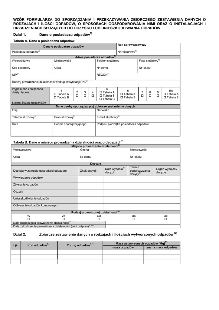 WZÓR FORMULARZA DO SPORZĄDZANIA I PRZEKAZYWANIA ZBIORCZEGO ZESTAWIENIA DANYCH O RODZAJACH I ILOŚCI ODPADÓW, O SPOSOBACH GOSPODAROWANIA NIMI ORAZ O INSTALACJACH I URZĄDZENIACH SŁUŻĄCYCH DO ODZYSKU LUB UNIESZKODLIWIANIA ODPADÓW Dane o posiadaczu odpadów1) Dział 1. Tabela A. Dane o posiadaczu odpadów Rok sprawozdawczy Dane o posiadaczu odpadów 2) 3) Posiadacz odpadów Nr rejestrowy 4) Województwo Miejscowość Kod pocztowy Ulica NIP Adres posiadacza odpadów Telefon służbowy Nr domu 5) REGON Rodzaj prowadzonej działalności według klasyfikacji PKD Wypełniono i załączono działy, tabele: 5) Faks służbowy 1 Tabela A Tabela B 2 Nr lokalu 5) 6) 3 4 5 Tabela A Tabela B Tabela C 6 Tabela A Tabela B 7 8 9 10a Tabela A Tabela B Łączna liczba załączników Dane osoby sporządzającej zbiorcze zestawienie danych Nazwisko Imię 5) 5) 5) Telefon służbowy Faks służbowy E-mail służbowy Data Podpis sporządzającego Podpis i pieczątka posiadacza odpadów 7) Tabela B. Dane o miejscu prowadzenia działalności oraz o decyzjach 8) Miejsce prowadzenia działalności Gmina Województwo Ulica Miejscowość Nr domu Nr lokalu Decyzje 9) Decyzja w zakresie gospodarki odpadami Znak decyzji Data wydania decyzji Termin obowiązywania 6) decyzji Organ wydający decyzję Wytwarzanie odpadów Zbieranie odpadów Odzysk Unieszkodliwianie odpadów Odbieranie odpadów komunalnych 10) Rodzaj prowadzonej działalności Od W Zb 9, 11) Data rozpoczęcia prowadzenia działalności 9, 11) Data zakończenia prowadzenia działalności (jeśli dotyczy) Dział 2. Lp. Un Ok Zbiorcze zestawienie danych o rodzajach i ilościach wytworzonych odpadów12) 13) Kod odpadów 13) Rodzaj odpadów 14) Masa wytworzonych odpadów [Mg] masa odpadów sucha masa odpadów