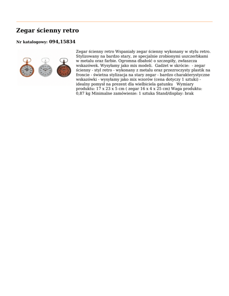 Zegar ścienny retro Nr katalogowy: 094,15834 Zegar ścienny retro Wspaniały zegar ścienny wykonany w stylu retro. Stylizowany na bardzo stary, ze specjalnie zrobionymi uszczerbkami w metalu oraz farbie. Ogromna dbałość o szczegóły, zwłaszcza wskazówek. Wysyłamy jako mix modeli. Gadżet w skrócie: - zegar ścienny - styl retro - wykonany z metalu oraz przezroczysty plastik na froncie - świetna stylizacja na stary zegar - bardzo charakterystyczne wskazówki - wysyłamy jako mix wzorów (cena dotyczy 1 sztuki) idealny pomysł na prezent dla wielbiciela gatunku Wymiary produktu: 17 x 23 x 5 cm ( zegar 16 x 4 x 25 cm) Waga produktu: 0,87 kg Minimalne zamówienie: 1 sztuka Stand/display: brak