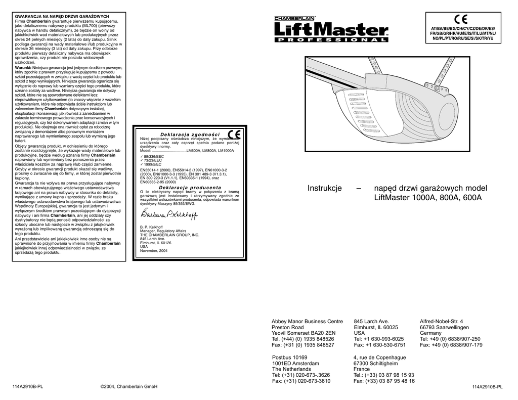 GWARANCJA NA NAP¢D DRZWI GARA˚OWYCH Firma Chamberlain gwarantuje pierwszemu kupujàcemu, jako detalicznemu nabywcy produktu (ML700) (pierwszy nabywca w handlu detalicznym), ˝e b´dzie on wolny od jakichkolwiek wad materia∏owych lub produkcyjnych przez okres 24 pe∏nych miesi´cy (2 lata) do daty zakupu. Silnik podlega gwarancji na wady materia∏owe i/lub produkcyjne w okresie 36 miesi´cy (3 lat) od daty zakupu. Przy odbiorze produktu pierwszy detaliczny nabywca ma obowiàzek sprawdzenia, czy produkt nie posiada widocznych uszkodzeƒ. Warunki: Niniejsza gwarancja jest jedynym Êrodkiem prawnym, który zgodnie z prawem przys∏uguje kupujàcemu z powodu szkód pozostajàcych w zwiàzku z wadà cz´Êci lub produktu lub szkód z tego wynikajàcych. Niniejsza gwarancja ogranicza si´ wy∏àcznie do naprawy lub wymiany cz´Êci tego produktu, które uznane zosta∏y za wadliwe. Niniejsza gwarancja nie dotyczy szkód, które nie sà spowodowane defektami lecz nieprawid∏owym u˝ytkowaniem (to znaczy w∏àcznie z wszelkim u˝ytkowaniem, które nie odpowiada ÊciÊle instrukcjom lub zaleceniom firmy Chamberlain dotyczàcym instalacji, eksploatacji i konserwacji, jak równie˝ z zaniedbaniem w zakresie terminowego prowadzenia prac konserwacyjnych i regulacyjnych, czy te˝ dokonywaniem adaptacji i zmian w tym produkcie). Nie obejmuje ona równie˝ op∏at za robocizn´ zwiàzanà z demonta˝em albo ponownym monta˝em naprawianego lub wymienianego zespo∏u lub wymianà jego baterii. Obj´ty gwarancjà produkt, w odniesieniu do którego zostanie rozstrzygni´te, ˝e wykazuje wady materia∏owe lub produkcyjne, b´dzie wed∏ug uznania firmy Chamberlain naprawiony lub wymieniony bez ponoszenia przez w∏aÊciciela kosztów za napraw´ i/lub cz´Êci zamienne. Gdyby w okresie gwarancji produkt okaza∏ si´ wadliwy, prosimy o zwracanie si´ do firmy, w której zosta∏ pierwotnie kupiony. Gwarancja ta nie wp∏ywa na prawa przys∏ugujàce nabywcy w ramach obowiàzujàcego w∏aÊciwego ustawodawstwa krajowego ani na prawa nabywcy w stosunku do detalisty, wynikajàce z umowy kupna / sprzeda˝y. W razie braku w∏aÊciwego ustawodawstwa krajowego lub ustawodawstwa Wspólnoty Europejskiej, gwarancja ta jest jedynym i wy∏àcznym Êrodkiem prawnym pozostajàcym do dyspozycji nabywcy i ani firma Chamberlain, ani jej oddzia∏y czy dystrybutorzy nie b´dà ponosiç odpowiedzialnoÊci za szkody uboczne lub nast´pcze w zwiàzku z jakàkolwiek wyra˝onà lub implikowanà gwarancjà odnoszàcà si´ do tego produktu. Ani przedstawiciele ani jakiekolwiek inne osoby nie sà uprawnione do przyjmowania w imieniu firmy Chamberlain jakiejkolwiek innej odpowiedzialnoÊci w zwiàzku ze sprzeda˝à tego produktu. 114A2910B-PL Deklaracja zgodnoÊci Ni˝ej podpisany oÊwiadcza niniejszym, ˝e wymienione urzàdzenia oraz ca∏y osprz´t spe∏nia podane poni˝ej dyrektywy i normy. Model: ..................................LM600A, LM800A, LM1000A ✓ 89/336/EEC ✓ 73/23/EEC ✓ 1999/5/EC EN55014-1 (2000), EN55014-2 (1997), EN61000-3-2 (2000), EN61000-3-3 (1995), EN 301 489-3 (V1.3.1), EN 300 220-3 (V1.1.1), EN60335-1 (1994), oraz EN60335-2-95 (2000) Deklaracja producenta O ile elektryczny nap´d bramy w po∏àczeniu z bramà gara˝owà jest instalowany i utrzymywany zgodnie ze wszystkimi wskazówkami producenta, odpowiada warunkom dyrektywy Maszyny 89/392/EWG. Instrukcje – nap´d drzwi gara˝owych model LiftMaster 1000A, 800A, 600A B. P. Kelkhoff Manager, Regulatory Affairs THE CHAMBERLAIN GROUP, INC. 845 Larch Ave. Elmhurst, IL 60126 USA November, 2004 ©2004, Chamberlain GmbH Abbey Manor Business Centre Preston Road Yeovil Somerset BA20 2EN Tel. (+44) (0) 1935 848526 Fax: (+31 (0) 1935 848527 845 Larch Ave. Elmhurst, IL 60025 USA Tel: +1 630-993-6025 Fax: +1 630-530-6751 Postbus 10169 1001ED Amsterdam The Netherlands Tel: (+31) 020-673-.3626 Fax: (+31) 020-673-3610 4, rue de Copenhague 67300 Schiltigheim France Tel.: (+33) 03 87 98 15 93 Fax: (+33) 03 87 95 48 16 Alfred-Nobel-Str. 4 66793 Saarwellingen Germany Tel: +49 (0) 6838/907-250 Fax: +49 (0) 6838/907-179 114A2910B-PL NAJPIERW PRZECZYTAå PONI˚SZE INSTRUKCJE BEZPIECZE¡STWA! OBS¸UGA NAP¢DU DANE TECHNICZNE Nieprzestrzeganie poni˝szych instrukcji bezpieczeƒstwa mo˝e prowadziç do powa˝nych obra˝eƒ cia∏a lub szkód materialnych. • Prosz´ starannie przeczytaç niniejsze instrukcje. • Niniejszy nap´d do drzwi gara˝owych zosta∏ zaprojektowany i przetestowany z myÊlà o zapewnieniu bezpiecznego dzia∏ania, pod warunkiem, ˝e b´dzie on zainstalowany i u˝ytkowany ÊciÊle wed∏ug instrukcji, zawartych w niniejszym podr´czniku. Symbole te oznaczajà ‚OSTRZE˚ENIE’ i umieszczone sà obok uwag dotyczàcych zachowania osobistego bezpieczeƒstwa i zapobiegania szkodom materialnym. Prosz´ czytaç je wnikliwie. UWAGA: Je˝eli gara˝ nie posiada wejÊcia bocznego, wówczas ze wzgl´dów bezpieczeƒstwa nale˝y dodatkowo zainstalowaç zewn´trzny zamek awaryjny, model 1702E. Umo˝liwia on r´czne otwarcie drzwi gara˝owych od zewnàtrz w razie braku dop∏ywu pràdu. Nap´d mo˝e zostaç uruchomiony przy pomocy nast´pujàcych urzàdzeƒ: • Konsola Êcienna. Naciskaç przycisk a˝ do momentu, gdy drzwi zacznà si´ przesuwaç. • Zewn´trzny zamek na klucz lub bezprzewodowa klawiatura cyfrowa (je˝eli zosta∏y zainstalowane któreÊ z tych akcesoriów). • Zdalne sterowanie. Naciskaç przycisk pilota a˝ do momentu, gdy drzwi zacznà si´ przesuwaç. R´czne otwieranie drzwi: Je˝eli jest to mo˝liwe, drzwi powinny byç ca∏kowicie zamkni´te. S∏abe lub zerwane spr´˝yny mogà powodowaç szybkie opadanie drzwi. Nast´pstwem tego mogà byç powa˝ne obra˝enia cia∏a lub szkody materialne. Drzwi dajà si´ otworzyç r´cznie poprzez pociàgni´cie w dó∏ i do ty∏u uchwytu odblokowujàcego (w kierunku nap´du). Aby ponownie pod∏àczyç wózek, nale˝y pociàgnàç uchwyt odblokowujàcy prosto do do∏u. Uchwytu odblokowuj