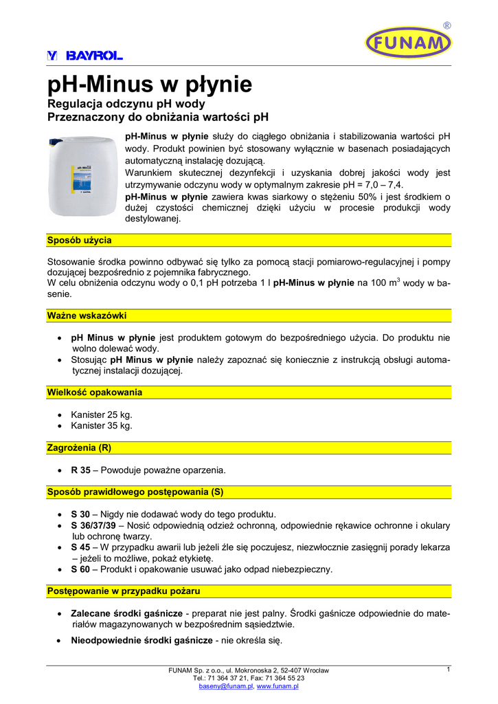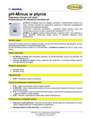 pH-Minus w płynie Regulacja odczynu pH wody Przeznaczony do obniżania wartości pH pH-Minus w płynie służy do ciągłego obniżania i stabilizowania wartości pH wody. Produkt powinien być stosowany wyłącznie w basenach posiadających automatyczną instalację dozującą. Warunkiem skutecznej dezynfekcji i uzyskania dobrej jakości wody jest utrzymywanie odczynu wody w optymalnym zakresie pH = 7,0 – 7,4. pH-Minus w płynie zawiera kwas siarkowy o stężeniu 50% i jest środkiem o dużej czystości chemicznej dzięki użyciu w procesie produkcji wody destylowanej. Sposób użycia Stosowanie środka powinno odbywać się tylko za pomocą stacji pomiarowo-regulacyjnej i pompy dozującej bezpośrednio z pojemnika fabrycznego. W celu obniżenia odczynu wody o 0,1 pH potrzeba 1 l pH-Minus w płynie na 100 m3 wody w basenie. Ważne wskazówki pH Minus w płynie jest produktem gotowym do bezpośredniego użycia. Do produktu nie wolno dolewać wody. Stosując pH Minus w płynie należy zapoznać się koniecznie z instrukcją obsługi automatycznej instalacji dozującej. Wielkość opakowania Kanister 25 kg. Kanister 35 kg. Zagrożenia (R) R 35 – Powoduje poważne oparzenia. Sposób prawidłowego postępowania (S) S 30 – Nigdy nie dodawać wody do tego produktu. S 36/37/39 – Nosić odpowiednią odzież ochronną, odpowiednie rękawice ochronne i okulary lub ochronę twarzy. S 45 – W przypadku awarii lub jeżeli źle się poczujesz, niezwłocznie zasięgnij porady lekarza – jeżeli to możliwe, pokaż etykietę. S 60 – Produkt i opakowanie usuwać jako odpad niebezpieczny. Postępowanie w przypadku pożaru Zalecane środki gaśnicze - preparat nie jest palny. Środki gaśnicze odpowiednie do materiałów magazynowanych w bezpośrednim sąsiedztwie. Nieodpowiednie środki gaśnicze - nie określa się. FUNAM Sp. z o.o., ul. Mokronoska 2, 52-407 Wrocław Tel.: 71 364 37 21, Fax: 71 364 55 23 [email protected], www.funam.pl 1 Szczególne zagrożenia ze strony produktów spalania i wydzielających się gazów podczas pożaru w strefie wysokiej temperatury powstaje mgła kwasu siarkowego i tlenki siarki. Wdychanie produktów rozkładu może powodować poważne skutki zdrowotne. Specjalne wyposażenie ochronne strażaków - wyposażenie strażaków dostosować do lokalnych warunków akcji gaśniczej, zalecane jest pełne wyposażenie bojowe z aparatami oddechowymi. Inne informacje - sąsiednie pojemniki chłodzić wodą. W przypadku wydzielania się substancji z rozkładu należy pokrywać wydzielające się opary mgiełką wodną. FUNAM Sp. z o.o., ul. Mokronoska 2, 52-407 Wrocław Tel.: 71 364 37 21, Fax: 71 364 55 23 [email protected], www.funam.pl 2