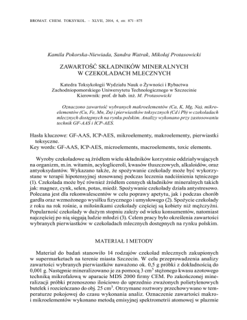 BROMAT. CHEM. TOKSYKOL. – XLVII, 2014, 4, str. 871 – 875 Kamila Pokorska-Niewiada, Sandra Watrak, Mikołaj Protasowicki ZAWARTOŚĆ SKŁADNIKÓW MINERALNYCH W CZEKOLADACH MLECZNYCH Katedra Toksykologii Wydziału Nauk o Żywności i Rybactwa Zachodniopomorskiego Uniwersytetu Technologicznego w Szczecinie Kierownik: prof. dr hab. inż. M. Protasowicki Oznaczono zawartość wybranych makroelementów (Ca, K, Mg, Na), mikroelementów (Cu, Fe, Mn, Zn) i pierwiastków toksycznych (Cd i Pb) w czekoladach mlecznych dostępnych na rynku polskim. Analizy wykonano przy zastosowaniu technik GF-AAS i ICP-AES. Hasła kluczowe: GF-AAS, ICP-AES, mikroelementy, makroelementy, pierwiastki toksyczne. Key words: GF-AAS, ICP-AES, microelements, macroelements, toxic elements. Wyroby czekoladowe są źródłem wielu składników korzystnie oddziaływujących na organizm, m.in. witamin, acylogliceroli, kwasów tłuszczowych, alkaloidów, oraz antyoksydantów. Wykazano także, że spożywanie czekolady może być wykorzystane w terapii hipotensyjnej stosowanej podczas leczenia nadciśnienia tętniczego (1). Czekolada może być również źródłem cennych składników mineralnych takich jak: magnez, cynk, selen, potas, miedź. Spożywanie czekolady działa antystresowo. Polecana jest dla rekonwalescentów w celu poprawy apetytu, jak i podczas chorób gardła oraz wzmożonego wysiłku fizycznego i umysłowego (2). Spożycie czekolady z roku na rok rośnie, a miłośnikami czekolady częściej są kobiety niż mężczyźni. Popularność czekolady w dużym stopniu zależy od wieku konsumentów, natomiast najczęściej po nią sięgają ludzie młodzi (3). Celem pracy było określenia zawartości wybranych pierwiastków w czekoladach mlecznych dostępnych na rynku polskim. MATERIAŁ I METODY Materiał do badań stanowiło 14 rodzajów czekolad mlecznych zakupionych w supermarketach na terenie miasta Szczecin. W celu przeprowadzenia analizy zawartości wybranych pierwiastków naważono ok. 0,5 g próbki z dokładnością do 0,001 g. Następnie mineralizowano je za pomocą 3 cm3 stężonego kwasu azotowego techniką mikrofalową w aparacie MDS 2000 firmy CEM. Po zakończonej mineralizacji próbki przenoszono ilościowo do uprzednio zważonych polietylenowych butelek i rozcieńczano do obj. 25 cm3. Otrzymane roztwory przechowywano w temperaturze pokojowej do czasu wykonania analiz. Oznaczenie zawartości makroi mikroelementów wykonano metodą emisyjnej spektrometrii atomowej w plazmie 872 Nr 4 K. Pokorska-Niewiada i współpr. indukcyjnie sprzężonej (ICP-AES) w aparacie Jobin Yvon JY–24, natomiast kadm i ołów oznaczono metodą bezpłomieniowej absorpcyjnej spektrometrii atomowej (GF-AAS) z elektrotermiczną atomizacją w kuwecie grafitowej w aparacie Perkin – Elmer ZL 4110. Analiza materiału odniesienia wykazała wysoką zgodność oznaczonych zawartości wybranych pierwiastków z wartościami referencyjnymi. Wartość odzysku dla badanych metali wynosiła 92,4 – 110,2 %. WYNIKI I ICH OMÓWIENIE Wyniki oznaczeń zawartości wybranych makroelementów w analizowanych czekoladach mlecznych zestawiono w tab. I, natomiast pozostałych pierwiastków w tab. II. T a b e l a I. Zawartość podstawowych makroelementów w czekoladach mlecznych (mg/100 g) T a b l e I. Content of essentials macroelements in milk chocolates (mg/100 g) Lp. Ca K Mg Na 1 2 3 4 5 6 7 8 9 10 11 12 13 14 96,4 ± 16,8 222,4 ± 5,9 120,7 ± 35,0 105,2 ± 14,2 161,5 ± 11,5 163,0 ± 26,2 118,3 ± 16,6 113,9 ± 4,4 163,9 ± 7,4 194,1 ± 7,7 156,0 ± 26,4 181,3 ± 20,5 167,6 ± 13,1 155,3 ± 9,4 554,6 ± 64,4 790,2 ± 31,6 731,5 ± 64,4 545,7 ± 125,7 730,5 ± 29,7 791,2 ± 48,5 646,2 ± 50,7 676,2 ± 72,3 531,1 ± 91,4 669,8 ± 110,0 626,1 ± 46,7 571,3 ± 88,5 517,3 ± 77,3 585,8 ± 75,9 49,0 ± 2,2 100,9 ± 16,6 51,5 ± 9,9 110,2 ± 15,3 176,2 ± 7,8 162,5 ± 9,1 135,7 ± 5,6 111,4 ± 18,8 119,4 ± 11,8 152,3 ± 14,1 124,3 ± 3,6 110,6 ± 13,4 87,4 ± 5,2 115,0 ± 9,9 62,3 ± 15,4 103,1 ± 8,8 57,8 ± 4,9 61,4 ± 5,0 47,8 ± 0,4 51,5 ± 3,1 54,3 ± 7,9 69,0 ± 11,4 53,8 ± 2,0 47,8 ± 7,2 44,1 ± 9,9 39,2 ± 7,9 36,3 ± 10,4 42,7 ± 6,5 1 – Tip; 2 – Terravita; 3 – Alpine Milk; 4 – Alpinella; 5 – Schogetten; 6 – Alpen Gold; 7 – Bąbolada; 8 – Duet; 9 – Goplana; 10 – Wedel-mleczna; 11 – Wawel-Jagiellońska; 12 – Gross; 13 – Bellarom; 14 – Wedel-Tatrzańska Wapń w produktach spożywczych występuje naturalnie, ale może też być do nich dodawany (4). Ze wszystkich składników czekolady to mleko w proszku jest głównym źródłem tego pierwiastka. Średnia zawartość wapnia w analizowanych czekoladach wynosiła 146 mg/100 g produktu. Podobne wyniki uzyskali Ieggli i współpr. (5) analizując czekolady o różnej zawartości kakao. Nieco wyższe wyniki, bo 190 mg/100 g oraz 250 mg/100 g czekolady uzyskali Steinberg i współpr. (6) oraz Ogunwolu i współpr. (7). Potas wpływa na równowagę kwasowo-zasadową organizmu oraz reguluje czynności mięśni i nerwów (4). Najwyższą zawartość potasu w analizowanych czekoladach stwierdzono w czekoladzie Alpen Gold. Uzyskane wyniki są niemal dwukrotnie wyższe, niż podawane w dostępnych publikacjach (6, 7, 8, 9). Magnez uważa się za najbardziej pożądany składnik czekolady. W organizmie jest on składnikiem kości i zębów oraz bierze udział w termoregulacji organizmu (4). Średnia zawartość magnezu w badanych produktach wynosiła 107,8 mg/100 g Nr 4 873 Zawartość składników mineralnych w czekoladach mlecznych czekolady. Wyniki badań własnych były niemal dwukrotnie wyższe, niż przedstawiane w literaturze zagranicznej (5, 10). Sód jest nie tylko naturalnym składnikiem żywności, ale również dodawany jest w czasie jej przemysłowego przetwarzania, i to zarówno ze względu na swoje cechy organoleptyczne, jak i na wykazywane właściwości konserwujące i funkcjonalne (4). Badane czekolady zawierały średnio 52,7 mg sodu/100 g produktu i wart