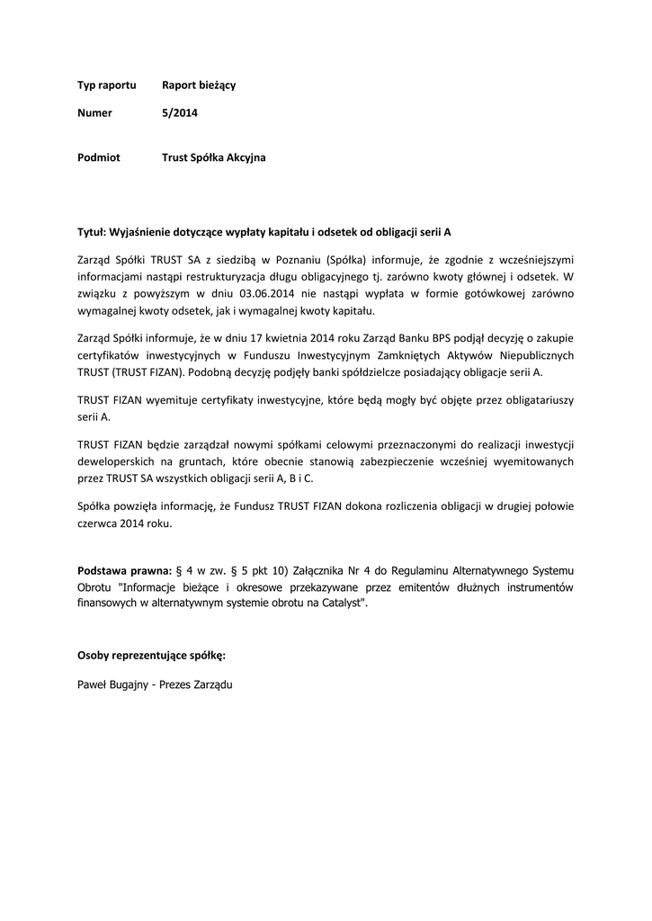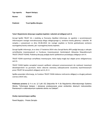 Typ raportu Raport bieżący Numer 5/2014 Podmiot Trust Spółka Akcyjna Tytuł: Wyjaśnienie dotyczące wypłaty kapitału i odsetek od obligacji serii A Zarząd Spółki TRUST SA z siedzibą w Poznaniu (Spółka) informuje, że zgodnie z wcześniejszymi informacjami nastąpi restrukturyzacja długu obligacyjnego tj. zarówno kwoty głównej i odsetek. W związku z powyższym w dniu 03.06.2014 nie nastąpi wypłata w formie gotówkowej zarówno wymagalnej kwoty odsetek, jak i wymagalnej kwoty kapitału. Zarząd Spółki informuje, że w dniu 17 kwietnia 2014 roku Zarząd Banku BPS podjął decyzję o zakupie certyfikatów inwestycyjnych w Funduszu Inwestycyjnym Zamkniętych Aktywów Niepublicznych TRUST (TRUST FIZAN). Podobną decyzję podjęły banki spółdzielcze posiadający obligacje serii A. TRUST FIZAN wyemituje certyfikaty inwestycyjne, które będą mogły być objęte przez obligatariuszy serii A. TRUST FIZAN będzie zarządzał nowymi spółkami celowymi przeznaczonymi do realizacji inwestycji deweloperskich na gruntach, które obecnie stanowią zabezpieczenie wcześniej wyemitowanych przez TRUST SA wszystkich obligacji serii A, B i C. Spółka powzięła informację, że Fundusz TRUST FIZAN dokona rozliczenia obligacji w drugiej połowie czerwca 2014 roku. Podstawa prawna: § 4 w zw. § 5 pkt 10) Załącznika Nr 4 do Regulaminu Alternatywnego Systemu Obrotu "Informacje bieżące i okresowe przekazywane przez emitentów dłużnych instrumentów finansowych w alternatywnym systemie obrotu na Catalyst". Osoby reprezentujące spółkę: Paweł Bugajny - Prezes Zarządu