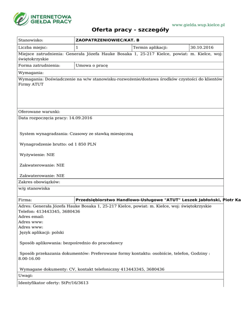 Oferta pracy - szczegóły Stanowisko: ZAOPATRZENIOWIEC/KAT. B Liczba miejsc: 1 Termin aplikacji: www.gielda.wup.kielce.pl 30.10.2016 Miejsce zatrudnienia: Generała Józefa Hauke Bosaka 1, 25-217 Kielce, powiat: m. Kielce, woj: świętokrzyskie Forma zatrudnienia: Umowa o pracę Wymagania: Wymagania: Doświadczenie na w/w stanowisku-rozwożenie/dostawa środków czystości do klientów Firmy ATUT Oferowane warunki: Data rozpoczęcia pracy: 14.09.2016 System wynagradzania: Czasowy ze stawką miesięczną Wynagrodzenie brutto: od 1 850 PLN Wyżywienie: NIE Zakwaterowanie: NIE Zakwaterowanie: NIE Zakres obowiązków: w/g stanowiska Firma: Przedsiębiorstwo Handlowo-Usługowe "ATUT" Leszek Jabłoński, Piotr Ka Adres: Generała Józefa Hauke Bosaka 1, 25-217 Kielce, powiat: m. Kielce, woj: świętokrzyskie Telefon: 413443345, 3680436 Adres email: Adres www: Adres www: Język aplikacji: polski Sposób aplikowania: bezpośrednio do pracodawcy Sposób przekazania dokumentów: Preferowane formy kontaktu: osobiście, telefon, Godziny : 8.00-16.00 Wymagane dokumenty: CV, kontakt telefoniczny 413443345, 3680436 Uwagi: Identyfikator oferty: StPr/16/3613 Instytucja koordynująca ofertę: Miejski Urząd Pracy w Kielcach Urząd Pracy dokłada wszelkich starań, aby oferty pracy będące w zasobach urzędu, były rzetelne i wiarygodne. Ponieważ wszystkie oferty pracy pochodzą od osób trzecich Urząd Pracy zastrzega, że odpowiedzialność za ewentualne rozbieżności pomiędzy warunkami pracy zaprezentowanymi w niniejszej ofercie a warunkami zaproponowanymi przez potencjalnego pracodawcę ponosi pracodawca.