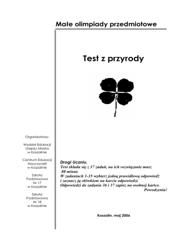 Małe olimpiady przedmiotowe Test z przyrody Organizatorzy: Wydział Edukacji Urzędu Miasta w Koszalinie Centrum Edukacji Nauczycieli w Koszalinie Szkoła Podstawowa Nr 17 w Koszalinie Drogi Uczniu, Test składa się z 37 zadań, na ich rozwiązanie masz 80 minut. W zadaniach 1-35 wybierz jedną prawidłową odpowiedź i zaznacz ją ołówkiem na karcie odpowiedzi. Odpowiedzi do zadania 36 i 37 zapisz na osobnej kartce. Powodzenia! Szkoła Podstawowa Nr 18 w Koszalinie Koszalin, maj 2006 1. Zaznacz zdanie nieprawdziwe: A) Słońce jesienią góruje coraz wyŜej. B) Jesienią kwitną astry, zimowity i chryzantemy. C) Słońce jesienią góruje coraz niŜej. D) Kalendarzowa jesień zaczyna się 23 września. 2. Który rysunek przedstawia lipę: A B C D A) Rysunek A B) Rysunek B C) Rysunek C D) Rysunek D 3. Grzyby w lesie spełniają bardzo waŜną rolę. Nie powinno się niszczyć Ŝadnych grzybów, poniewaŜ: A) są poŜywieniem dla leśnych zwierząt B) rozkładają resztki roślin i zwierząt(np. opadłe liście) C) przyczyniają się do wzbogacania gleby w sole mineralne D) wszystkie odpowiedzi są prawidłowe 4. Mama do krojenia sałatki wykorzystała urządzenie proste, jakim jest nóŜ. Dzięki takim urządzeniom moŜna wykonać pracę uŜywając mniejszej siły. Zaznacz, jaką maszyną prostą jest nóŜ: A) dźwignią B) klinem C) śrubą D) równią pochyłą 5. Które zdanie jest prawdziwe: A) Wysokie urwiska wybrzeŜa nazywane są klifami. B) W najbliŜszej okolicy Szczecina znajduje się Słowiński Park Narodowy. C) Szczecin znajduje się niedaleko granicy polsko-rosyjskiej. D) Największy wpływ na kształt brzegu morskiego mają trzęsienia ziemi. 6. Na opakowaniu środka do czyszczenia urządzeń sanitarnych zauwaŜyłeś następujące znaki. Co one oznaczają? A) B) C) D) Substancja szkodliwa i łatwopalna. Substancja trująca i łatwopalna. Substancja szkodliwa i Ŝrąca. Substancja łatwopalna i Ŝrąca. 2 7. Które stwierdzenie jest prawdziwe? A) Śnieg to kropelki wody. B) Deszcz to kryształki lodu. C) Śnieg to kryształki lodu. D) Szron to kropelki wody. 8. Które z niŜej przedstawionych zbiorników wodnych zostały zbudowane przez człowieka? A) B) C) D) Zbiorniki a i b Zbiorniki a i c Zbiorniki b i d Zbiorniki c i d 9. Czym zajmuje się geolog? A) opisywaniem budowy roślin i zwierząt teraz i w przeszłości. B) badaniem flory i fauny mórz i oceanów w przeszłości. C) badaniem szaty roślinnej róŜnych kontynentów teraz i w przeszłości. D) badaniem procesów zachodzących w skorupie ziemskiej teraz i w przeszłości. 10. Z czego powstają skały przeobraŜone? A) ze szczątków organizmów roślinnych i zwierzęcych B) z innych skał przekształconych pod wpływem wysokiej temperatury i ciśnienia C) w wyniku krzepnięcia gorącej lawy D) w wyniku erozji skał osadowych 11. W jaki sposób najlepiej ograniczyć wydobycie surowców metalicznych na świecie? A) odzyskiwanie metali ze złomu B) ograniczenie rozwoju przemysłu w krajach wysoko rozwiniętych C) zastąpienie metali drewnem D) zakaz wydobycia rud Ŝelaza i metali kolorowych 12. Które gleby są najbardziej Ŝyzne na Ziemi? A) gleby inicjalne w strefie zwrotnikowej B) gleby kasztanowe i czarnoziemy w strefie umiarkowanej C) gleby tundrowe w strefie okołobiegunowej D) gleby bielicowe w strefie umiarkowanej 3 13. Które ze zwierząt przedstawionych na rysunkach moŜna spotkać w lesie równikowym? A B C D E A) C i D B) D i E C) A i B D) C i E 14. Jak nazywamy zbiorowisko roślinne występujące w bardzo wilgotnych miejscach, tworzone głównie przez olsze czarne i wierzby? A) bór sosnowy B) grąd C) ols D) buczyna 15. Jak nazywamy owoce porzeczki, borówki, dyni i ogórka? A) jagodą B) pestkowcem C) skrzydlakiem D) strąkiem 16. Co to jest tsunami? A) wznoszenie się i opadanie mas wodnych pod wpływem wiatru B) wznoszenie się i opadanie wody mórz i oceanów w wyniku działania sił przyciągania Słońca i KsięŜyca C) potęŜne fale spowodowane podmorskimi trzęsieniami ziemi D) ruchy wód morskich spowodowane róŜnicą temperatur 17. Seriry, hamady i ergi to odmiany: A) pustyń lodowych z obszaru Antarktydy B) pustyń występujących w Afryce C) azjatyckich stepów D) lasów strefy międzyzwrotnikowej 18. Które rysunki przedstawiają wklęsłe formy terenu? A B A) B) C) D) AiB AiC BiC Tylko B 4 C 19. Łososie nazywamy rybami wędrownymi, poniewaŜ wędrują na tarło: A) z rzek do mórz B) ze strumieni do duŜych rzek C) z rzek do jezior D) z morza w górę rzek 20. W jaki sposób moŜna wydzielić sól z wodnego roztworu soli kuchennej? A) przefiltrować roztwór przez sączek B) odparować z roztworu wodę C) odlać wodę, a sól zostanie na dnie D) rozdzielenie tych substancji nie jest moŜliwe 21. W wyniku odbicia fali dźwiękowej od przeszkody powstaje: A) załamanie światła B) zmiana wysokości dźwięku C) rozproszenie światła D) zjawisko echa 22. Które z poniŜszych zwierząt jest stałocieplne? A) Ŝmija zygzakowata B) borsuk C) węgorz D) Ŝółw błotny 23. Zaznacz zdanie prawdziwe. A) Pantofelek jest przedstawicielem pierwotniaków. B) NibynóŜki umoŜliwiają pantofelkowi poruszanie się. C) Pantofelek oddycha skrzelami. D) Ciało pantofelka jest zbudowane 2-5 komórek. 24. W południe 22 czerwca promienie słoneczne padają prostopadle na: A) Zwrotnik KozioroŜca B) Równik C) Zwrotnik Raka D) Biegun Północny 25. W którym zestawie ciał znajdują się wyłącznie izolatory prądu elektrycznego? A) mokre ręce, stalowy gwóźdź B) szklana pałeczka, guma, C) szklana pałeczka, mokre ręce D) metalowe spinacze, guma 26. Które stwierdzenie jest błędne? A) Pomidor jest czerwony, poniewaŜ odbija światło czerwone. B) Śnieg ma kolor biały, poniewaŜ odbija światło białe. C) Węgiel jest czarny, poniewaŜ pochłania całe światło. D) Szyba jest przezroczysta, poniewaŜ odbija całe światło. 5 27. Zamień podaną skalę liniową na liczbową i wybierz popr