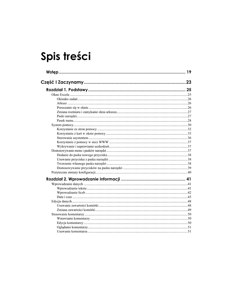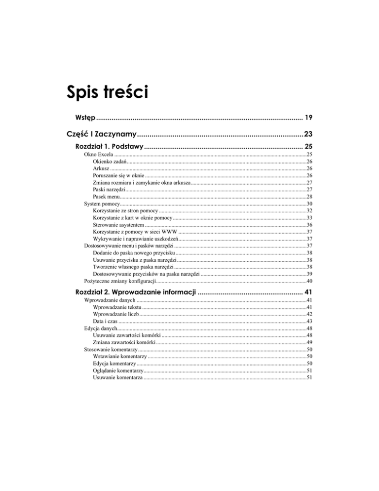 5RKUVTGħEK Okno Excela ..........................................................................................................................................25 Okienko zadań.................................................................................................................................26 Arkusz .............................................................................................................................................26 Poruszanie się w oknie ....................................................................................................................26 Zmiana rozmiaru i zamykanie okna arkusza...................................................................................27 Paski narzędzi..................................................................................................................................27 Pasek menu......................................................................................................................................28 System pomocy......................................................................................................................................30 Korzystanie ze stron pomocy ..........................................................................................................32 Korzystanie z kart w oknie pomocy ................................................................................................33 Sterowanie asystentem ....................................................................................................................36 Korzystanie z pomocy w sieci WWW ............................................................................................37 Wykrywanie i naprawianie uszkodzeń............................................................................................37 Dostosowywanie menu i pasków narzędzi ...............................................................................................37 Dodanie do paska nowego przycisku ..............................................................................................38 Usuwanie przycisku z paska narzędzi .............................................................................................38 Tworzenie własnego paska narzędzi ...............................................................................................38 Dostosowywanie przycisków na pasku narzędzi ............................................................................39 Pożyteczne zmiany konfiguracji............................................................................................................40 Wprowadzanie danych ..........................................................................................................................41 Wprowadzanie tekstu ......................................................................................................................41 Wprowadzanie liczb ........................................................................................................................42 Data i czas .......................................................................................................................................43 Edycja danych........................................................................................................................................48 Usuwanie zawartości komórki ........................................................................................................48 Zmiana zawartości komórki ............................................................................................................49 Stosowanie komentarzy .........................................................................................................................50 Wstawianie komentarzy ..................................................................................................................50 Edycja komentarzy ..........................................................................................................................50 Oglądanie komentarzy.....................................................................................................................51 Usuwanie komentarza .....................................................................................................................51 6 Sprawdzanie poprawności danych.........................................................................................................51 Wybieranie dozwolonego typu danych ...........................................................................................52 Wyświetlanie komunikatów podczas wprowadzania danych..............................................................53 Ostrzeganie o błędnym typie danych ..............................................................................................53 Sterowanie sposobem wyświetlania danych..........................................................................................55 Formatowanie liczb .........................................................................................................................55 Formatowanie znaków ....................................................................................................................58 Obracanie tekstu ..............................................................................................................................61 Wcięcie tekstu .................................................................................................................................62 Stosowanie stylów .................................................................................................................................63 Definiowanie stylu przez przykład..................................................................................................63 Definiowanie stylu od podstaw ........................................................................................