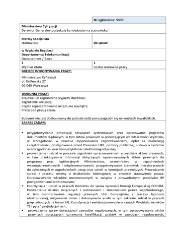 Nr ogłoszenia: 5539 Ministerstwo Cyfryzacji Dyrektor Generalny poszukuje kandydatów na stanowisko: Starszy specjalista stanowisko w Wydziale Regulacji Departamentu Telekomunikacji Departament / Biuro 1 Wymiar etatu MIEJSCE WYKONYWANIA PRACY: do spraw 1 Liczba stanowisk pracy Ministerstwo Cyfryzacji ul. Królewska 27 00-060 Warszawa WARUNKI PRACY: Krajowe lub zagraniczne wyjazdy służbowe; Zagrożenie korupcją; Częste reprezentowanie urzędu na zewnątrz; Praca pod presją czasu. Budynek nie jest dostosowany do potrzeb osób poruszających się na wózkach inwalidzkich. ZAKRES ZADAŃ: przygotowywanie propozycji rozwiązań systemowych oraz opracowanie projektów dokumentów rządowych, w tym aktów prawnych w pozostającym we właściwości Wydziału, w szczególności w zakresie dysponowania częstotliwościami, opłat za numerację i częstotliwości, postępowania przed Prezesem UKE, pomocy publicznej, ustawy o systemie oceny zgodności oraz kompatybilności elektromagnetycznej; prowadzenie i udział w procesie uzgodnień opracowywanych w wydziale aktów prawnych, w tym przekazywanie informacji dotyczących opracowywanych aktów prawnych do programu prac legislacyjnych Ministerstwa, uczestnictwo w uzgodnieniach wewnątrzresortowych i międzyresortowych, przygotowywanie stanowisk merytorycznych do zgłoszonych w uzgodnieniach uwag oraz udział w komisjach prawniczych. Prowadzenie spraw z zakresu ustawy o działalności lobbingowej w procesie stanowienia prawa. Opracowywanie wkładów merytorycznych w związku z prowadzonymi przeciwko RP postępowaniami arbitrażowymi; koordynacja i udział w pracach Komitetu do spraw łączności Komisji Europejskiej COCOM. Prowadzenie działań związanych z wdrażaniem i stosowaniem prawa wspólnotowego, w tym monitorowania regulacji prawnych Unii Europejskiej z zakresu łączności elektronicznej, inicjowanie zmian i dokonywanie analiz w tym zakresie, udział w pracach grup roboczych na forum UE. Koordynacja i ewidencjonowanie w ramach Wydziału wyroków TS i pytań prejudycjalnych; prowadzenie spraw dotyczących zawodów regulowanych, w tym opracowywanie aktów prawnych dotyczących uznawania kwalifikacji, praktyk w zawodach regulowanych, współpraca z Krajowym koordynatorem ds. dyrektywy 2005/36/WE oraz wypełnianie i aktualizowanie Bazy Zawodów Regulowanych prowadzonej przez Komisję Europejską; opracowywanie materiałów i informacji na posiedzenia Rady Ministrów i jej komitetów, dokonywanie ocen i analiz niezbędnych do przygotowywania stanowiska resortu, w tym w sprawach europejskich oraz dotyczących współpracy międzynarodowej, w zakresie właściwości stanowiska; współpraca z jednostkami administracji rządowej i samorządowej, organizacjami pozarządowymi, organami samorządu gospodarczego oraz innymi partnerami społecznymi, w zakresie właściwości stanowiska – w celu udzielenia odpowiedzi na nadsyłane pytania, informowanie o działaniach w zakresie regulacji dotyczących telekomunikacji; udzielanie odpowiedzi na interpelacje i zapytania poselskie, wystąpienia i interwencje posłów i senatorów oraz wystąpienia organów ochrony praw i wolności obywateli, dotyczące nowych technologii, w celu wyjaśnienia zgłaszanych kwestii i realizacji polityki telekomunikacyjnej państwa. Przygotowywanie opinii prawnych i analiz w zakresie właściwości stanowiska; opiniowanie pod względem formalno-prawnym projektów decyzji w sprawach należących do kompetencji ministra właściwego do spraw informatyzacji, rozpoznawanych na podstawie ustawy o drogach publicznych, dotyczących zwolnienia zarządcy drogi z obowiązku budowy kanału technologicznego; opiniowanie pod względem formalno– prawnym projektów decyzji w sprawie autoryzacji udzielanej jednostce oceniającej zgodność w celu późniejszej notyfikacji w zakresie ustawy o systemie oceny zgodności oraz ustawy o kompatybilności elektromagnetycznej. WYKSZTAŁCENIE: wyższe prawnicze WYMAGANIA NIEZBĘDNE: 2 lata doświadczenia zawodowego w obszarze związanym z tworzeniem lub stosowaniem przepisów prawa; znajomość języka angielskiego na poziomie B1; znajomość systemu prawnego regulującego działalność w zakresie telekomunikacji, w szczególności ustawy Prawo telekomunikacyjne; znajomość Kodeksu postępowania administracyjnego; znajomość procesu legislacyjnego; umiejętność współpracy w zespole, zdolność analizy i syntezy informacji; umiejętność skutecznego komunikowania się; posiadanie obywatelstwa polskiego; korzystanie z pełni praw publicznych; nieskazanie prawomocnym wyrokiem za umyślne przestępstwo lub umyślne przestępstwo skarbowe. WYMAGANIA DODATKOWE: studia podyplomowe z zakresu legislacji lub prawa europejskiego; doświadczenie zawodowe w administracji publicznej; szkolenie z zakresu prawa telekomunikacyjnego; znajomość języka angielskiego na poziomie B2; znajomość polskiego rynku telekomunikacyjnego; znajomość przepisów unijnych w zakresie telekomunikacji; znajomość procesów decyzyjnych UE. DOKUMENTY I OŚWIADCZENIA NIEZBĘDNE: życiorys i list motywacyjny; kopie dokumentów potwierdzających spełnienie wymagania niezbędnego w zakresie wykształcenia; kopie dokumentów potwierdzających spełnienie wymagania niezbędnego w zakresie doświadczenia zawodowego/stażu pracy; oświadczenie o posiadaniu obywatelstwo polskiego albo kopia dokumentu potwierdzającego posiadanie polskiego obywatelstwa; oświadczenie o wyrażeniu zgody na przetwarzanie danych osobowych do celów naboru; oświadczenie o korzystaniu z pełni praw publicznych; oświadczenie o nieskazaniu prawomocnym wyrokiem za umyślne przestępstwo lub umyślne przestępstwo skarbowe. DOKUMENTY I OŚWIADCZENIA DODATKOWE: kopia dokumentu potwierdzającego niepełnosprawność – w przypadku kandydatek/kandydatów, którzy zamierzają skorzystać z pierwszeństwa w zatrudnieniu, jeśli znajdą się w gronie najlepszych kandydatek/kandydatów; kopie dokumentów potwi