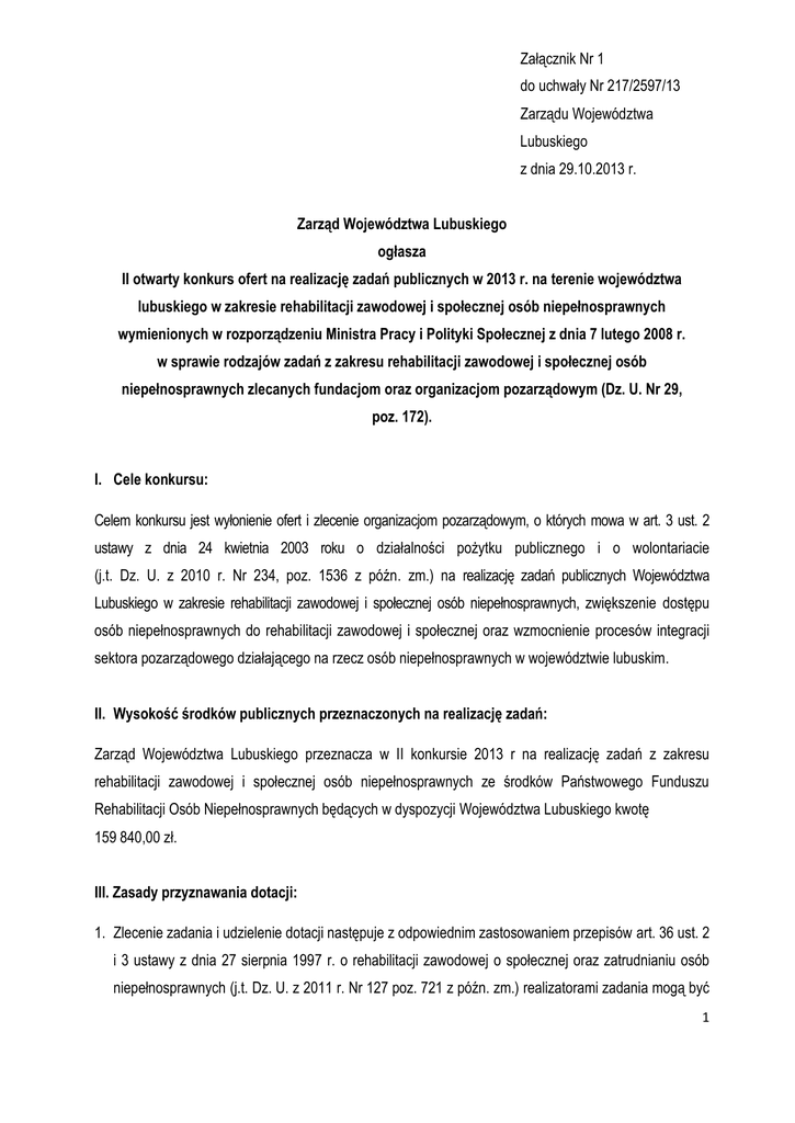 Załącznik Nr 1 do uchwały Nr 217/2597/13 Zarządu Województwa Lubuskiego z dnia 29.10.2013 r. Zarząd Województwa Lubuskiego ogłasza II otwarty konkurs ofert na realizację zadań publicznych w 2013 r. na terenie województwa lubuskiego w zakresie rehabilitacji zawodowej i społecznej osób niepełnosprawnych wymienionych w rozporządzeniu Ministra Pracy i Polityki Społecznej z dnia 7 lutego 2008 r. w sprawie rodzajów zadań z zakresu rehabilitacji zawodowej i społecznej osób niepełnosprawnych zlecanych fundacjom oraz organizacjom pozarządowym (Dz. U. Nr 29, poz. 172). I. Cele konkursu: Celem konkursu jest wyłonienie ofert i zlecenie organizacjom pozarządowym, o których mowa w art. 3 ust. 2 ustawy z dnia 24 kwietnia 2003 roku o działalności pożytku publicznego i o wolontariacie (j.t. Dz. U. z 2010 r. Nr 234, poz. 1536 z późn. zm.) na realizację zadań publicznych Województwa Lubuskiego w zakresie rehabilitacji zawodowej i społecznej osób niepełnosprawnych, zwiększenie dostępu osób niepełnosprawnych do rehabilitacji zawodowej i społecznej oraz wzmocnienie procesów integracji sektora pozarządowego działającego na rzecz osób niepełnosprawnych w województwie lubuskim. II. Wysokość środków publicznych przeznaczonych na realizację zadań: Zarząd Województwa Lubuskiego przeznacza w II konkursie 2013 r na realizację zadań z zakresu rehabilitacji zawodowej i społecznej osób niepełnosprawnych ze środków Państwowego Funduszu Rehabilitacji Osób Niepełnosprawnych będących w dyspozycji Województwa Lubuskiego kwotę 159 840,00 zł. III. Zasady przyznawania dotacji: 1. Zlecenie zadania i udzielenie dotacji następuje z odpowiednim zastosowaniem przepisów art. 36 ust. 2 i 3 ustawy z dnia 27 sierpnia 1997 r. o rehabilitacji zawodowej o społecznej oraz zatrudnianiu osób niepełnosprawnych (j.t. Dz. U. z 2011 r. Nr 127 poz. 721 z późn. zm.) realizatorami zadania mogą być 1 podmioty wymienione w art. 3 ust. 2 ustawy z dnia 24 kwietnia 2003 r. o działalności pożytku publicznego i o wolontariacie (j.t. Dz. U. 2010 Nr 234, poz. 1536 z późn. zm.) 2. Wysokość dotacji może być niższa niż wnioskowana w ofercie. W takim przypadku oferentowi przysługuje prawo negocjowania zmniejszenia zakresu rzeczowego zadania lub rezygnacja z jego realizacji. 3. W przypadku, o którym mowa w ust. 2, oferent zobowiązany jest dostarczyć zaktualizowany zakres rzeczowy i finansowy. 4. Zarząd Województwa Lubuskiego może odmówić podmiotowi wyłonionemu w konkursie przyznania dotacji i podpisania umowy w przypadku, gdy okaże się, iż rzeczywisty zakres realizowanego zadania znacząco odbiega od opisanego w ofercie, podmiot lub jego reprezentanci utracą zdolność do czynności prawnych, zostaną ujawnione nieznane wcześniej okoliczności podważające wiarygodność merytoryczną lub finansową oferenta. 5. Procedura udzielenia dotacji na realizację zadań publicznych będzie zgodna z : 1) uchwałą nr 215/2580/13 Zarządu Województwa Lubuskiego z dnia 15 października 2013 roku w sprawie ustalenia regulaminu postępowania w sprawach o udzielenie dotacji na realizację zadań publicznych Województwa Lubuskiego określonych w art. 4 ustawy z dnia 24 kwietnia 2003 roku o działalności pożytku publicznego i o wolontariacie, sposobu ich rozliczania oraz kontroli wykonywania zadań zleconych, 2) Programem współpracy Województwa Lubuskiego z organizacjami pozarządowymi w 2013 roku przyjętego uchwałą nr XXXII/32/12 Sejmiku Województwa Lubuskiego z dnia 19 listopada 2012 roku. IV. Termin i warunki realizacji zadania: 1. Konkurs obejmuje zadania, których zakończenie nastąpi nie później niż w dniu 31 grudnia 2013 roku. 2. Zadanie winno być zrealizowane z najwyższą starannością, zgodnie z zawartą umową oraz obowiązującymi standardami i przepisami w zakresie opisanym w ofercie. 3. Dotacja nie może być wykorzystana na: a) zobowiązania powstałe przed datą zawarcia umowy o udzielenie dotacji, b) zobowiązania powstałe po dacie zakończenia realizacji zadania zawartej w umowie o udzielenie dotacji i wydatki po dacie zakończenia zadania, 2 c) pokrycie kosztów statutowych nie związanych bezpośrednio z realizacją zadania. V. Termin i warunki składania ofert: 1. Oferty na realizację zadań publicznych należy składać na wzorze oferty określonej przez Ministra Pracy i Polityki Społecznej rozporządzeniem z dnia 15 grudnia 2010 roku w sprawie wzoru oferty i ramowego wzoru umowy dotyczących realizacji zadania publicznego oraz wzoru sprawozdania z wykonania tego zadania (Dz. U. z 2011 r. Nr 6 poz. 25). Wzór oferty dostępny jest w Biuletynie Informacji Publicznej Regionalnego Ośrodka Polityki Społecznej w Zielonej Górze - www.bip.wrota.lubuskie.pl/rops/ w zakładce organizacje pozarządowe – druki do pobrania oraz jako załącznik nr 1 do niniejszego ogłoszenia. 2. Oferty należy złożyć w terminie 21 dni (tj. do dnia 20.11.2013 r.) od dnia ukazania się ogłoszenia w Biuletynie Informacji Publicznej Regionalnego Ośrodka Polityki Społecznej w Zielonej Górze, na stronie internetowej Regionalnego Ośrodka Polityki Społecznej w Zielonej Górze - www.rops.lubuskie.pl oraz w siedzibie Regionalnego Ośrodka Polityki Społecznej w Zielonej Górze przy Al. Niepodległości 36. 3. Oferty należy składać w siedzibie Regionalnego Ośrodka Polityki Społecznej w Zielonej Górze przy Al. Niepodległości 36 (sekretariat pok. nr 10, I piętro) lub w sekretariacie Wydziału Zamiejscowego Urzędu Marszałkowskiego z siedzibą w Gorzowie Wlkp. przy ul. Łokietka 22, w zamkniętej kopercie z dopiskiem „Regionalny Ośrodek Polityki Społecznej w Zielonej Górze”. 4. O terminie złożenia oferty decyduje data stempla pocztowego, w przypadku ofert wysłanych pocztą, data wpływu do Regionalnego Ośrodka Polityki Społecznej w Zielonej Górze lub do Wydziału Zamiejscowego Urzędu Marszałkowskiego z siedzibą w Gorzowie Wlkp., w prz