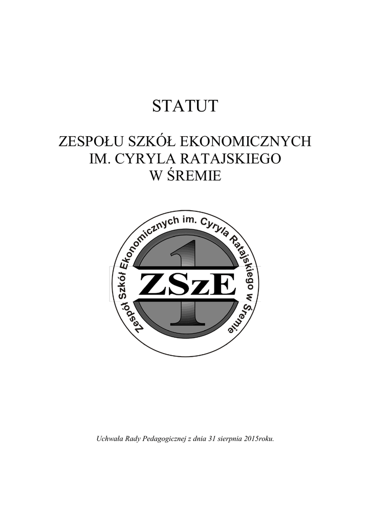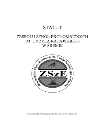 STATUT ZESPOŁU SZKÓŁ EKONOMICZNYCH IM. CYRYLA RATAJSKIEGO W ŚREMIE Uchwała Rady Pedagogicznej z dnia 31 sierpnia 2015roku. Rozdział 1 POSTANOWIENIA OGÓLNE § 1. Nazwa zespołu: Zespół Szkół Ekonomicznych im. Cyryla Ratajskiego w Śremie. Siedziba zespołu: ul. Wybickiego 2, 63-100 Śrem. Organem prowadzącym zespół jest powiat śremski. Organem sprawującym nadzór pedagogiczny jest Kuratorium Oświaty w Poznaniu. Nazwy szkół wchodzących w skład zespołu: 1) Zespół Szkół Ekonomicznych im. Cyryla Ratajskiego w Śremie Technikum nr 1 im. Cyryla Ratajskiego w Śremie, 2) Zespół Szkół Ekonomicznych im. Cyryla Ratajskiego w Śremie Zasadnicza Szkoła Zawodowa nr 1 im. Cyryla Ratajskiego w Śremie, 3) Zespół Szkół Ekonomicznych im. Cyryla Ratajskiego w Śremie I Liceum Ogólnokształcące dla Dorosłych w Śremie, 4) (uchylony) 5) Zespół Szkół Ekonomicznych im. Cyryla Ratajskiego w Śremie Szkoła Policealna dla Dorosłych im. Cyryla Ratajskiego w Śremie. 6. Czteroletnie technikum umożliwia uzyskanie świadectwa dojrzałości po zdaniu egzaminu maturalnego oraz dyplomu potwierdzającego kwalifikacje w zawodach: technik ekonomista, technik informatyk, technik spedytor, technik logistyk, technik handlowiec po zdaniu egzaminu potwierdzającego kwalifikacje w zawodzie. 7. Szkoła zawodowa umożliwia uzyskanie dyplomu potwierdzającego kwalifikacje w zawodzie sprzedawca po zdaniu egzaminu potwierdzającego kwalifikacje w zawodzie. 8. (uchylony) 9. I Liceum Ogólnokształcące dla Dorosłych posiada odrębny statut. 10. Szkoła Policealna dla Dorosłych im. Cyryla Ratajskiego w Śremie posiada odrębny statut. 11. W kolejnych latach mogą powstać inne kierunki kształcenia, po pozytywnym zaopiniowaniu wniosku Dyrektora szkoły przez Radę Powiatu Śremskiego i Wojewódzką Radę Zatrudnienia. 12. Ilekroć mowa w statucie o szkole mamy na myśli Zespół Szkół Ekonomicznych im. Cyryla Ratajskiego w Śremie. 1. 2. 3. 4. 5. Rozdział 2 CELE I ZADANIA SZKOŁY § 2. 1. Szkoła realizuje cele i zadania, które zostały określone w ustawie o systemie oświaty oraz w przepisach wydanych na jej podstawie, a także wynikające ze Szkolnego Programu Wychowawczego oraz Szkolnego Programu Profilaktyki: 1) stworzenie warunków do wszechstronnego rozwoju ucznia, rozwijania zainteresowań, uzdolnień i aspiracji, 2) umożliwienie zdobycia wiedzy i umiejętności niezbędnych do uzyskania wykształcenia na poziomie szkoły ponadgimnazjalnej, 3) dostosowanie treści, metod organizacji nauczania do możliwości psychofizycznych uczniów i ich potrzeb, 4) utrzymanie bezpiecznych i higienicznych warunków nauki, wychowania i opieki, 5) umożliwienie pełnego rozwoju uczniów w warunkach poszanowania ich godności osobistej, wolności światopoglądowej i wyznaniowej, 6) kształtowanie postaw warunkujących sprawne i odpowiedzialne funkcjonowanie we współczesnym świecie, a także rozwijanie cech osobowości: przedsiębiorczość, kreatywność, samodzielność, potrzeba samokształcenia i doskonalenia się, 7) kształtowanie postaw patriotycznych, poszanowania wartości kultury narodowej i poczucia przynależności do społeczności lokalnej, 8) pomoc psychologiczno-pedagogiczną, dydaktyczną oraz wsparcie w trudnych sytuacjach życiowych, 9) dostosowanie kierunków kształcenia do wymagań lokalnego rynku pracy. 2. Szkoła wykonuje zadania poprzez: 1) realizację szkolnego zestawu programów nauczania, 2) wyposażenie szkoły w pomoce dydaktyczne i sprzęt umożliwiający realizację zadań dydaktycznych, 3) zapewnienie uczniom opieki przez nauczycieli w trakcie zajęć lekcyjnych (w przypadku nieobecności nauczyciela organizowane są zastępstwa), 4) zapewnienie uczniom bezpieczeństwa przez objęcie budynku systemem monitoringu wizyjnego oraz pełnienie dyżurów nauczycielskich zgodnie z planem dyżurów i regulaminem obowiązującym nauczyciela dyżurnego, 5) utrzymanie kontaktu z domem rodzinnym, 6) umożliwienie korzystania z bazy szkoły (sale lekcyjne, sala gimnastyczna, pracownie przedmiotowe, biblioteka, punkt małej gastronomii) pod opieką nauczyciela lub osoby uprawnionej do opieki, 7) organizowanie nauczania indywidualnego dla uczniów posiadających skierowanie na taki tryb nauczania, 8) zapewnienie opieki przez nauczycieli podczas wycieczek dydaktycznych i imprez szkolnych, 9) organizowanie pomocy psychologiczno-pedagogicznej stosownie do potrzeb uczniów i zgodnie z odrębnymi przepisami. § 3. 1. W szkole organizuje się pomoc psychologiczno-pedagogiczną skierowaną do uczniów o specjalnych potrzebach edukacyjnych, rodziców oraz nauczycieli, która polega na: 1) diagnozowaniu środowiska ucznia, 2) rozpoznawaniu możliwości oraz indywidualnych potrzeb ucznia i umożliwieniu ich zaspokojenia, 3) rozpoznawaniu przyczyn trudności w zakresie opanowania wiedzy i umiejętności, 4) wspieraniu uczniów szczególnie uzdolnionych, 5) opracowaniu i wdrażaniu indywidualnych programów edukacyjno-terapeutycznych, 6) prowadzeniu edukacji prozdrowotnej wśród uczniów i rodziców, 7) wspieraniu uczniów w dokonywaniu wyboru i planowaniu dalszej ścieżki edukacyjnej i zawodowej, 8) wspieraniu rodziców i nauczycieli w rozwiązywaniu problemów wychowawczych i edukacyjnych, oraz rozwijaniu ich umiejętności wychowawczych, 9) udzielaniu nauczycielom pomocy w dostosowaniu wymagań edukacyjnych wynikających z realizacji programów nauczania do indywidualnych potrzeb psychofizycznych i edukacyjnych ucznia, 10) umożliwianiu rozwijania kompetencji wychowawczych nauczycieli i rodziców, 11) podejmowaniu działań mediacyjnych lub interwencyjnych w sytuacjach kryzysowych. 2. Pomoc psychologiczno-pedagogiczna realizowana jest we współpracy z rodzicami uczniów, poradniami psychologiczno-pedagogicznymi, placówkami doskonalenia nauczycieli, innymi szkołami i placówkami, organizacjami pozarządowymi oraz instytucjami działającymi na rzecz rodziny, dzieci i młodzieży.