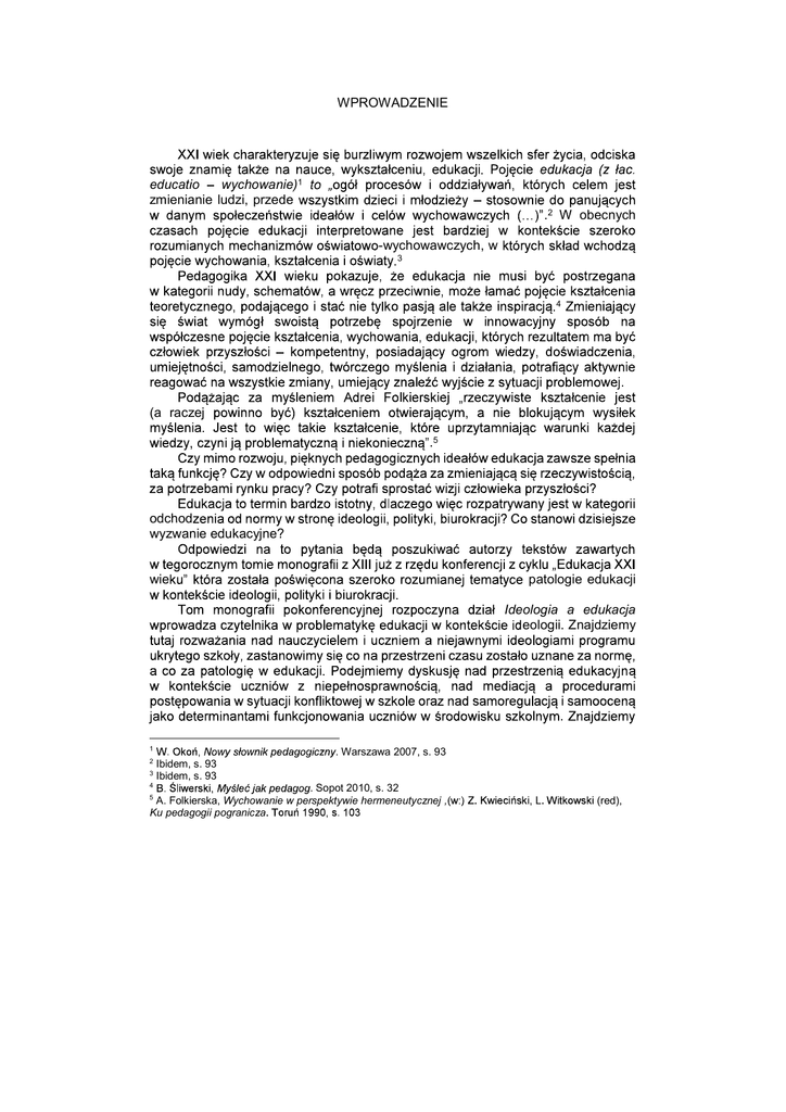 11 _____________________________________________________________________________________ WPROWADZENIE educatio wychowanie)1 zmienianie ludzi, przede .2 W obecnych -wychowawczych, w 3 4 (a raczej .5 odchod wyzwanie edukacyjne? wie patologie edukacji Ideologia a edukacja eologii. Znajdziemy 1 2 3 4 . Warszawa 2007, s. 93 Ibidem, s. 93 Ibidem, s. 93 . Sopot 2010, s. 32 A. Folkierska, Wychowanie w perspektywie hermeneutycznej , Ku pedagogii pogranicza 5 (red), 12 _____________________________________________________________________________________ - i nauczyci i inicjacji seksualnej. Wyzwaniem edukacyjnym XXI wieku korzystania z cyberprzestrzeni. niom patologii edukacji .6 Szczeg prof. dr hab. Barbary Sitarskiej oraz prof. zw. dr hab. Kazimierza Natasza STARIK Andrzej ZDUNIAK 6 I. Conti di Mauro, . Warszawa 2005, s. 14