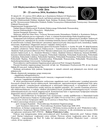 LII Międzynarodowe Sympozjum Maszyn Elektrycznych SME 2016 20 – 22 czerwca 2016, Kazimierz Dolny W dniach 20 - 22 czerwca 2016 odbyło się w Kazimierzu Dolnym LII Międzynarodowe Sympozjum Maszyn Elektrycznych, nad którym patronat sprawowali: Komitet Elektrotechniki Polskiej Akademii Nauk, Dziekan Wydziału Elektrycznego PW, Stowarzyszenie Elektryków Polskich, Polskie Towarzystwo Elektrotechniki Teoretycznej i Stosowanej (Oddział Warszawski). Organizatorami Sympozjum byli: Zakład Maszyn Elektrycznych Wydziału Elektrycznego Politechniki Warszawskiej, Instytut Elektrotechniki w Warszawie - Międzylesie, Instytut Energetyki Warszawa - Mory. Miejscem obrad był Dom Pracy Twórczej Stowarzyszenia Dziennikarzy Polskich w Kazimierzu Dolnym. Siedziba SDP położona jest na wzgórzach, w lesie, w centrum Kazimierskiego Parku Krajobrazowego. Sympozjum było kolejnym spotkaniem naukowców z krajowych oraz zagranicznych ośrodków naukowych i przemysłowych, zajmujących się szeroko rozumianą tematyką maszyn elektrycznych. Celem Sympozjum było umożliwienie wymiany doświadczeń i prezentacji najnowszych prac dotyczących teorii, konstrukcji, badań, sterowania, eksploatacji i diagnostyki maszyn i napędów elektrycznych. Opiekę merytoryczną nad Sympozjum sprawował Komitet Naukowy w liczbie 50 osób. W skład Komitetu wchodzili członkowie Sekcji Maszyn Elektrycznych i Transformatorów Komitetu Elektrotechniki Polskiej Akademii Nauk pod przewodnictwem Prof. Mariana Łukaniszyna oraz przedstawiciele krajowych uczelni i instytutów badawczych, m. in., Akademii Morskiej w Gdyni, Akademii Górniczo-Hutniczej, Instytutu KOMEL, Instytutu Elektrotechniki, Instytutu Energetyki, Politechniki Gdańskiej, Politechniki Krakowskiej, Politechniki Lubelskiej, Politechniki Łódzkiej, Politechniki Opolskiej, Politechniki Poznańskiej, Politechniki Rzeszowskiej, Politechniki Śląskiej, Politechniki Świętokrzyskiej, Politechniki Warszawskiej, Politechniki Wrocławskiej, Zachodniopomorskiego Uniwersytetu Technologicznego. Przewodnictwo nad Komitetem Organizacyjnym sprawował Prof. Grzegorz Kamiński. Pracami Komitetu organizacyjnego kierowali: dr hab. inż. Włodzimierz Przyborowski PW, dr inż. Konrad Dąbała IEl oraz prof. Andrzej Bytnar IEn. Dyskusje prowadzone były podczas Sympozjum w ramach czterech sesji plenarnych oraz dwóch sesji plakatowych. Obrady obejmowały następujące grupy tematyczne: - zagadnienia turbogeneratorowe, - problematyka maszyn synchronicznych i maszyny z magnesami trwałymi, - maszyny i zagadnienia specjalne. W sferze prezentowanych problemów zreferowano zagadnienia teorii, modelowania i symulacji procesów fizycznych różnych klas maszyn elektrycznych. Interesującymi, zaprezentowanymi zagadnieniami były opisy zjawisk cieplnych i wentylacyjnych zachodzących w maszynach elektrycznych, w szczególności w jednostkach dużych mocy. Przedstawione zostały maszyny do napędów pojazdów, ale i szeroko rozumiane przetworniki elektromechaniczne, w rodzaju: silników piezoelektrycznych, przekładni elektromagnetycznych, wyrzutni elektrodynamicznych oraz łożysk magnetycznych. Kontynuowana była w tegorocznym Sympozjum tematyka diagnostyki maszyn elektrycznych i układów je zasilających. Referaty zakwalifikowane na Sympozjum były recenzowane i zostały opublikowane w Materiałach konferencyjnych Wydawnictwa Naukowo-Technicznego IEl (ISBN 978-83-61956-39-6, e-IsBN 978-83-61956-40-2). Uroczyste otwarcie Sympozjum odbyło się 20 czerwca w Domu Pracy Twórczej SDP. W trakcie uroczystego otwarcia wystąpili: prof. Grzegorz Kamiński – Przewodniczący Komitetem Organizacyjnego i prof. Kazimierz Zakrzewski – Przewodniczący Komitetu Naukowego SME 2016. Stwierdzono, że bieżące sympozjum jest związane z 100-letnią rocznicą urodzin śp. prof. Władysława Latka pomysłodawcy Sympozjum Maszyn Elektrycznych. Należy zaznaczyć, że dla uświetnienia tej rocznicy 2016 rok ogłoszony został przez SEP i PTETiS – Rokiem Władysława Latka. Podczas sesji inauguracyjnej, której przewodniczyli prof. Kazimierz Zakrzewski, prof. Tadeusz Glinka i prof. Marian Łukaniszyn: wygłoszono cztery referaty. Pierwszy referat, wygłoszony przez doc. dr inż. Wojciecha – wspominający śp. Prof. W. Latka- był zatytułowany „Profesor Władysław Latek – człowiek i dzieło, 60 lat współpracy”. 9 Kolejne referaty zaprezentowane przez profesorów Roman Kroka i Jana Zawilaka dotyczyły maszyn synchronicznych, które przynależały do sfery zainteresowań profesora W. Latka. Sesję inauguracyjną zakończył referat profesora Zdzisława Życkiego zatytułowany – „ Moje wspomnienie o profesorze Władysławie Latku”. Pierwszy dzień Sympozjum zakończył się spotkaniem towarzyskim uczestników sympozjum na plenerowym ognisku w aurze przeróżnych melodii przy akompaniamencie akordeonu. W drugim dniu sympozjum odbyła się msza święta w kościele Zwiastowania Najświętszej Marii Panny przy klasztorze Reformatorów o. Franciszkanów. Msza święta była odprawiona w intencji zmarłych profesorów i pracowników Zakładu Maszyn Elektrycznych Politechnik Warszawskiej oraz profesorów innych ośrodków akademickich, którzy byli uczestnikami w okresie 52 Sympozjów Maszyn Elektrycznych. W tym dniu przed południem obyły się: Sesja plenarna A1, której przewodniczyli prof. M. Pasko i prof. T. Sobczyk – wygłoszono 4 referaty. Sesja plenarna B1, której przewodniczyli prof. T. Glinka i prof. prof. L. Nowak – wygłoszono 5 referatów. Sesja plenarna A2, której przewodniczyli prof. K. Zakrzewski i prof. M. Łukaniszyn – wygłoszono 3 referaty Sesja plenarna B2, której przewodniczyli prof. C. Kowalski i prof. B. Tomczuk – wygłoszono 4 referaty. Sesja plakatowa PS1, której przewodniczyli prof. M. Ronkowski, prof. P. Staszewski i prof. G. Kamiński zaprezentowano 12 referatów. Po południu w tym dniu odbyły się kolejne sesje: Sesja plenarna A3, której przewodniczyli